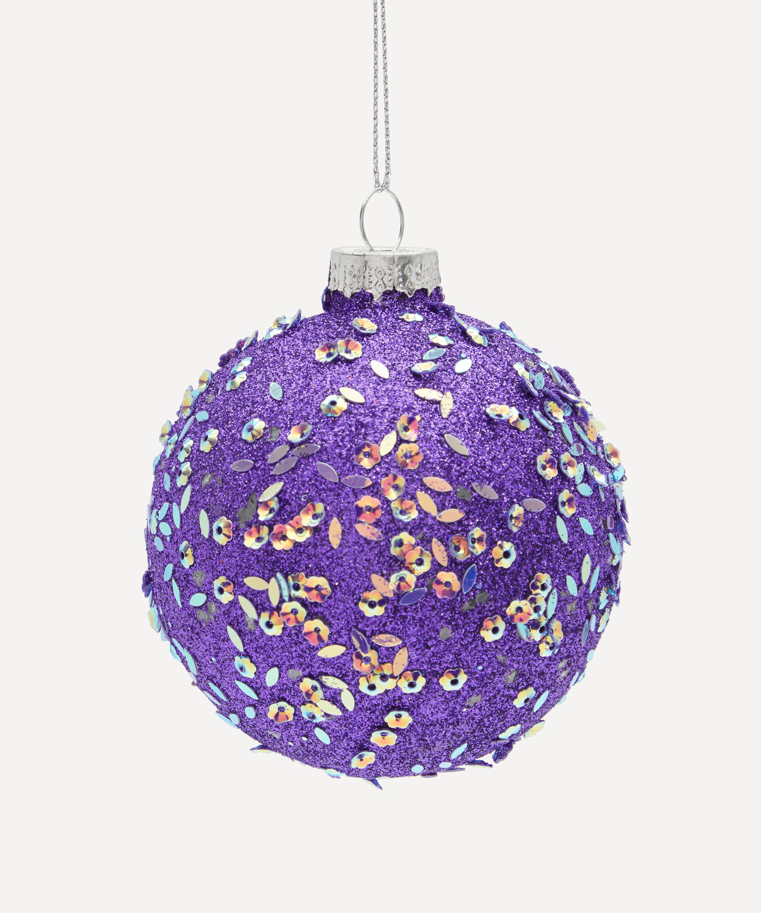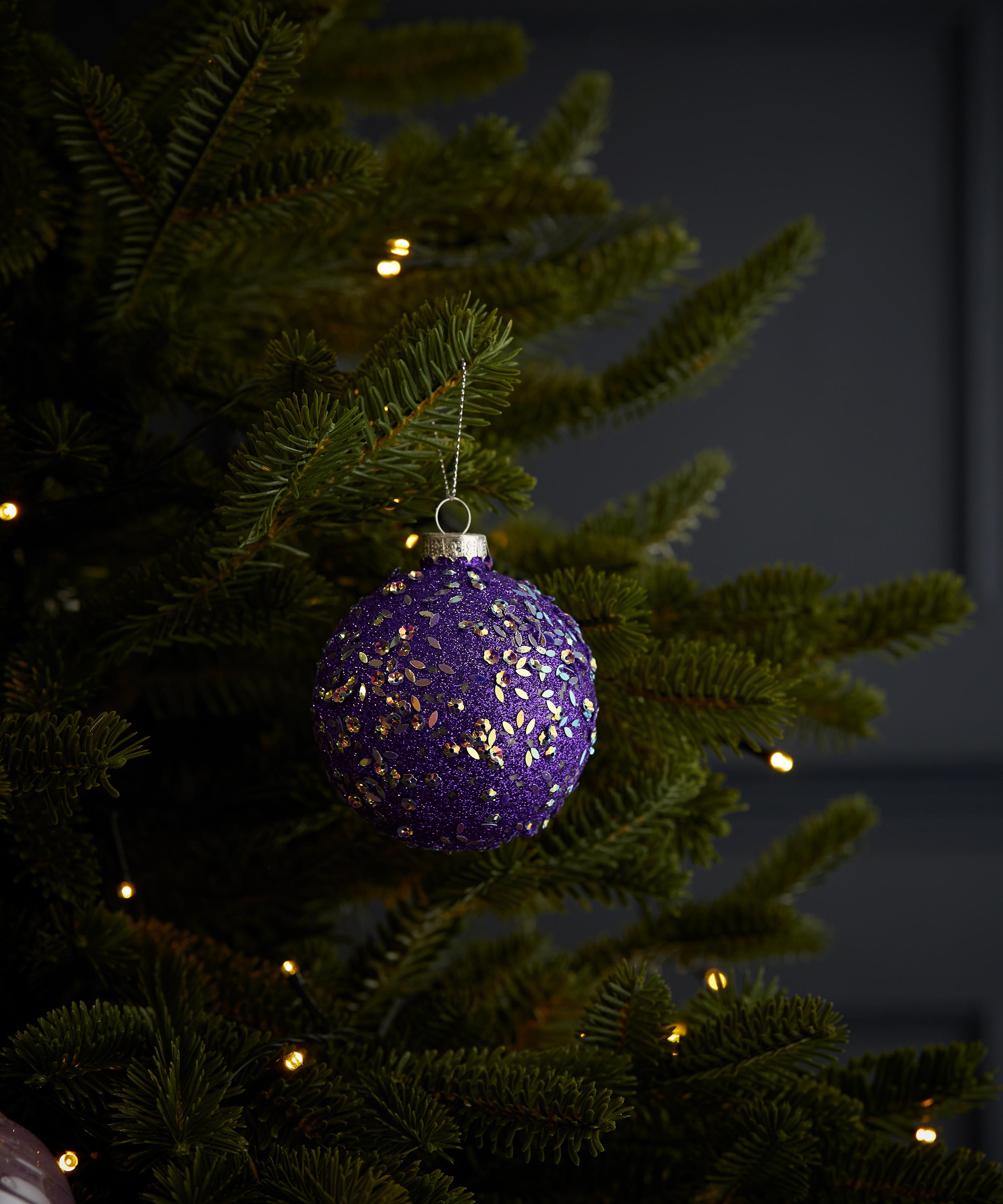 Deck out your tree with a touch of whimsy and bring the magic of the season to life with this bauble. An alternative to traditional decorations, it’s exquisitely crafted from glass with a petrol effect, featuring a purple colourway and sequin detailing - a luxuriously embellished option for those seeking a treasured heirloom piece, use to bring a pop of colour to your festive display.