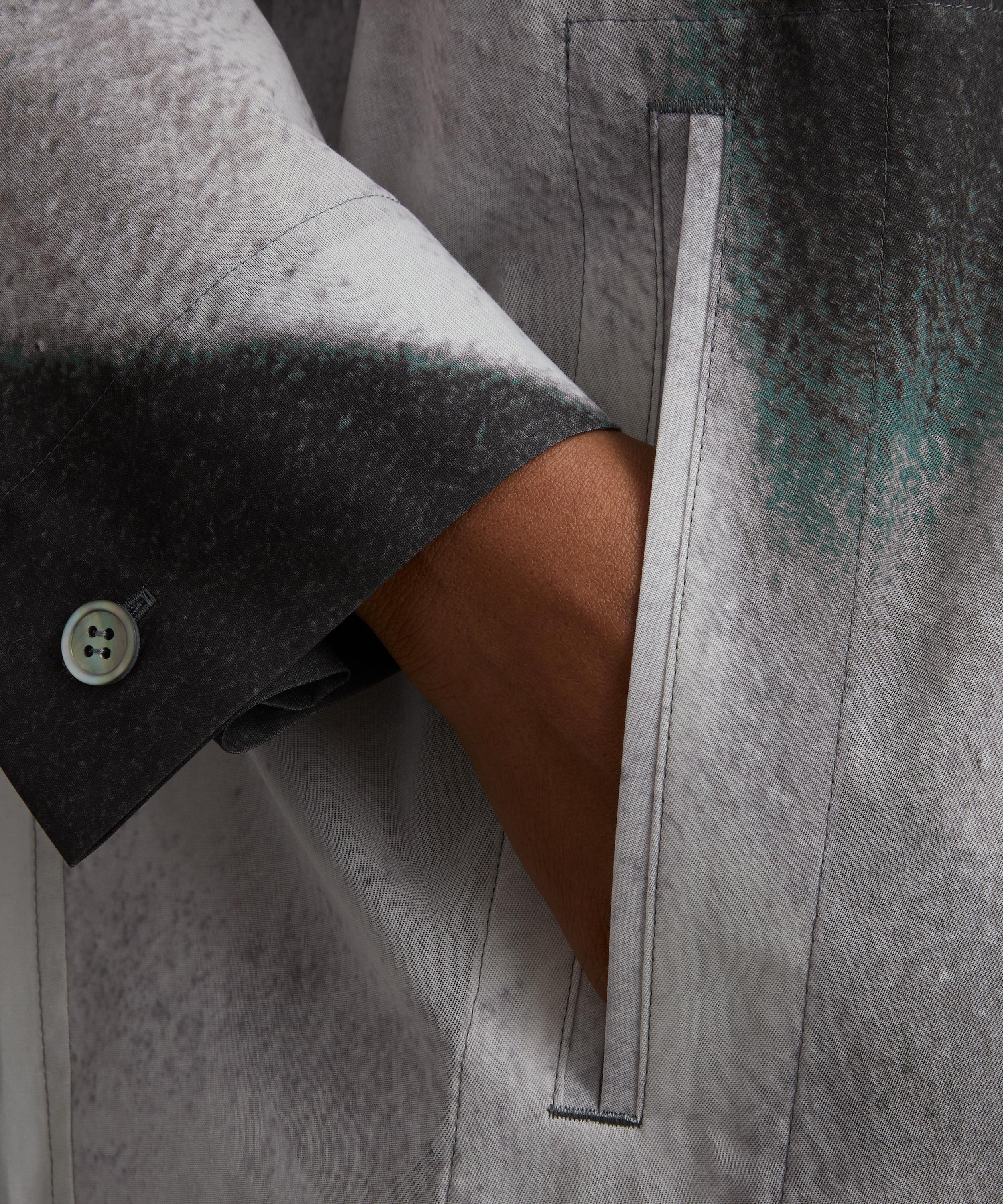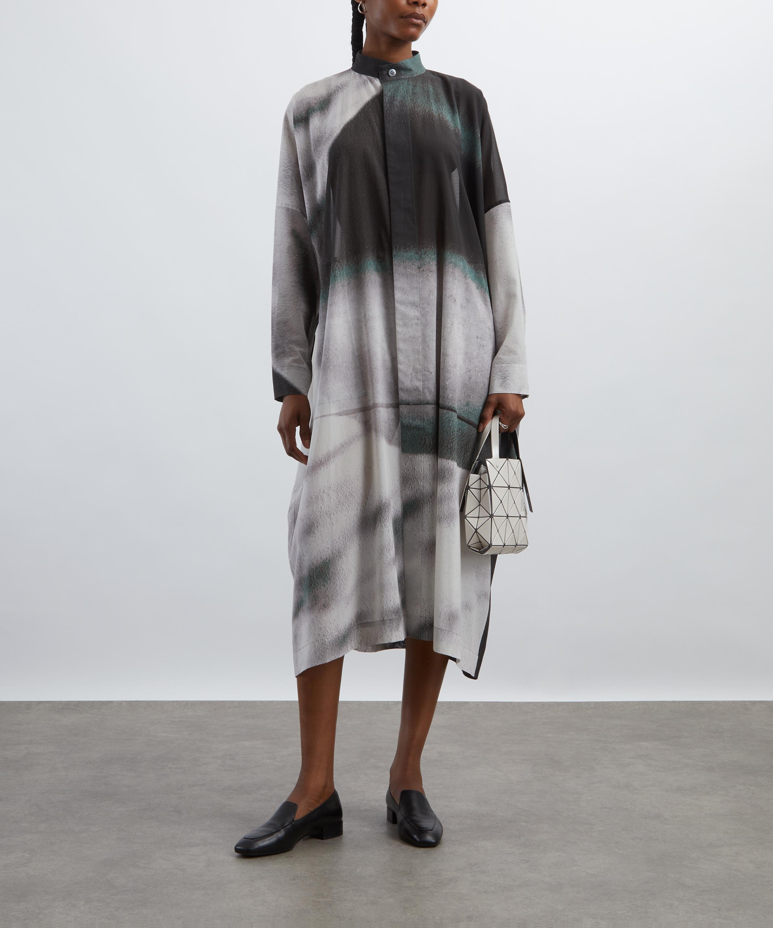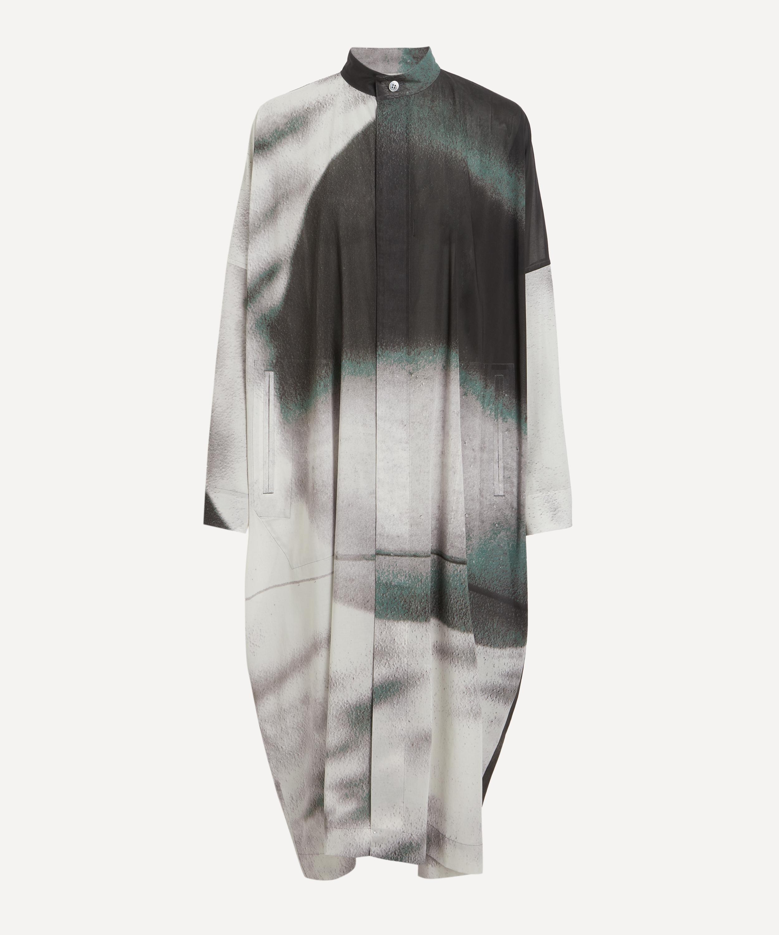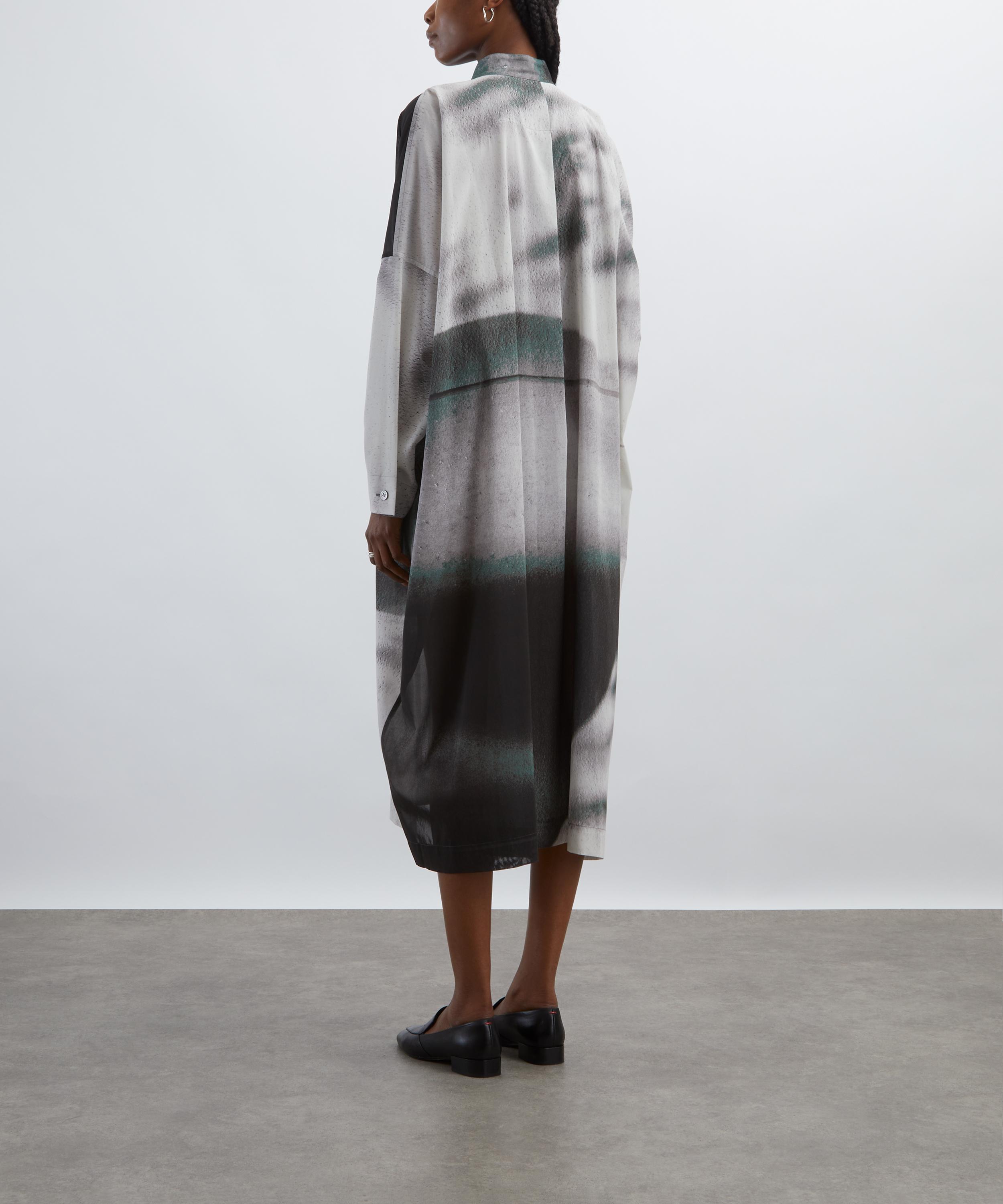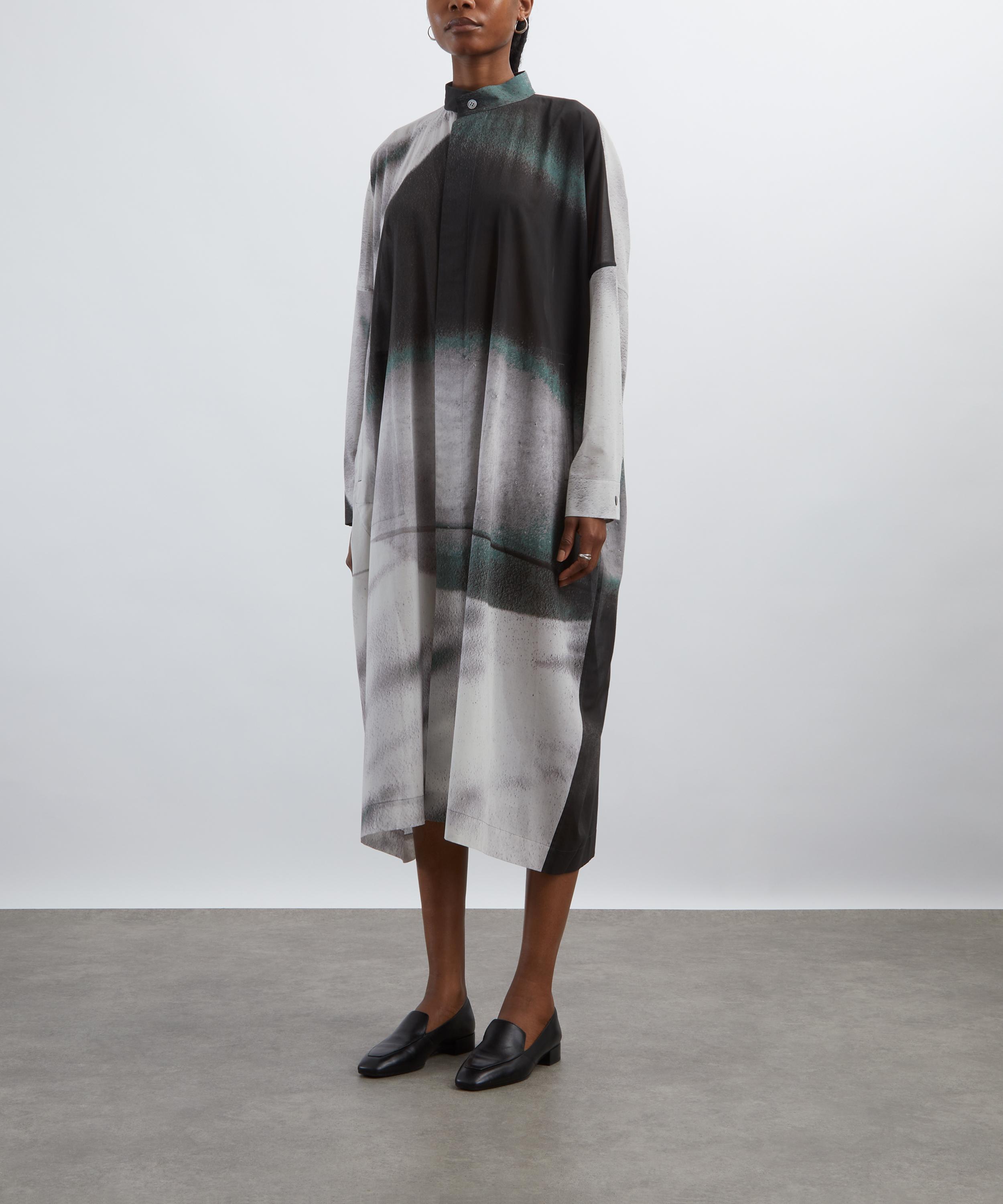 Part of the SHADOW STUDY collection - a series defined by striking patterns of overlapping black-and-white photographs of everyday objects - this shirt dress is crafted from sheer, stretchy cotton for a smooth touch and lightweight feel. Designed with a short stand collar, button fastenings, and long dolman sleeves, it offers a refined yet comfortable silhouette that radiates effortless sophistication.