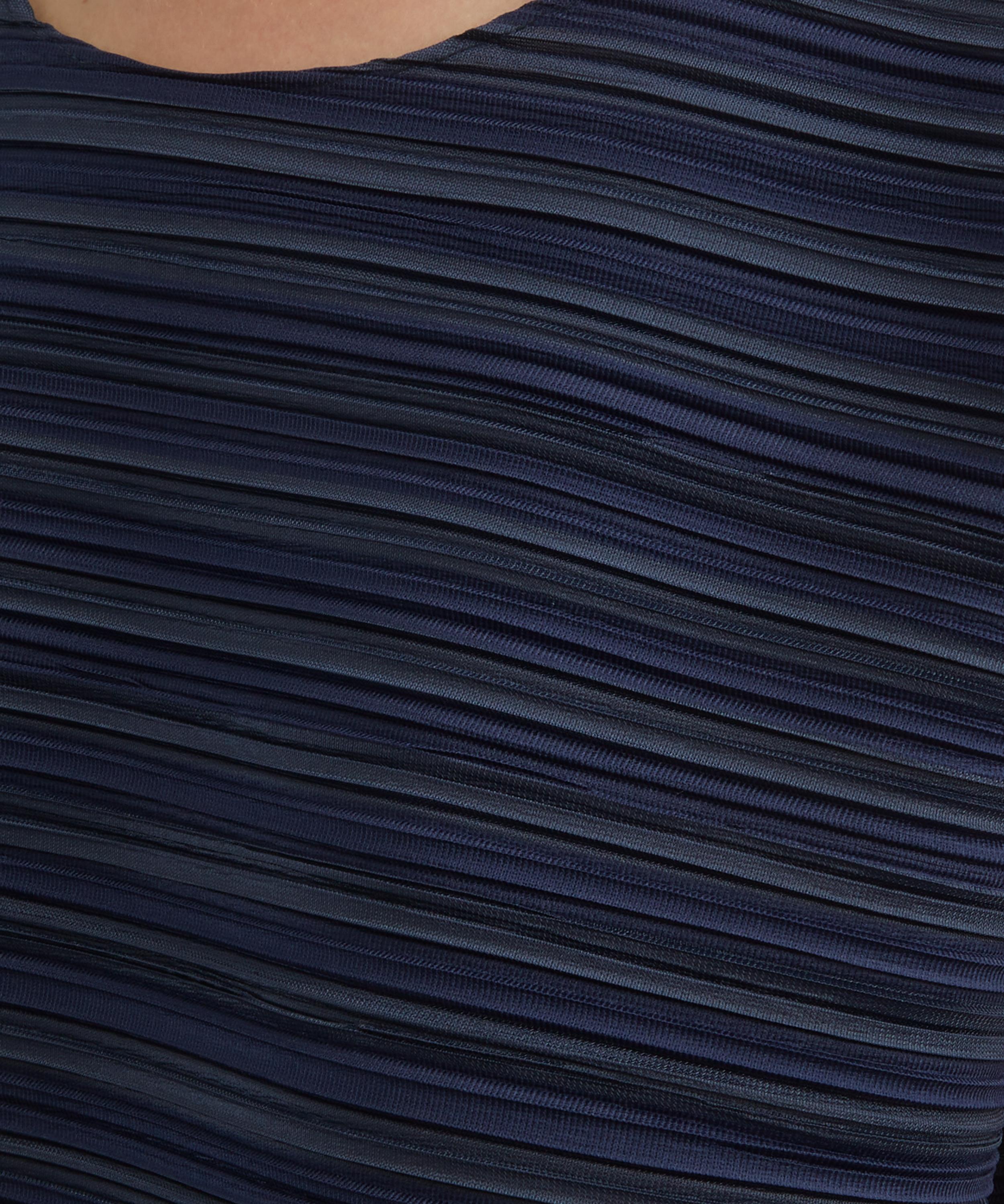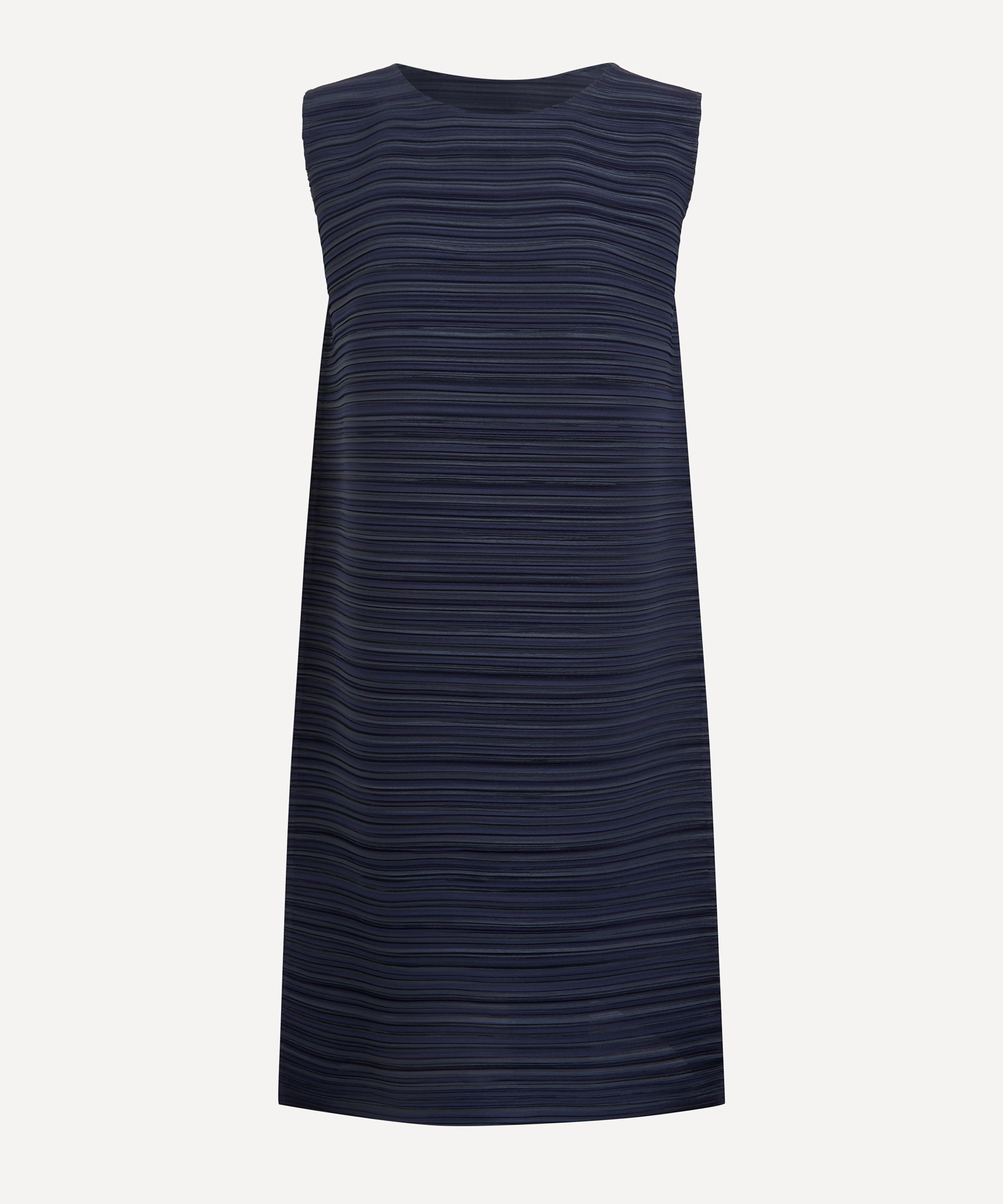 The SHEER BOUNCE collection offers horizontally pleated styles in heavier-weight fabric with a semi-gloss finish. This sleeveless shift dress has a voluminous silhouette complete with an elegant scoop neckline.
