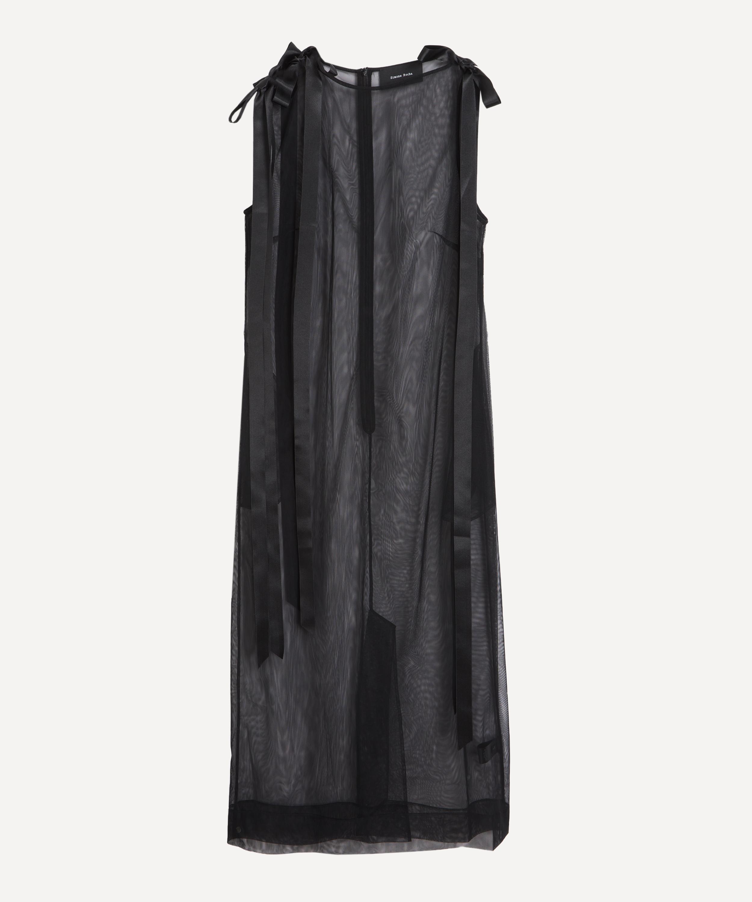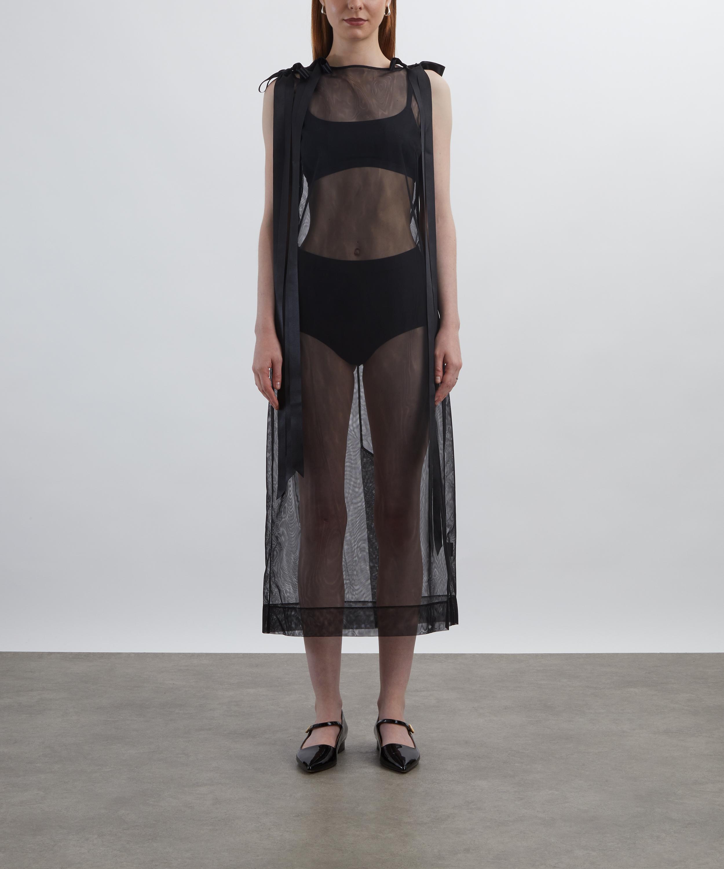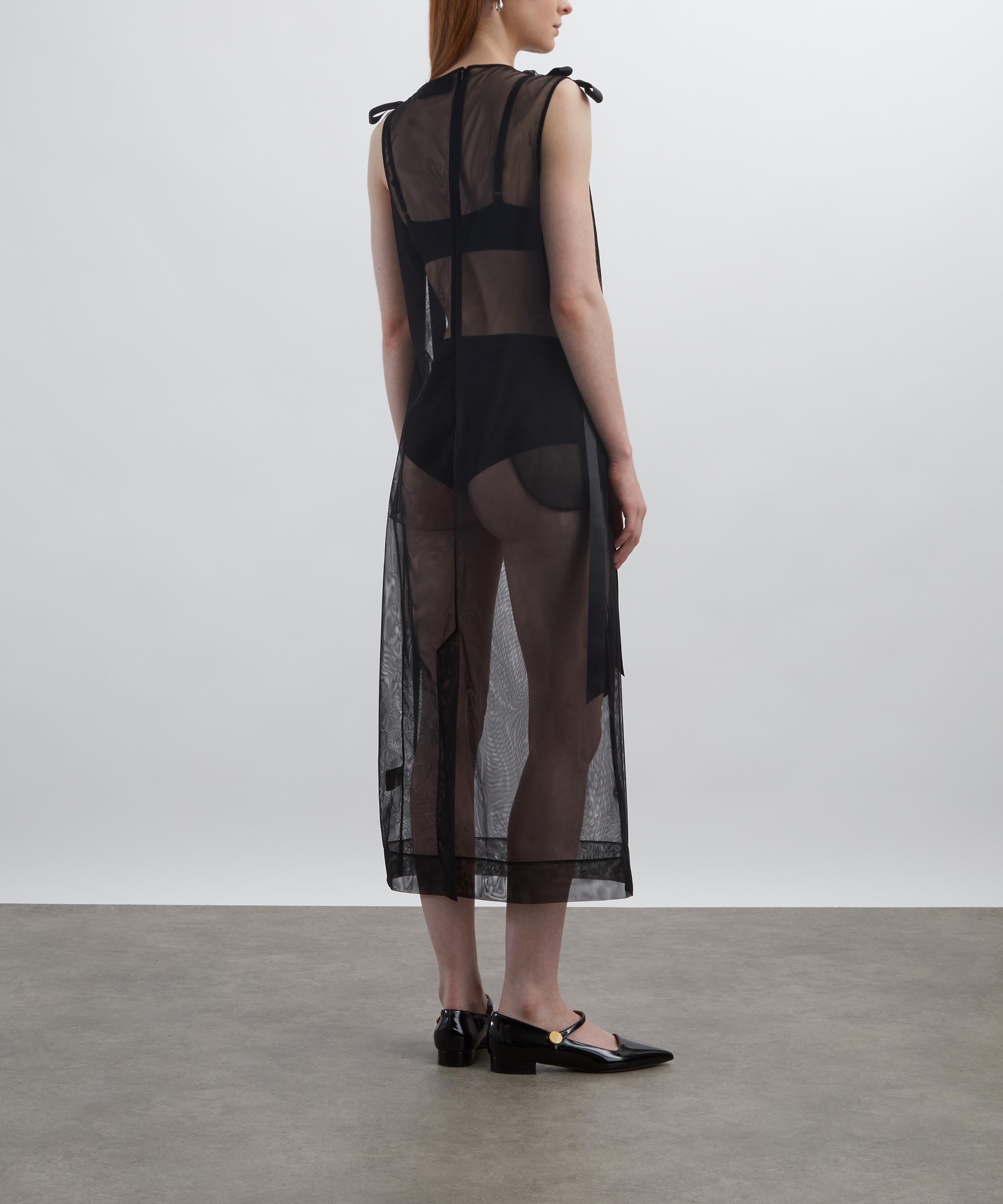 Crafted from delicate, sheer tulle, this transparent midi dress is accented with black ribbon bows at the shoulder for a touch of romantic elegance.