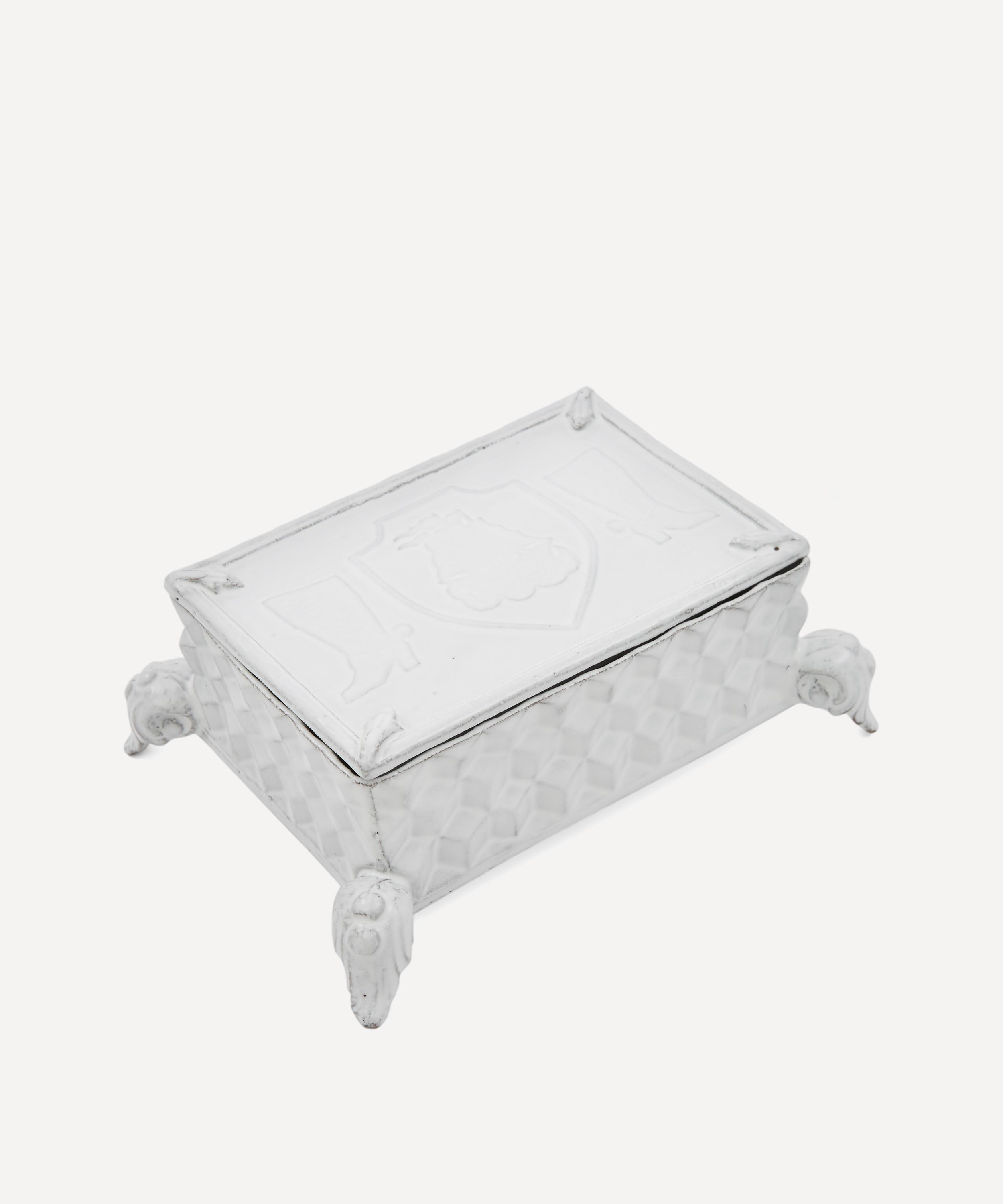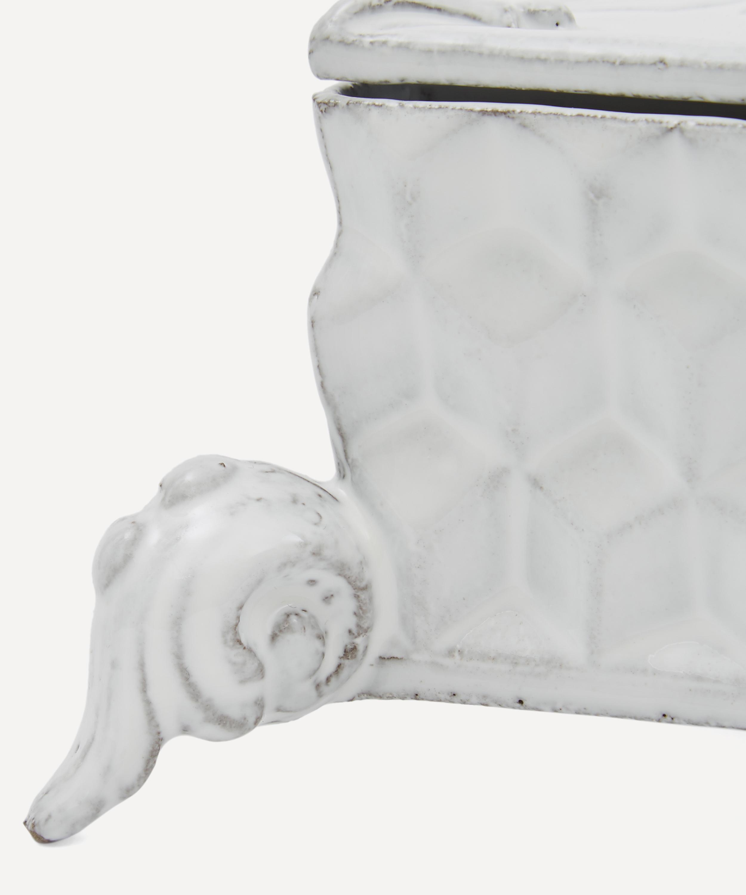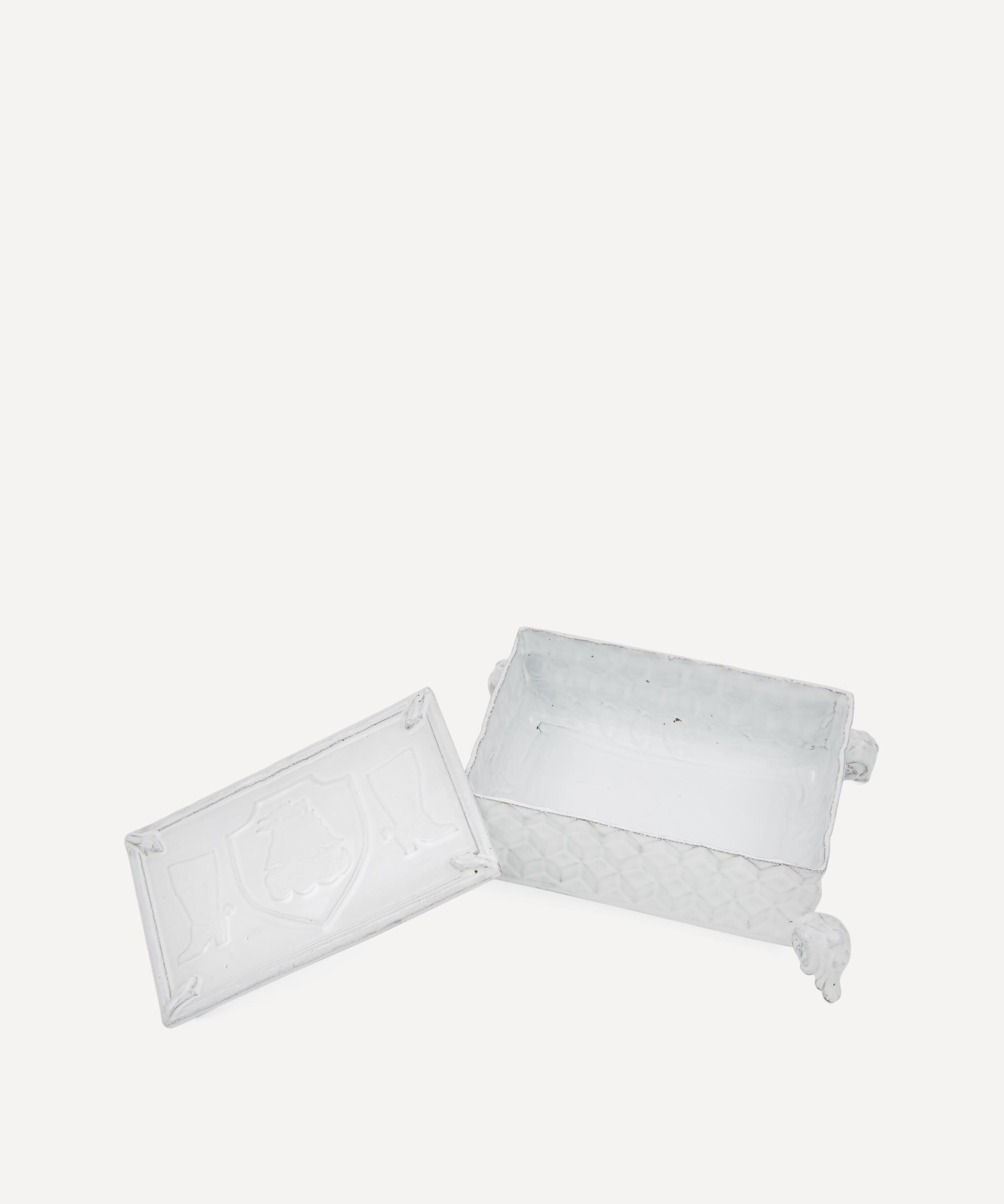 Votary of pre-industrial fabrication, Astier de Villatte is celebrated for being the one and only studio in Paris to hold and harbour the traditions of artisanal ceramic production. Restoring the ancestral systems of moulding and stamping, this box is made using techniques from the Middle Ages which involve moulding a sheet of handmade clay, double firing the ‘biscuit’ piece and glazing the product in white enamel – a lengthy process that requires a drying time of up to one month. Characterised by its geometric cubed edges and decorative shield detailing on the lid, the box is engraved with the brand’s signature crest – depicting an interlacing A & V – alongside the initials of one of the 40 master artisans who created it. Each handmade piece tells a beautiful story, romancing and imparting a sense of nostalgia into its owner. Display it with additional ceramic pieces from the collection to breathe an air of authenticity into your table setting.