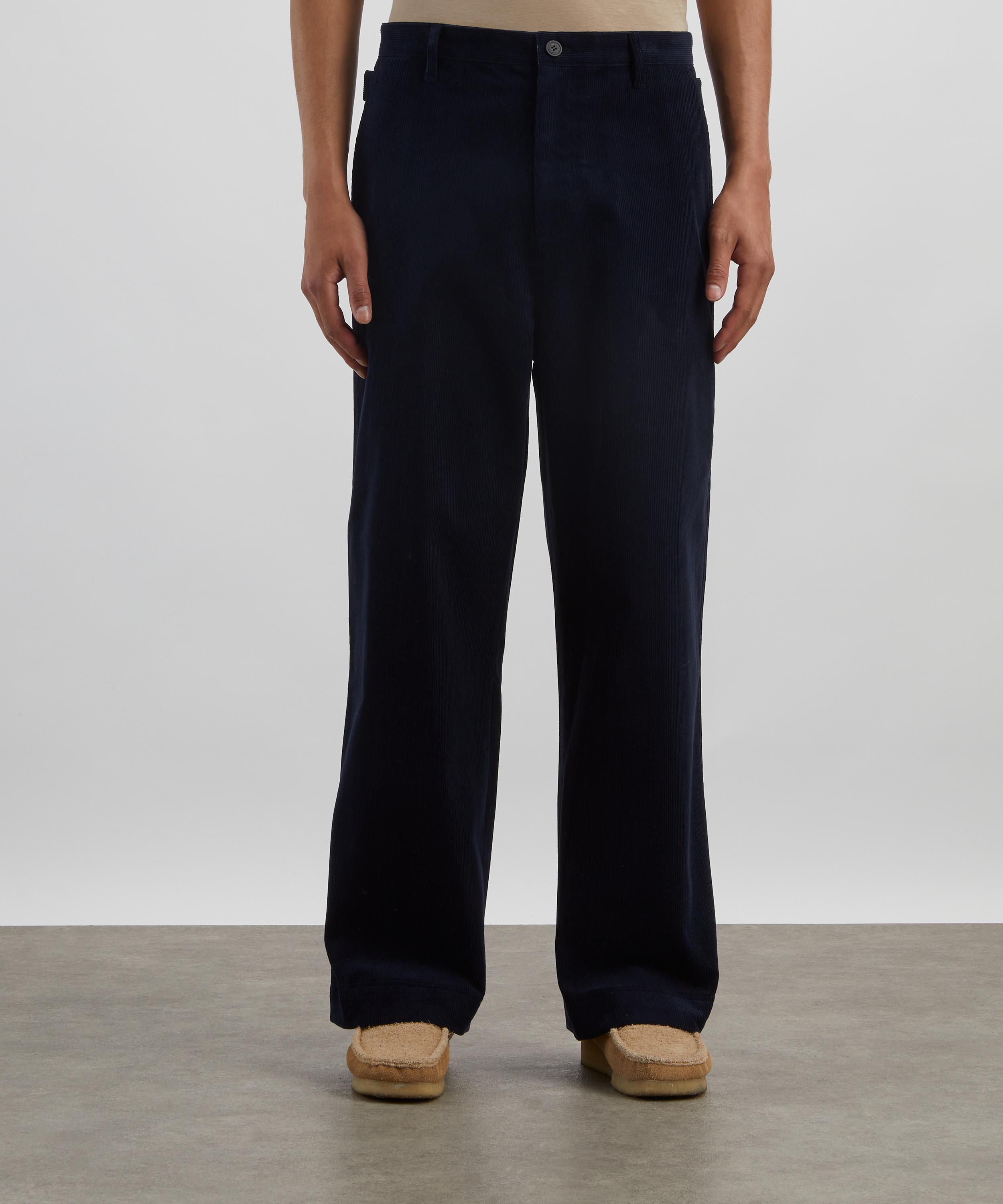Crafted from velvety-smooth cotton corduroy, these navy trousers merge everyday ease with thoughtful detailing. The loose, wide-leg cut brings a relaxed silhouette, while the buttoned side tabs elevate the design with a subtle nod to tailoring.