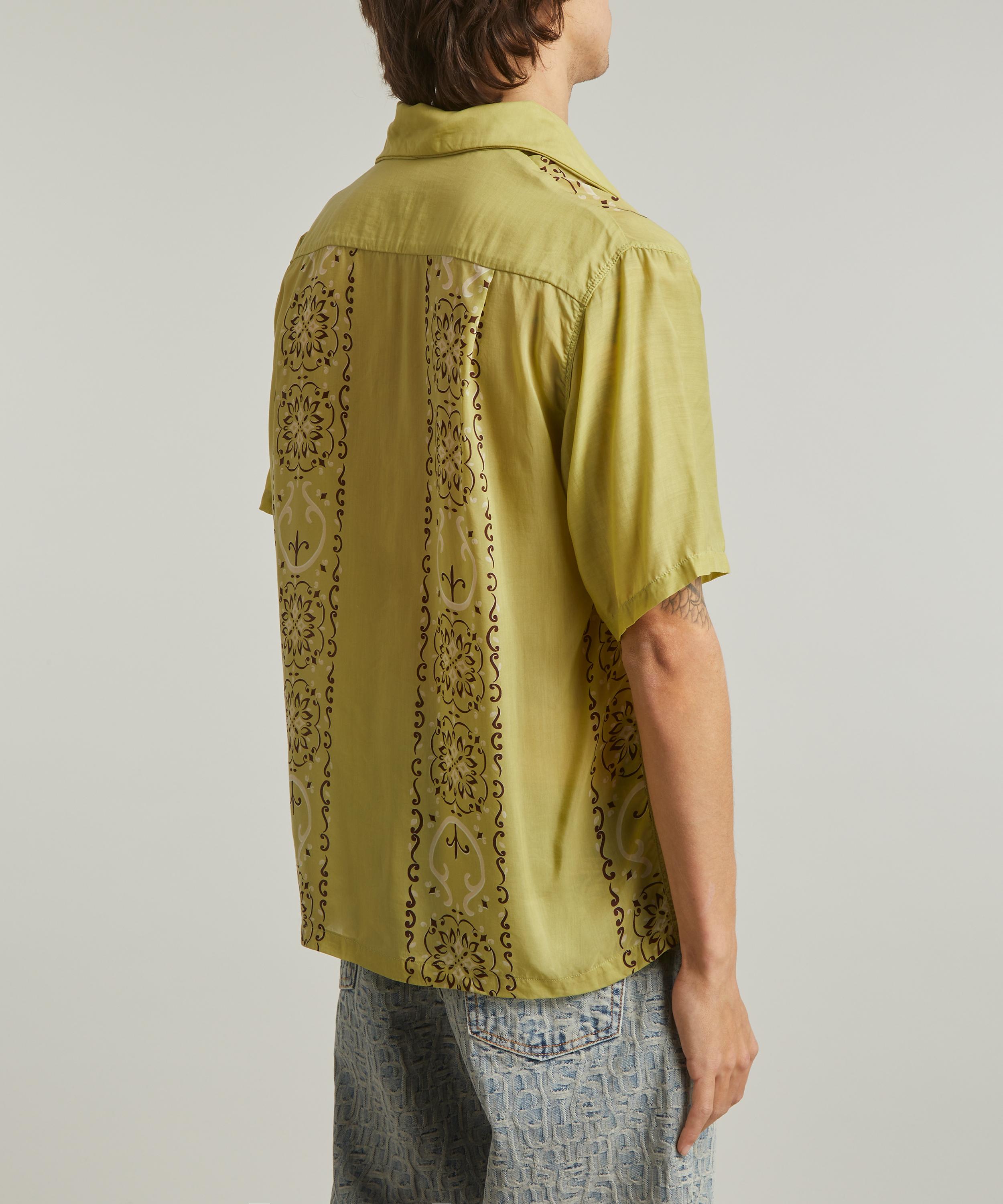 Fusing experimental design with cutting-edge production techniques, this classic Cuban shirt is crafted from a silky-smooth rayon fabric showcasing a detailed pattern inspired by Native American ‘Naja’ jewellery. A relaxed fit with short sleeves, it’s secured with coconut buttons, and features an exaggerated camp collar, and two patch pockets below the waist.