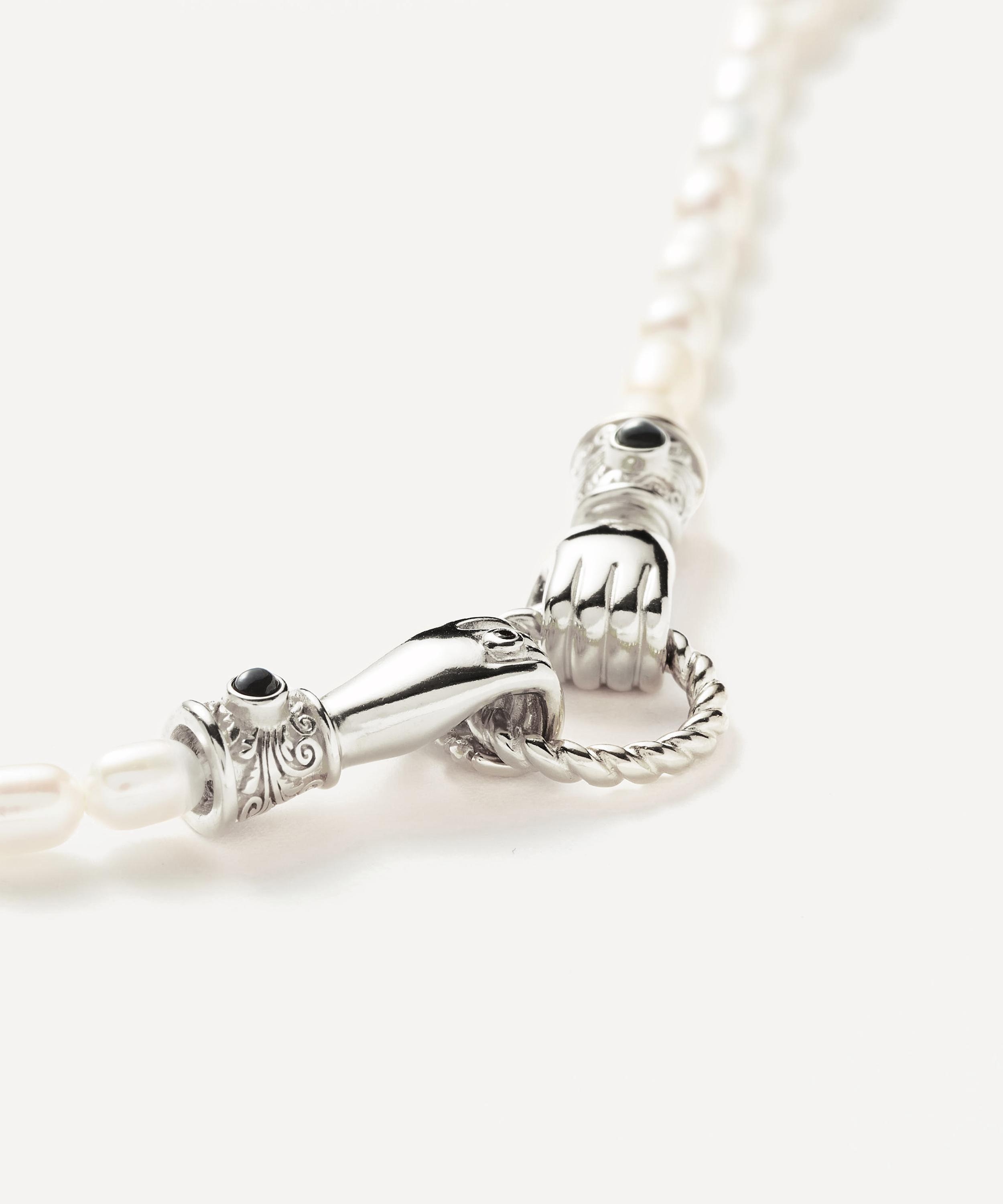 Embrace your individuality with the In Good Hands bracelet from the Harris Reed x Missoma collaboration collection. Crafted from silver-plated brass, it features an opulent string of white seed pearls, accented by two Georgian-inspired hands, each holding a twisted ring and detailed with a black onyx set cuff. Wear it alone or with other edgy bracelets for a curation that speaks to your unique sense of style.