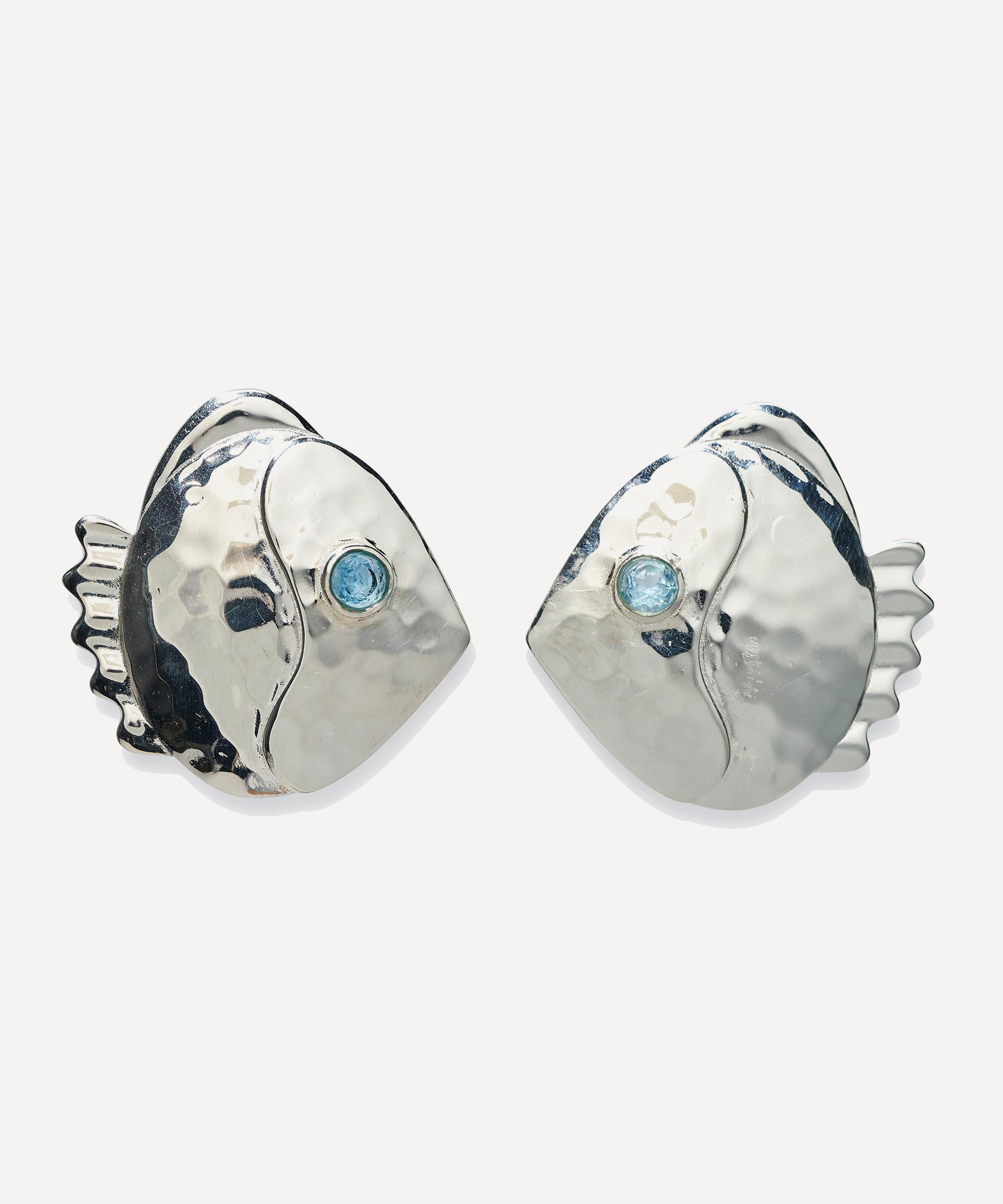 The label’s exquisite craftsmanship is evident in each fish-shaped stud, made from silver-plated brass with a hammered effect surface and artfully accented with a single topaz stone representing each eye for a captivating aesthetic. Ideal for both special occasions and everyday dressing, style alone or pair with other studs and hoops to create a unique layered look.