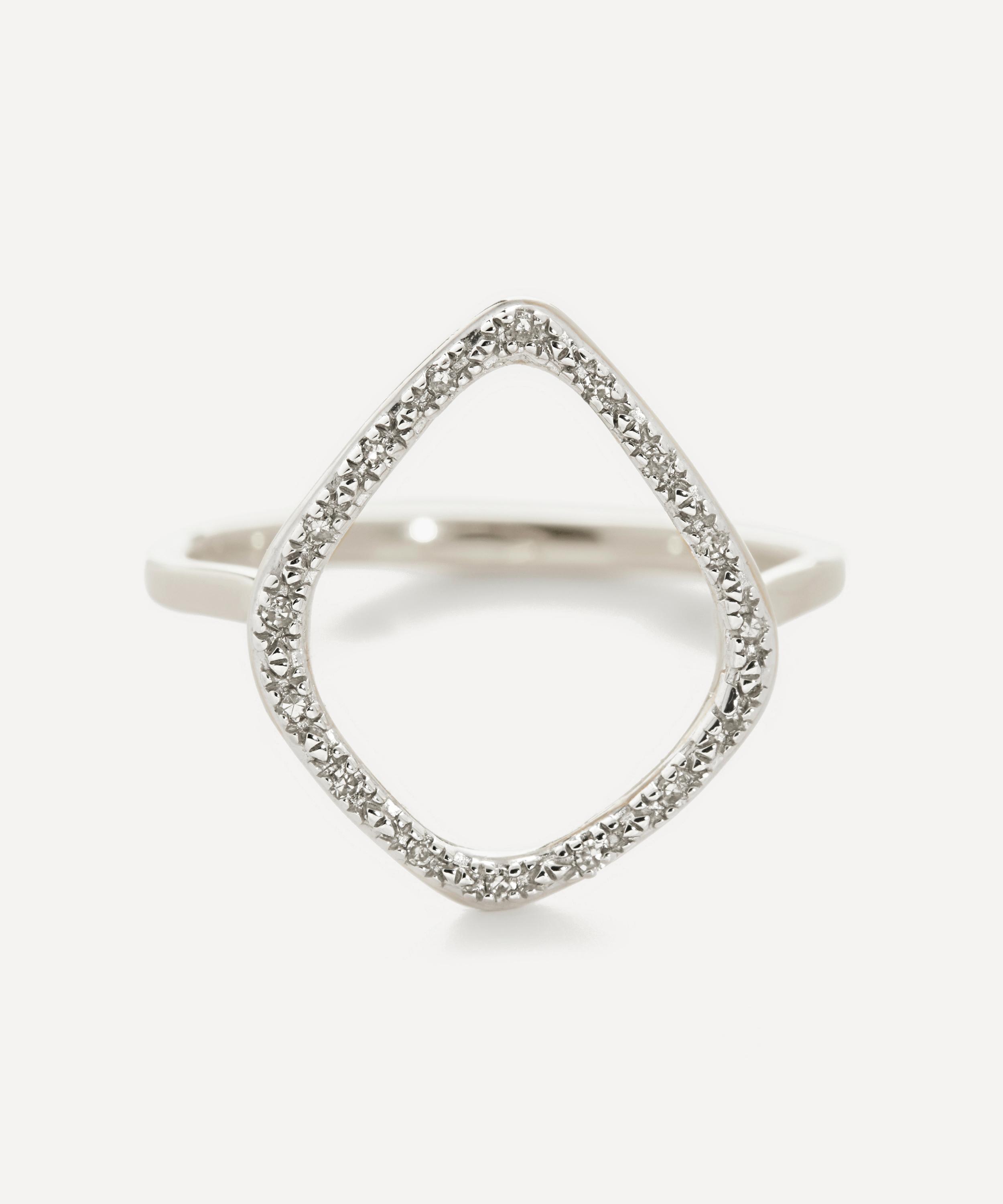 Presented on a slim, polished band, this ring features a large open hoop with a glittering white diamond pavé and a subtly irregular silhouette that epitomises the organic aesthetic of the collection. Perfect for both day and night dressing, it styles beautifully as a stand-alone piece or layered with one of the brand's mini kite or circle rings for a striking, contemporary approach.