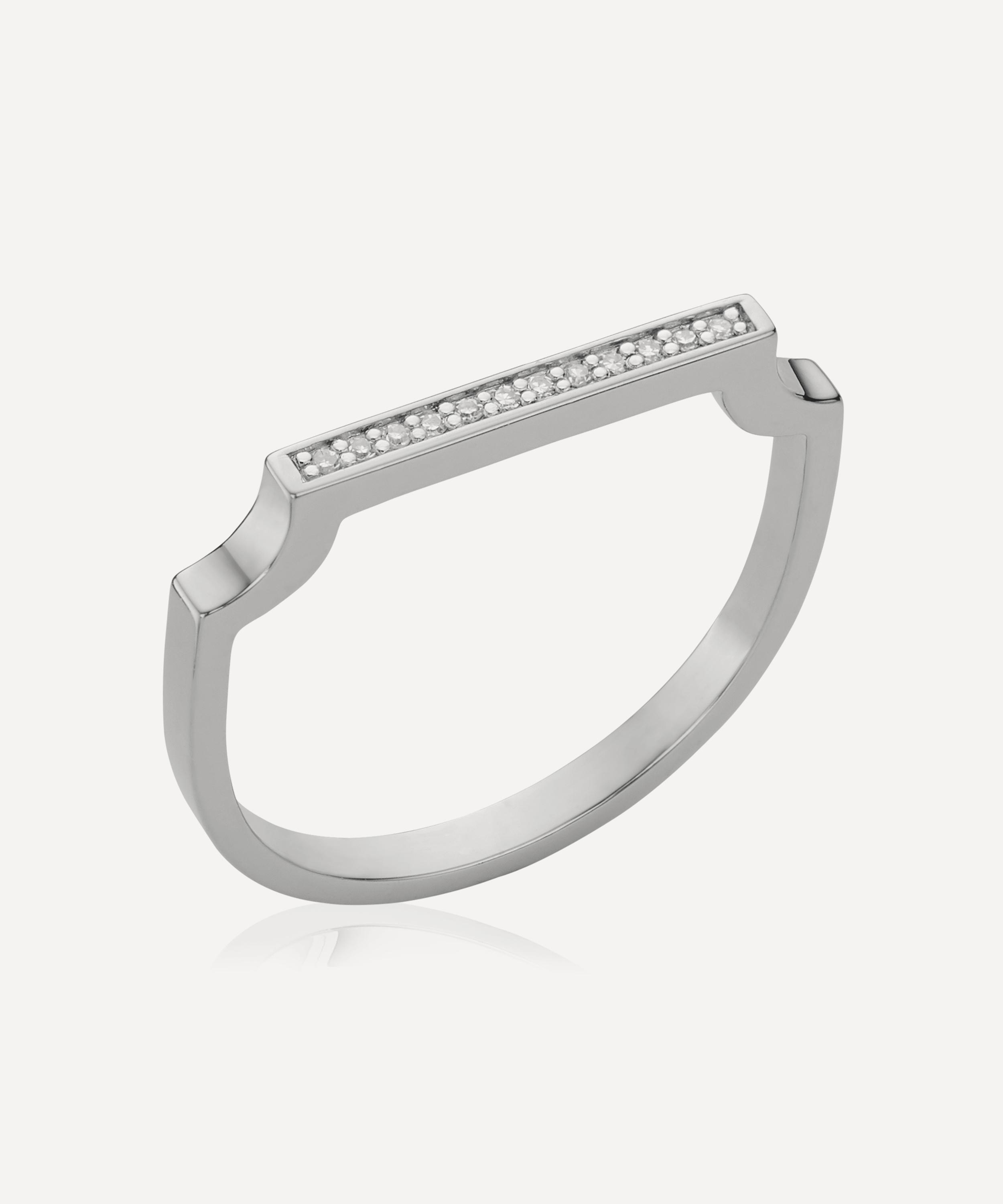 Combining strong clean lines with flowing curves, each piece in Monica Vinader's Signature collection is brimming with modernity and femininity. Crafted from polished sterling silver, this slim ring showcases an elegantly curved design, finished with a pavé white diamond-encrusted bar and inverted corners. Wear it alone as an everyday statement piece or style it as part of a careful curation of glittering bands.