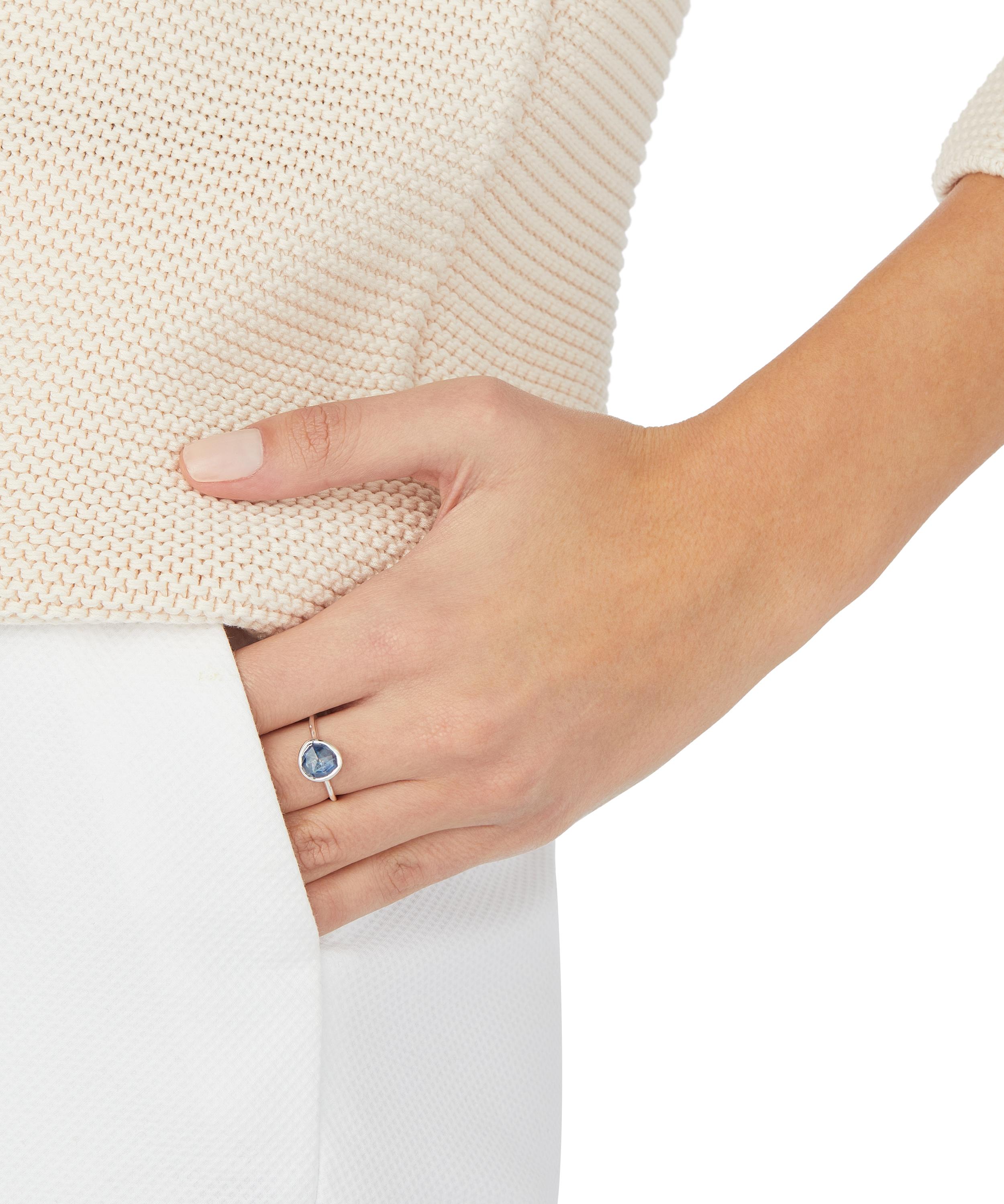This ring showcases a vibrant, rose cut kyanite in a polished bezel setting. Designed specifically for stacking, the stone's slightly raised setting allows for additional rings to nestle beneath it, while a subtly waved band adds an organic finish, reminiscent of the sea. Style it solo or pair it with other gleaming gem-encrusted bands from the collection and beyond for a custom, contemporary finish.