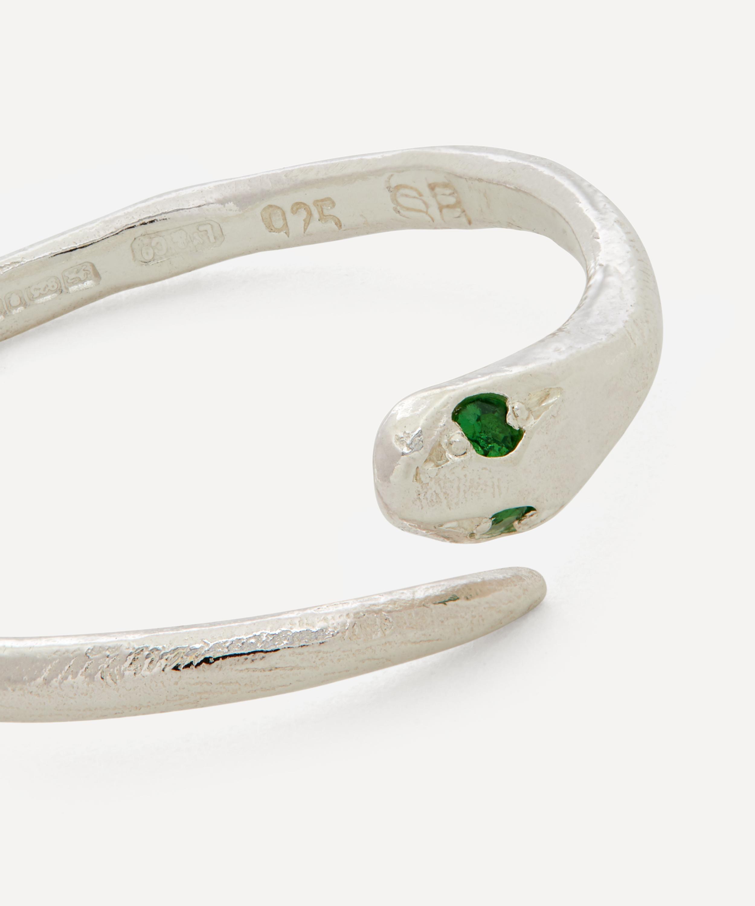 Handmade in Melbourne from sterling silver, this ring is characterised by a sculptural serpent silhouette that wraps elegantly around the finger, complete with subtle textured detailing and glittering tsavorite garnet eyes. The designer’s experimental design process means every piece is unique - often varying in colour, shape and texture for an organic finish that's perfect for injecting a burst of individuality into your everyday jewellery line-up.