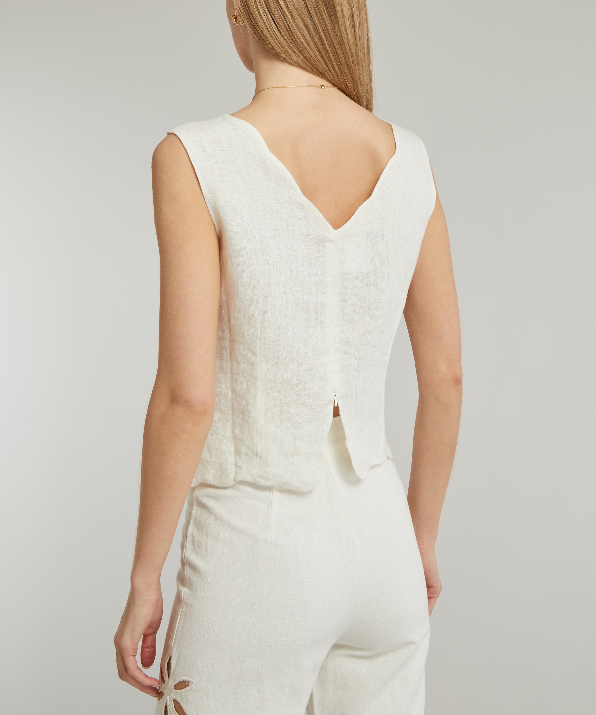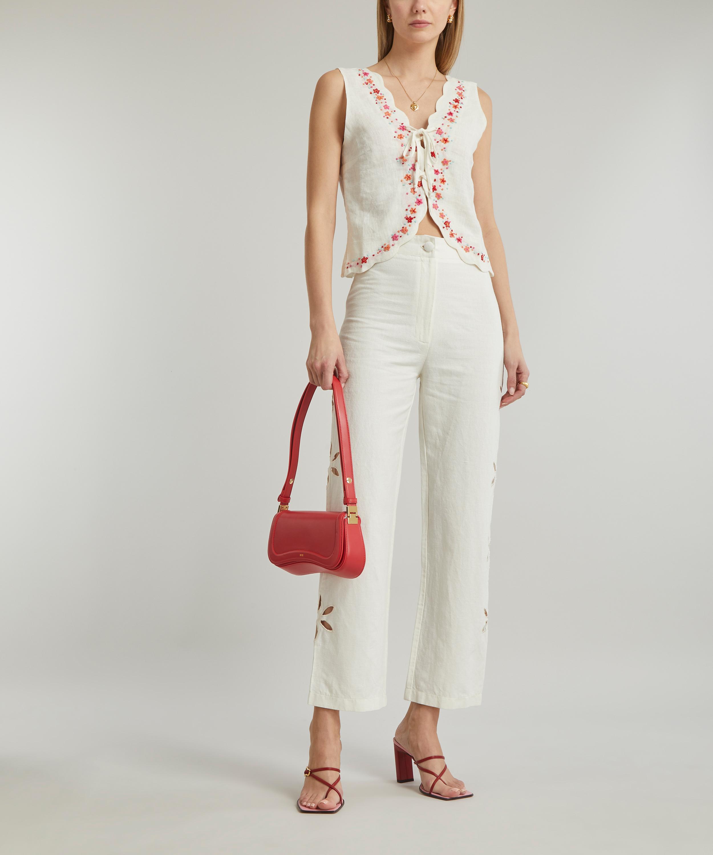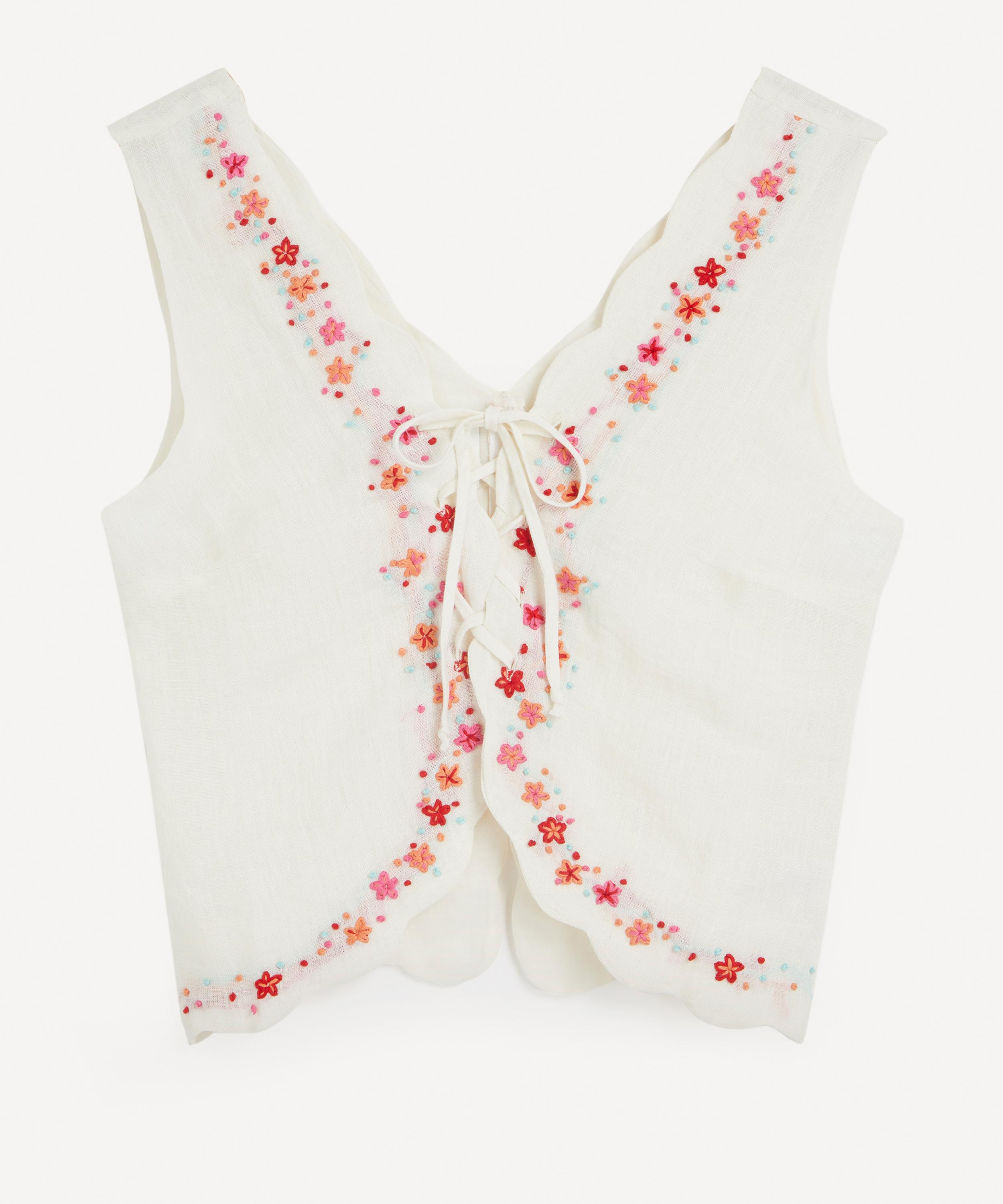 The Simone top from Tach Clothing takes inspiration from vintage knitwear with its intricate, floral embroidery. Featuring scallop edging throughout, this cream camisole displays an elegant V-neckline and a lace-up closure at the front.