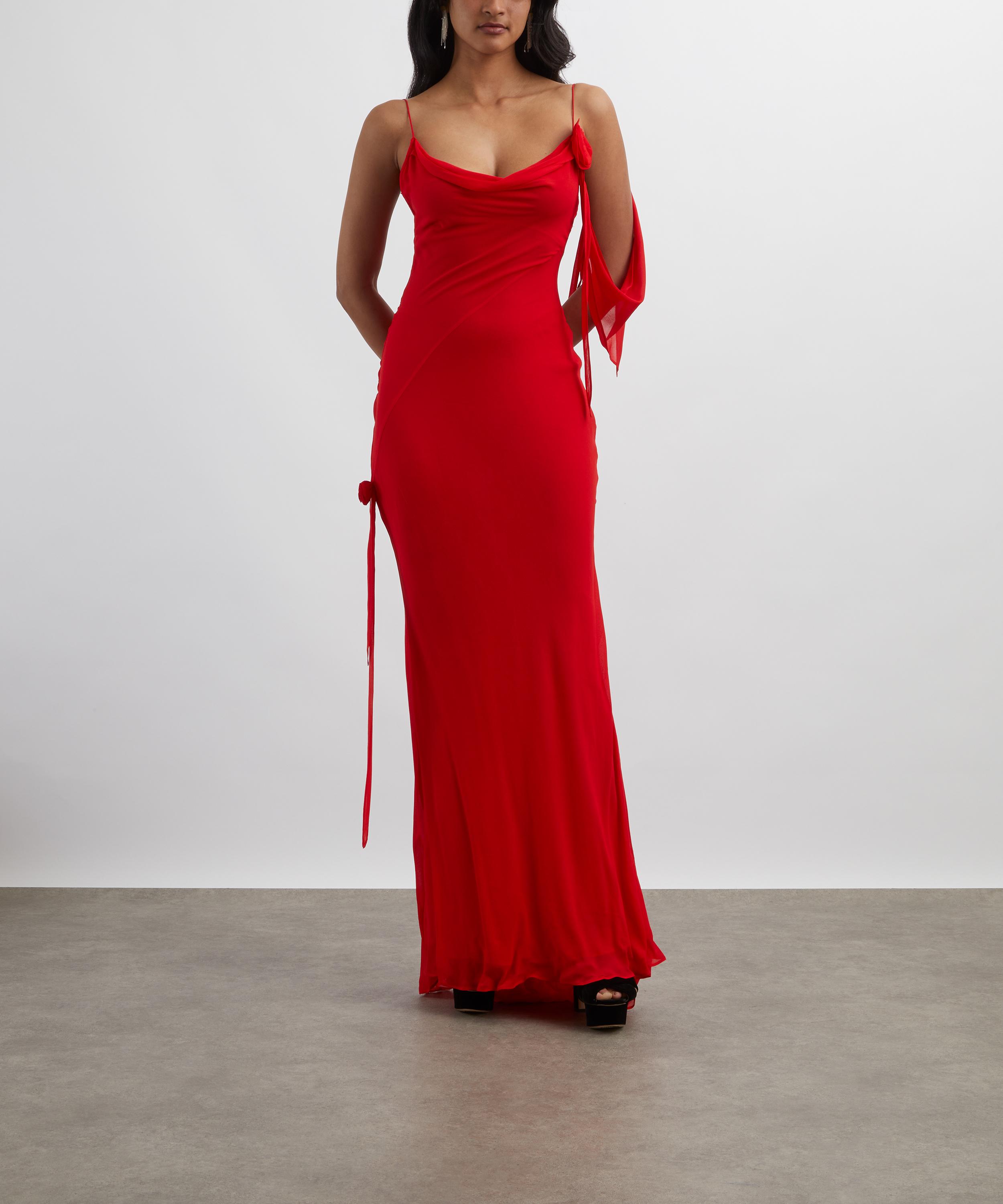 Crafted from fluid viscose georgette, this striking red maxi dress exudes sophistication with its figure-skimming sheath silhouette and draped cowl neckline, finished with a delicate flower corsage for a charming touch.