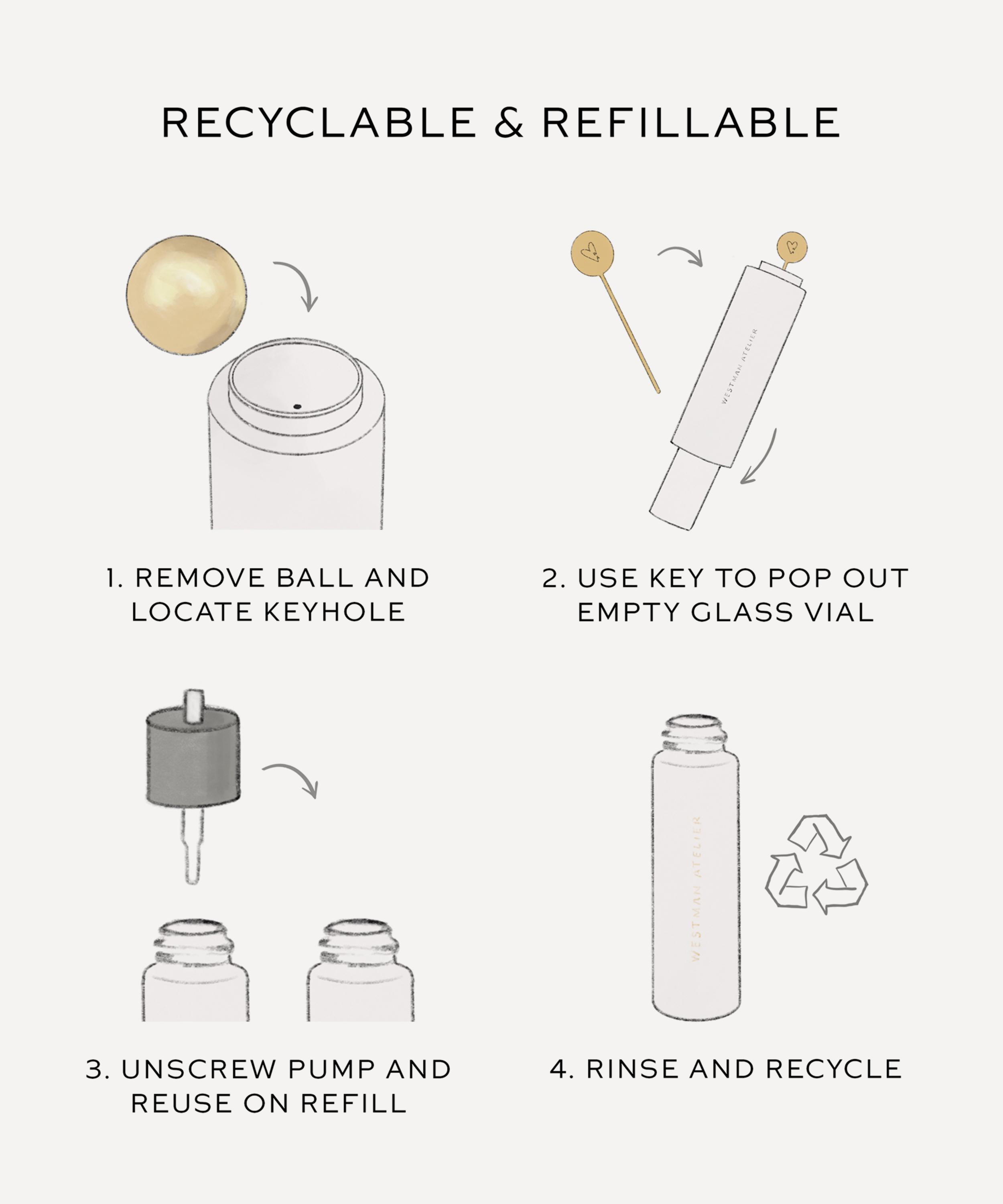 Start with cleansed skin, applying morning and/or night. Click twice to dispense serum, then roll onto face in upwards and outward motions and glide down the neck to flush out excess fluids. Blend in any excess serum with your fingers. Remove magnetic ball to clean after each use.
