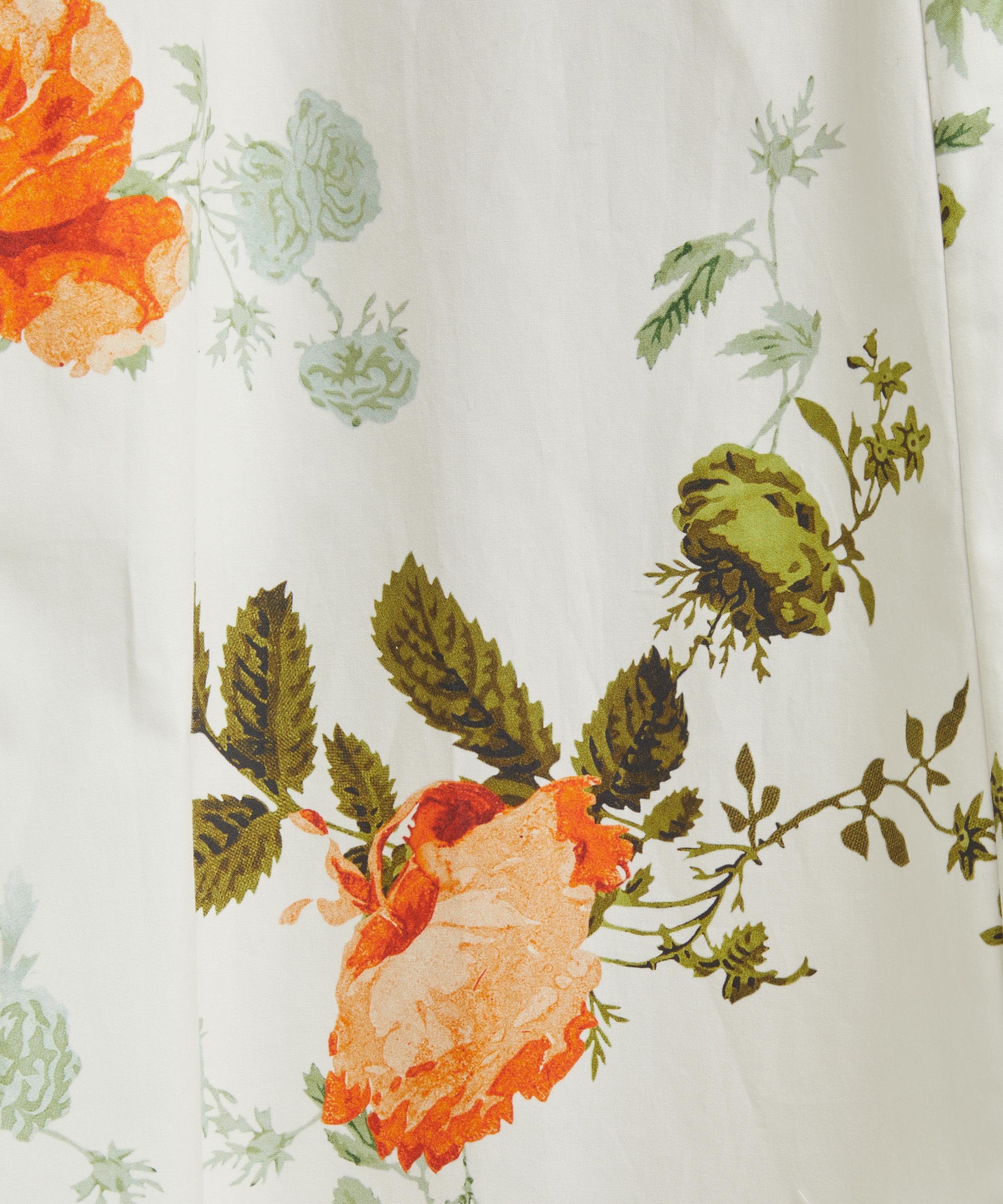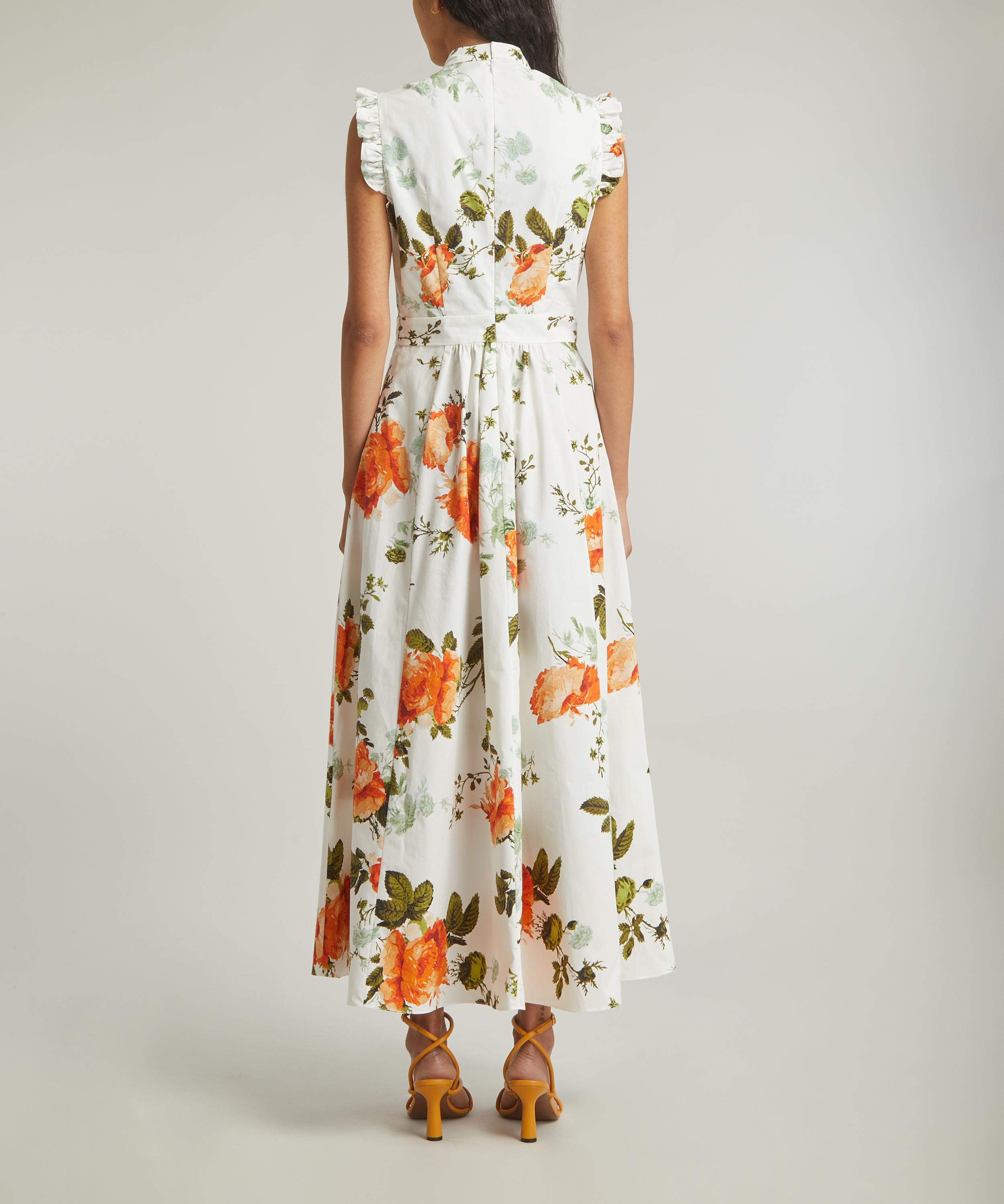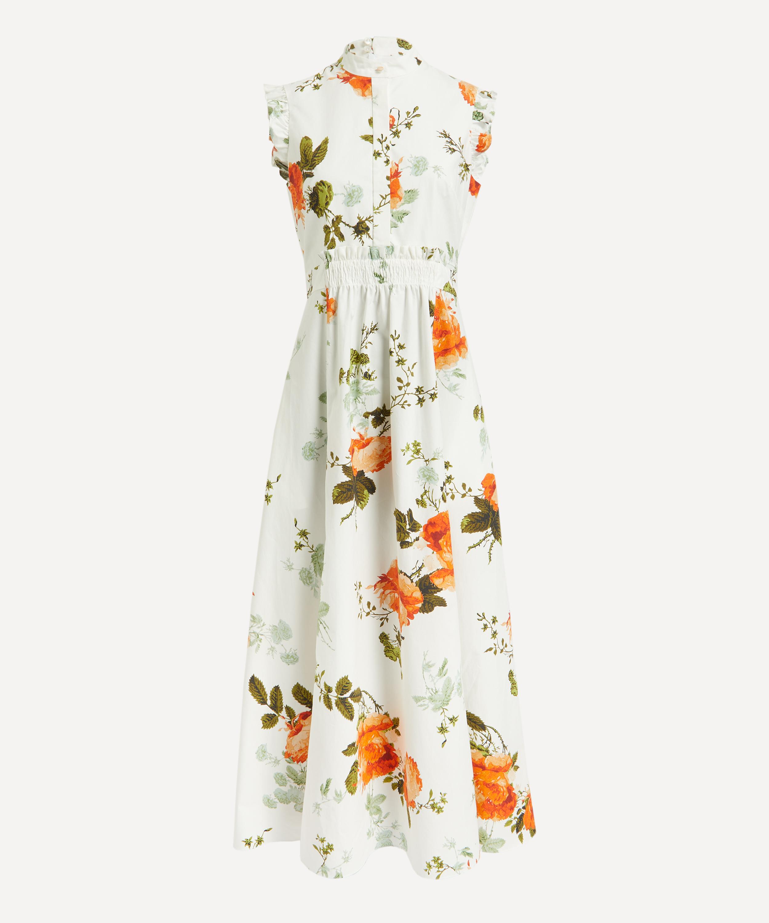 Exuding feminine charm with its structured, A-line silhouette, this crisp cotton poplin dress has a band collar, ruffled armholes, and a full skirt. Effortlessly quaint, it’s decorated with this season’s Cavendish Rose print, a floral design that was inspired by the late Duchess of Devonshire, Deborah Mitford.