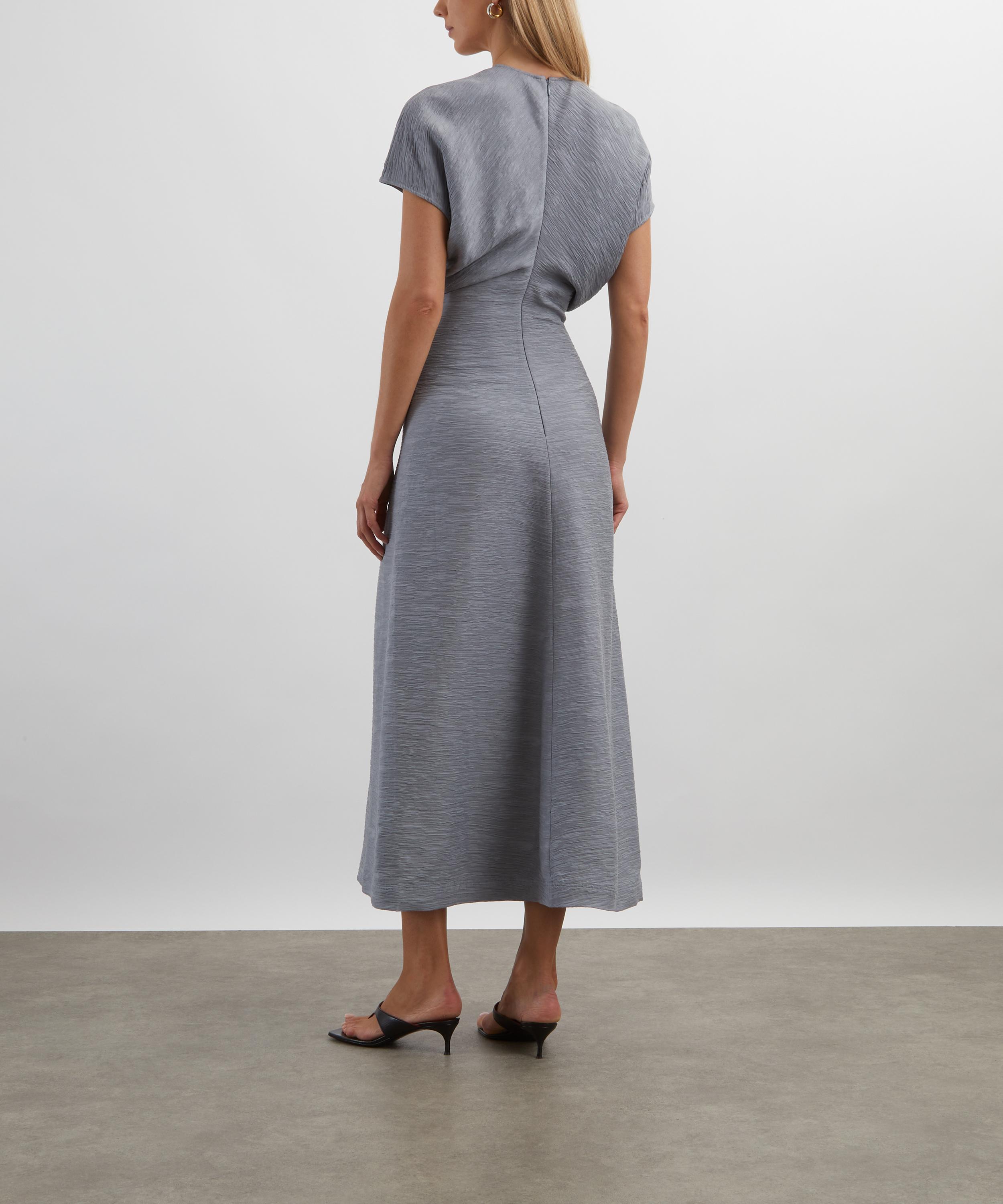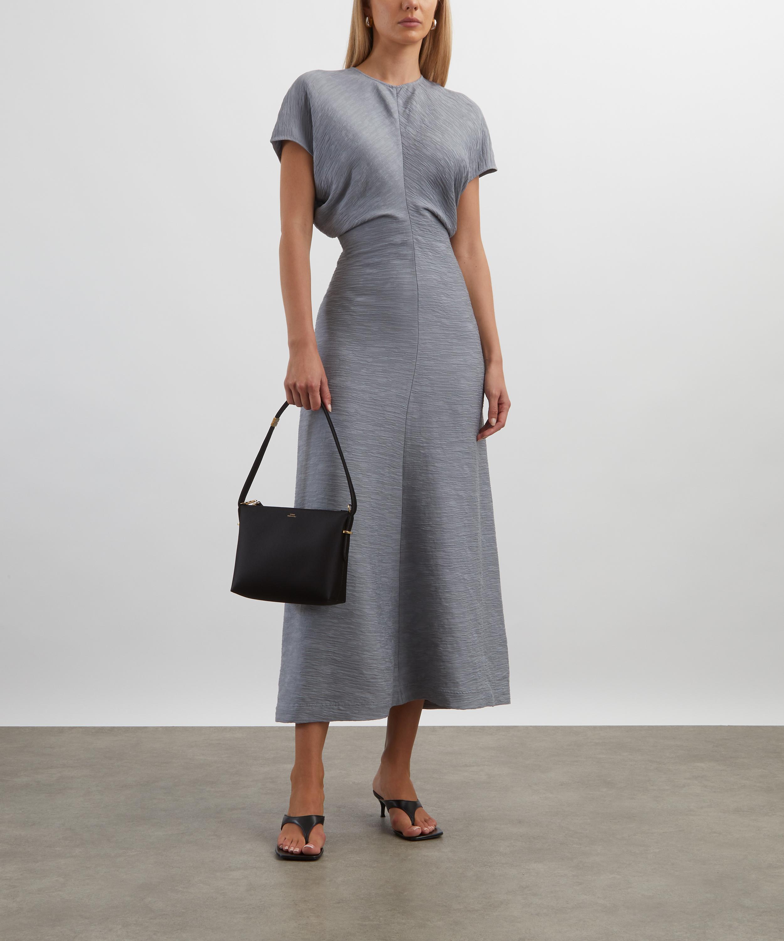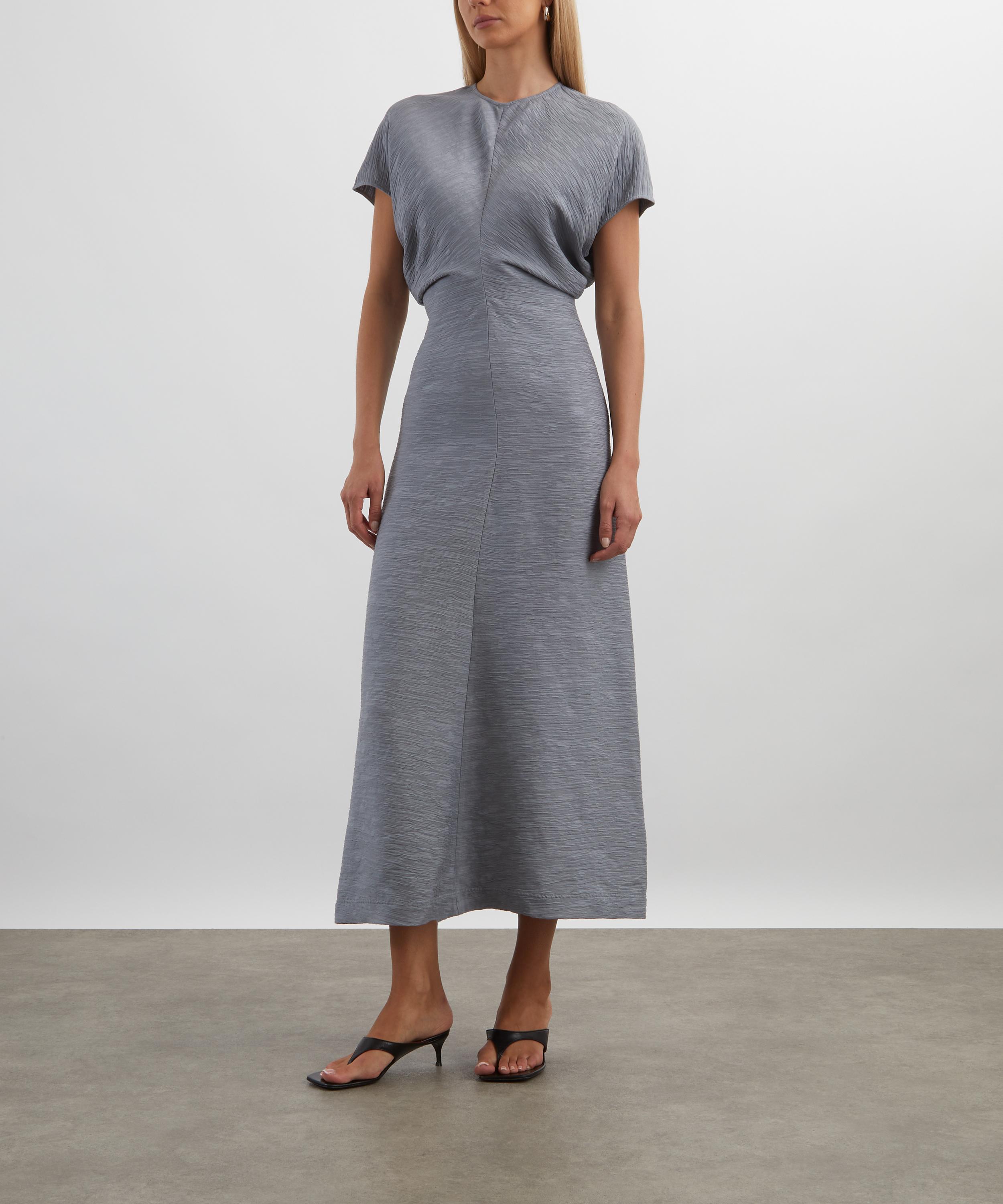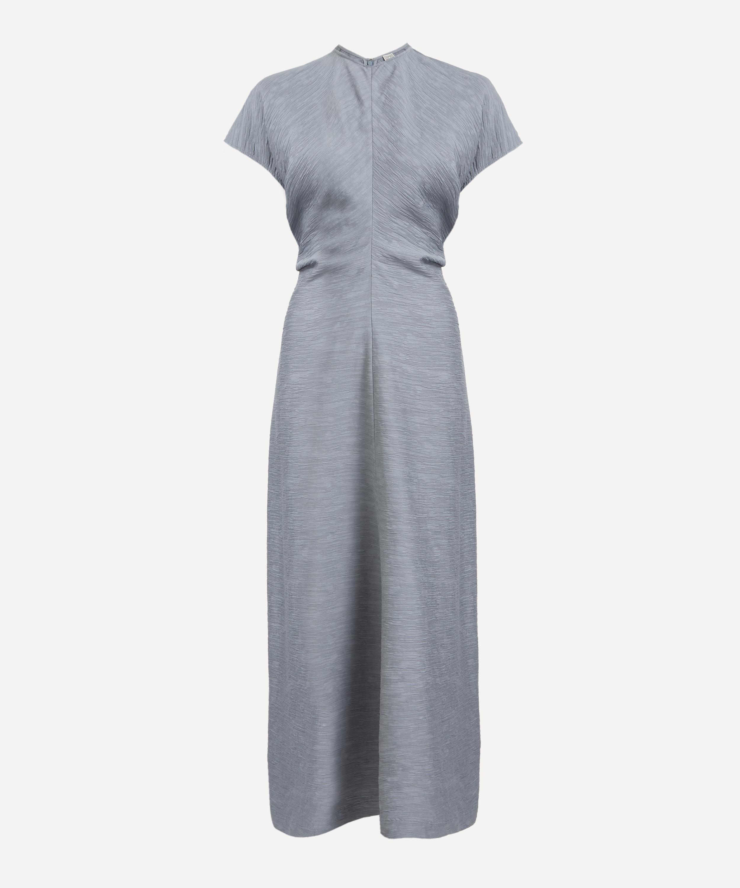 Constructed from a crinkled viscose blend, this ankle-grazing TOTEME dress blends textural elegance with fluid construction. Short cap sleeves and curved panels sewn to create a signature slouched waist lend the silhouette gentle structure and ease, embodying the brand’s refined, relaxed aesthetic.