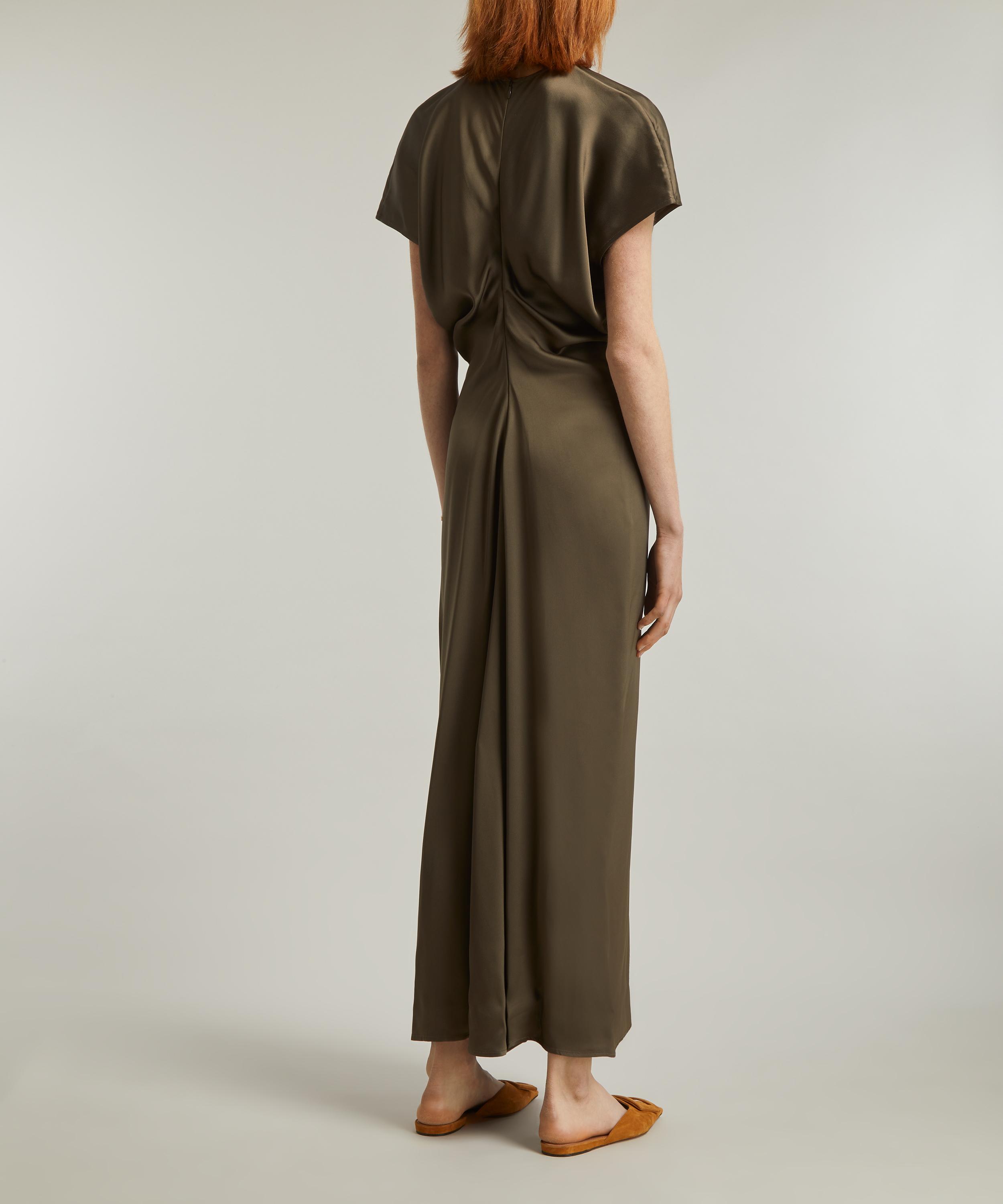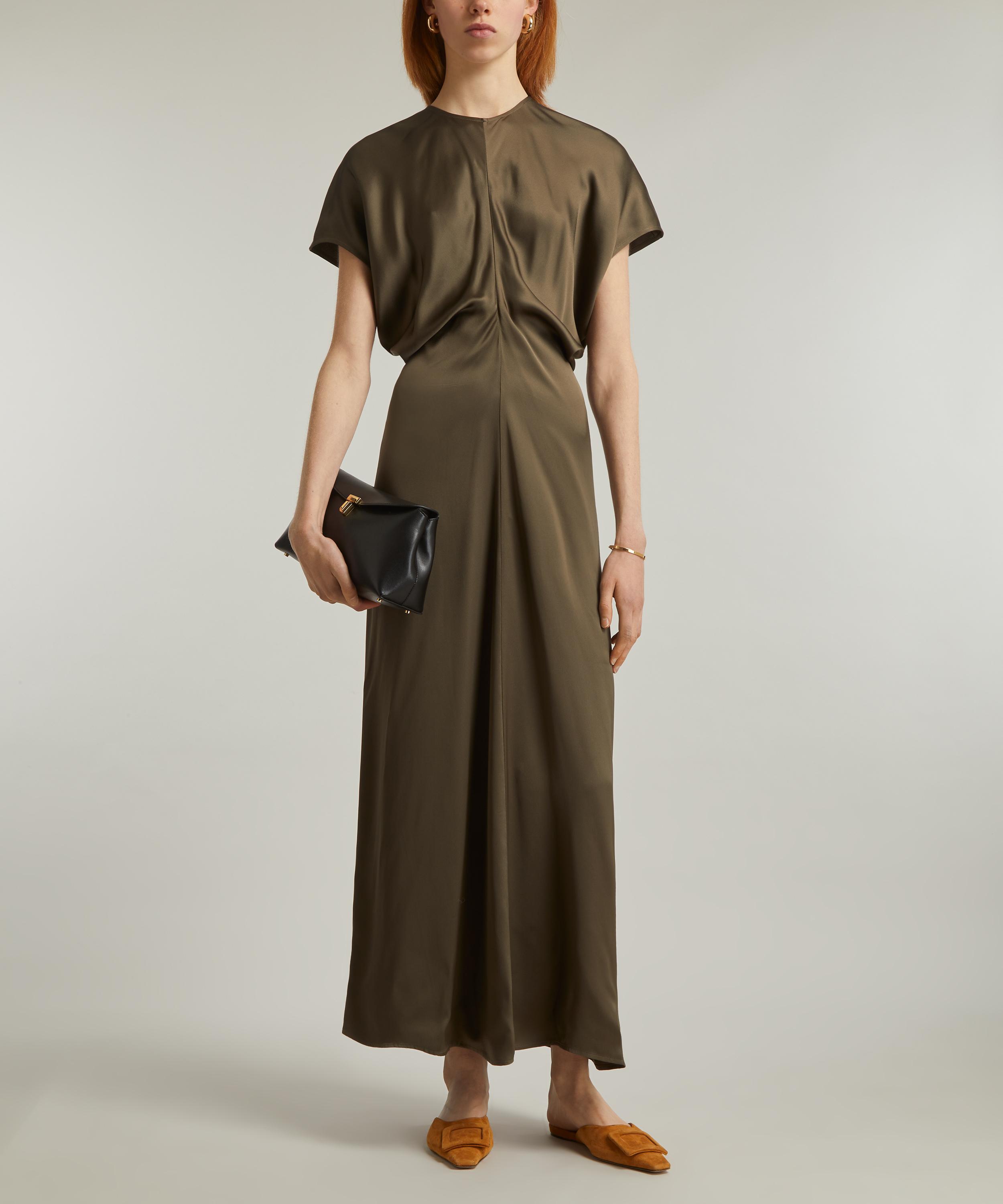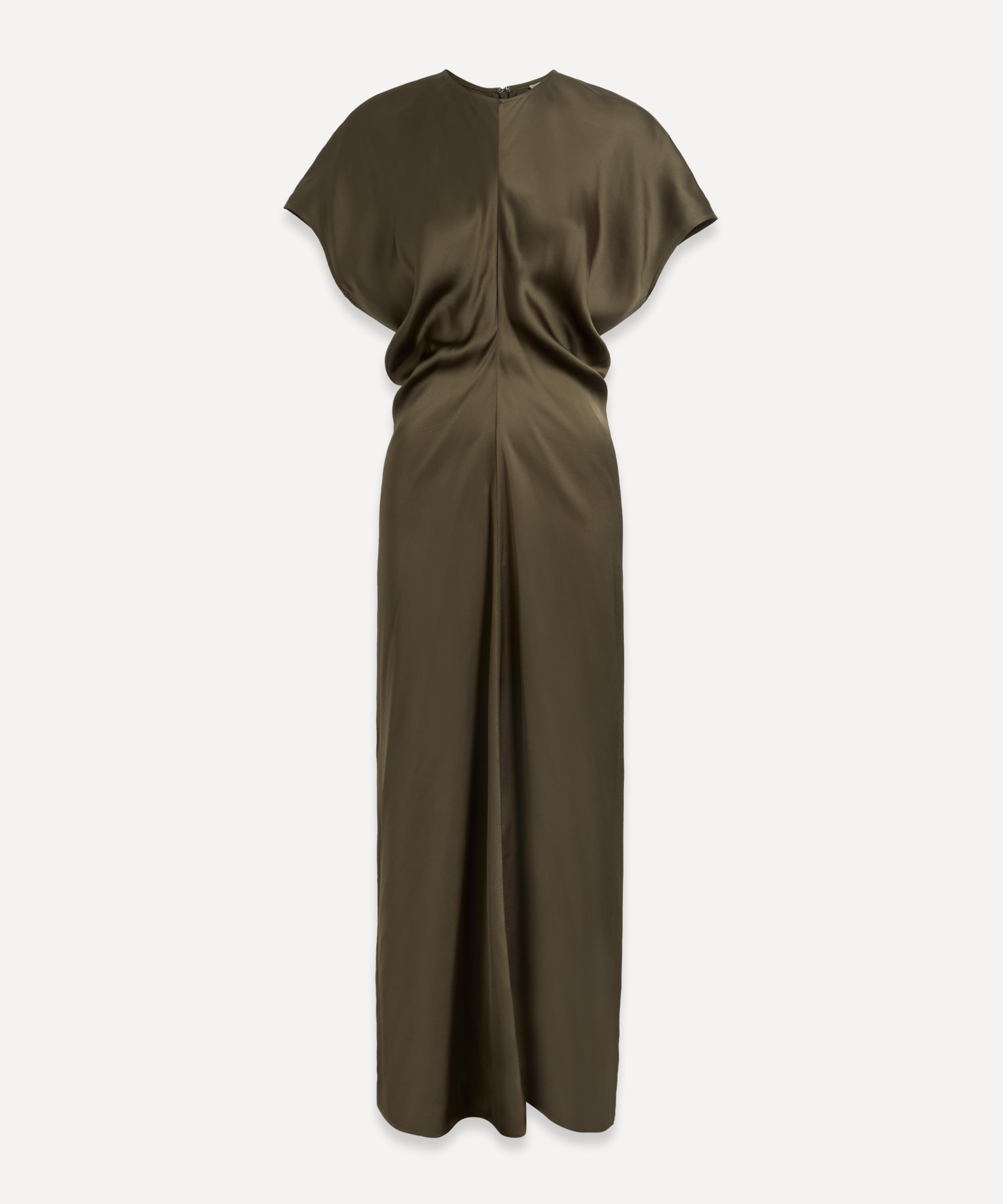 Woven in a sumptuous satin, this ankle-grazing TOTEME dress blends elegance with fluid construction. Short cap sleeves and curved panels sewn to create a signature slouched waist lend the silhouette gentle structure and ease, embodying the brand’s refined, relaxed aesthetic.