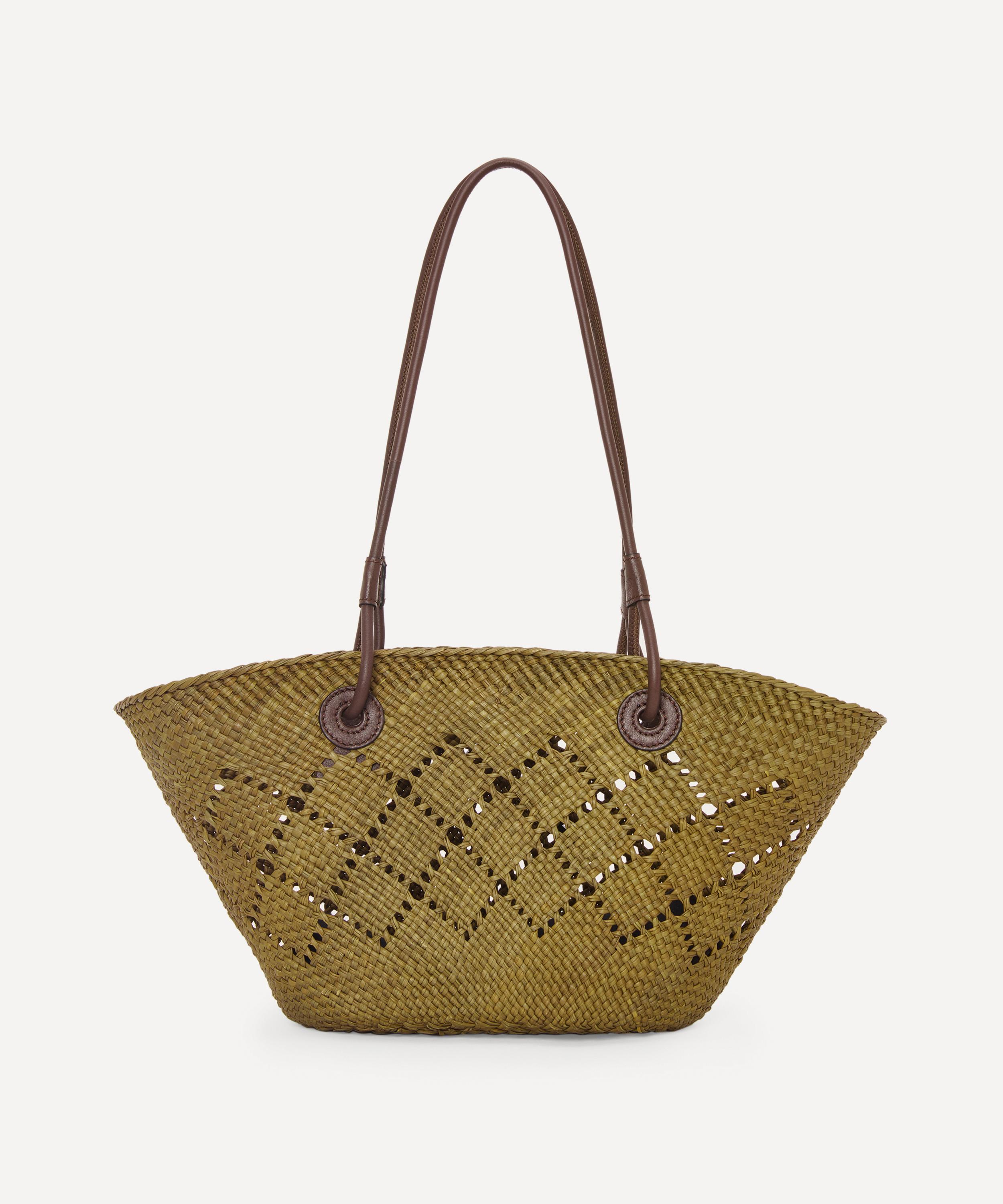 Handwoven from iraca palm in an elegant olive green hue, this spacious tote bag showcases a rustic design with two sets of tubular calf leather handles, a large leather plaque featuring the brand's distinctive Anagram logo and geometric ajouré details through its centre.