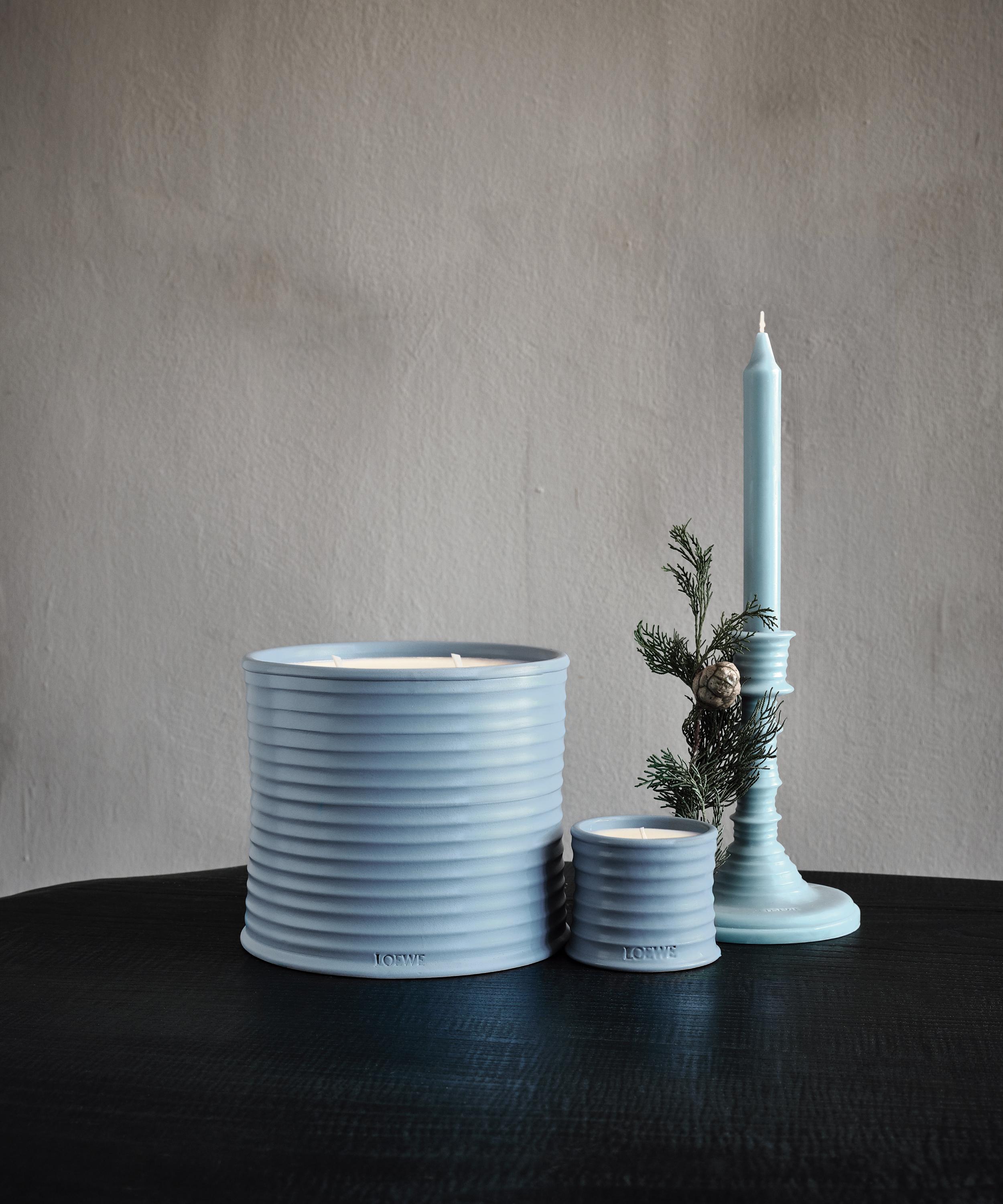 This small Cypress Balls Candle from Loewe is crafted from natural vegetable wax, and presented in a blue-glazed, ribbed terracotta earthenware vessel.