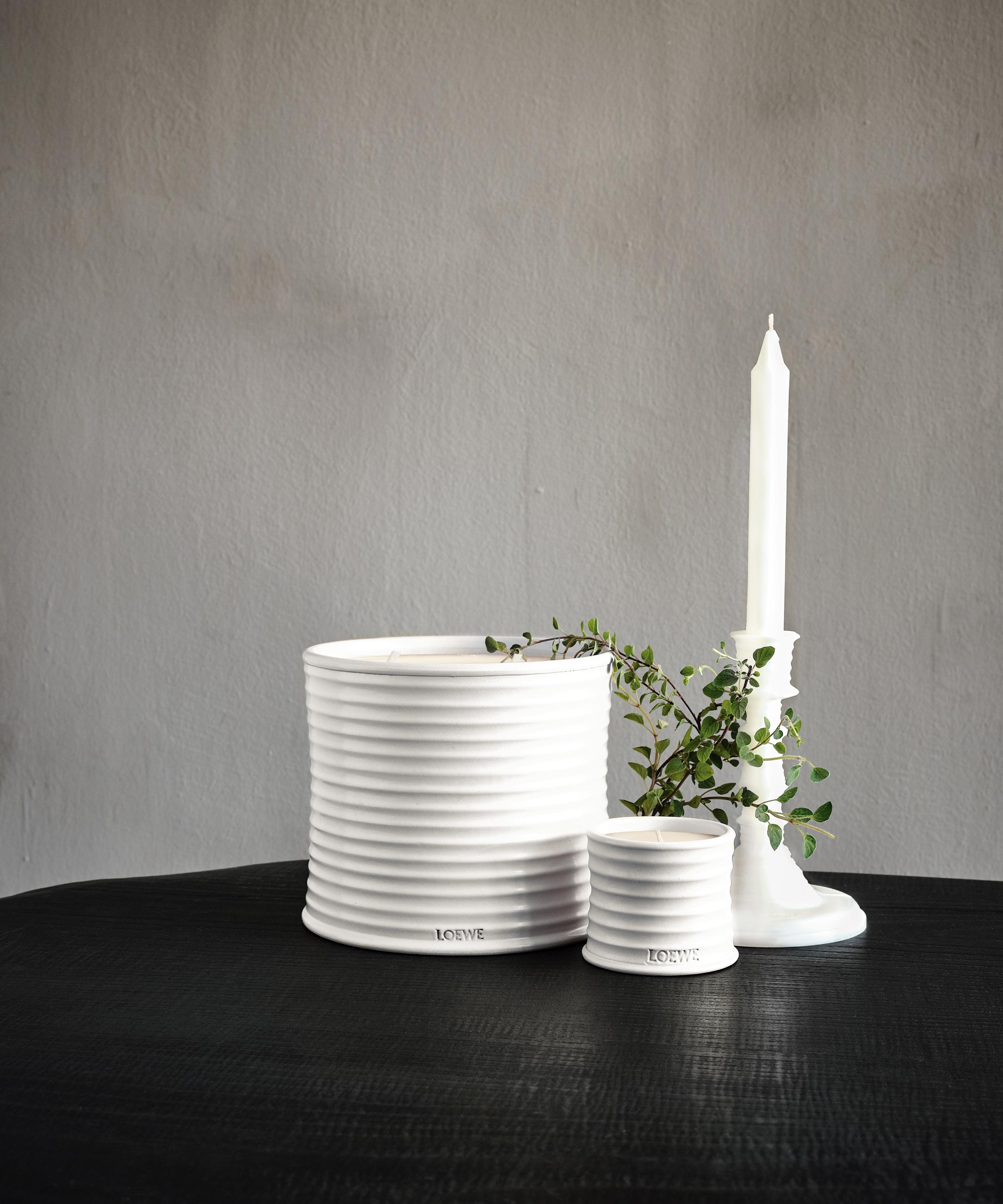 This small Oregano Candle from Loewe is crafted from natural vegetable wax, and presented in an white-glazed, ribbed terracotta earthenware vessel.