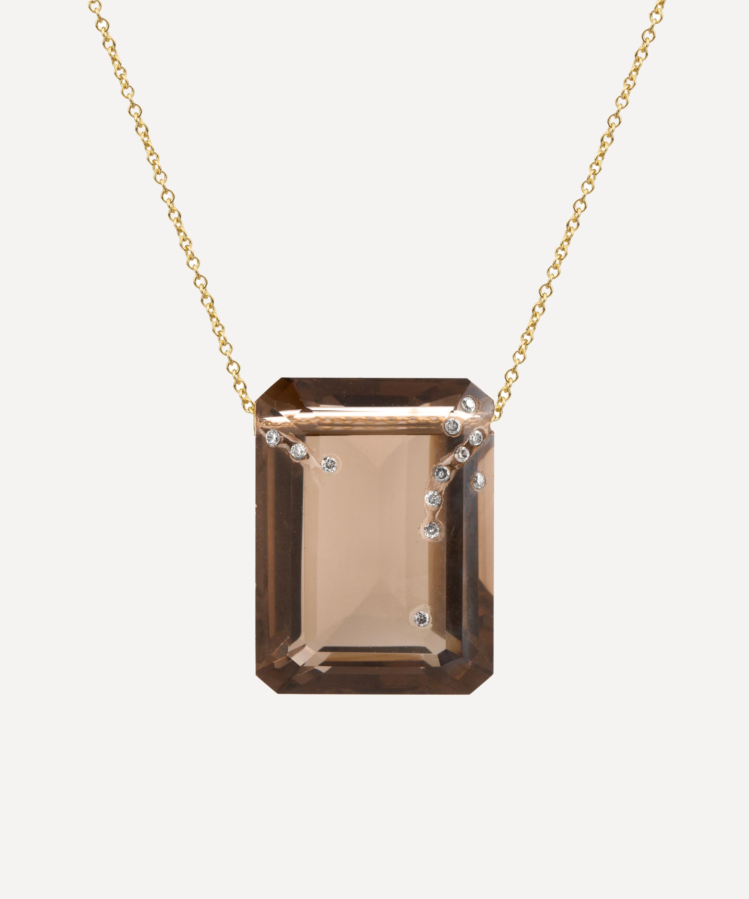 This standout piece features a hand-carved smokey quartz gemstone threaded with 14ct gold trace chain and scattered with brilliant cut champagne diamonds in the crevices. Inspired by the beauty of the cosmos, it can be worn as a statement solo piece or paired with matching jewellery from the collection.