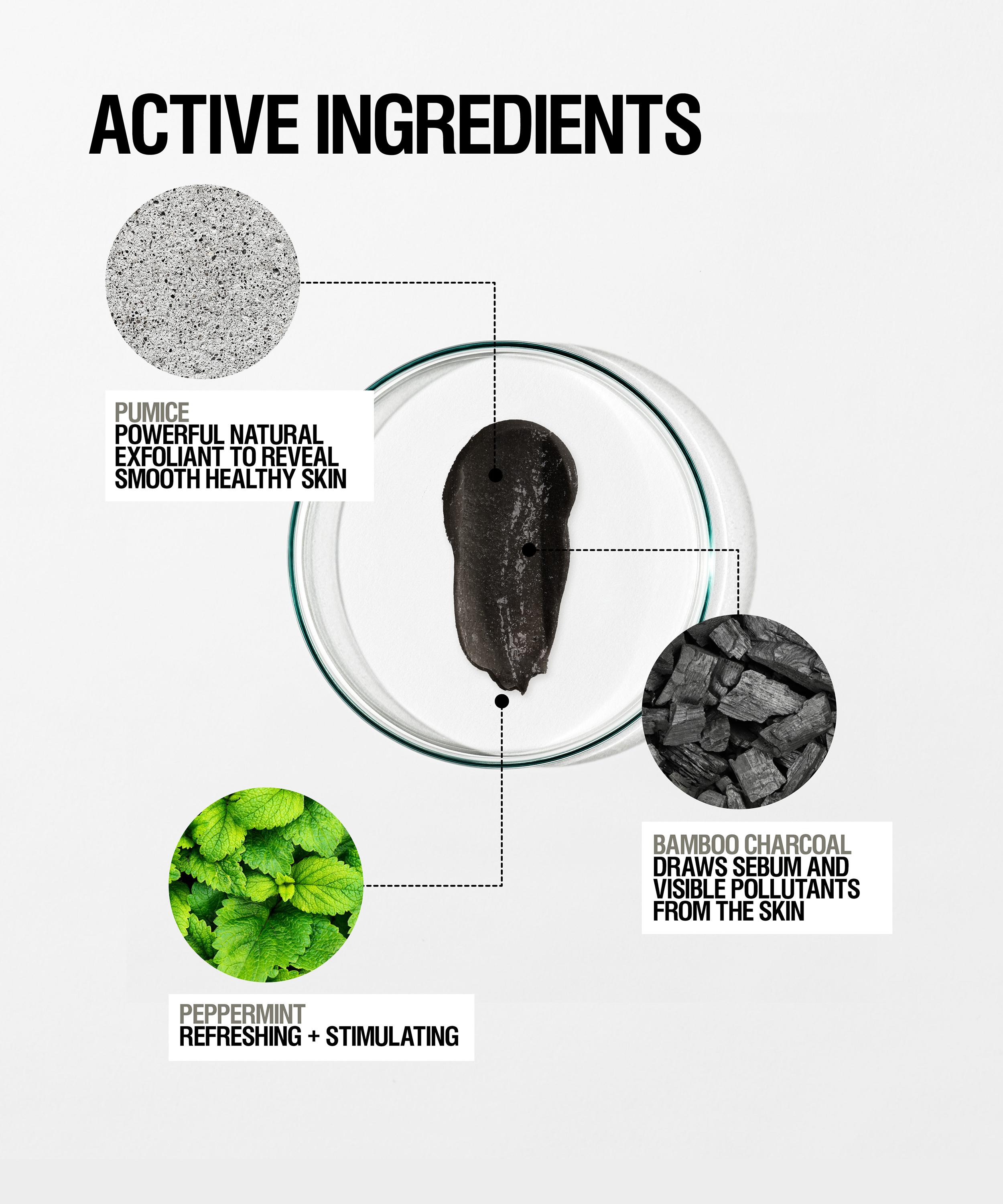 Water/Aqua/Eau, Sodium Cocoyl Glutamate, Propanediol, Pumice, Glycerin, Xanthan Gum, Coco-Glucoside, Propylene Glycol, Glyceryl Caprylate, Citric Acid, Sodium Phytate, Caprylhydroxamic Acid, Citrus Aurantium Dulcis (Orange) Peel Extract, Glyceryl Undecylenate, Cinnamomum Camphora (Camphor) Bark Oil, Cedrus Atlantica Wood Oil, Cymbopogon Martini Oil, Mentha Arvensis Leaf Oil, Citrus Aurantium Bergamia (Bergamot) Fruit Oil, Amyris Balsamifera Bark Oil, Cananga Odorata Flower Oil, Eucalyptus Globulus Leaf Oil, Mentha Piperita (Peppermint) Oil, Pelargonium Graveolens Flower Oil, Rosmarinus Officinalis (Rosemary) Leaf Oil, Jasminum Officinale (Jasmine) Oil, Myroxylon Pereirae (Balsam Peru) Oil, Triethyl Citrate, Charcoal Powder / CI 77268:1, Limonene, Linalool, Geraniol.