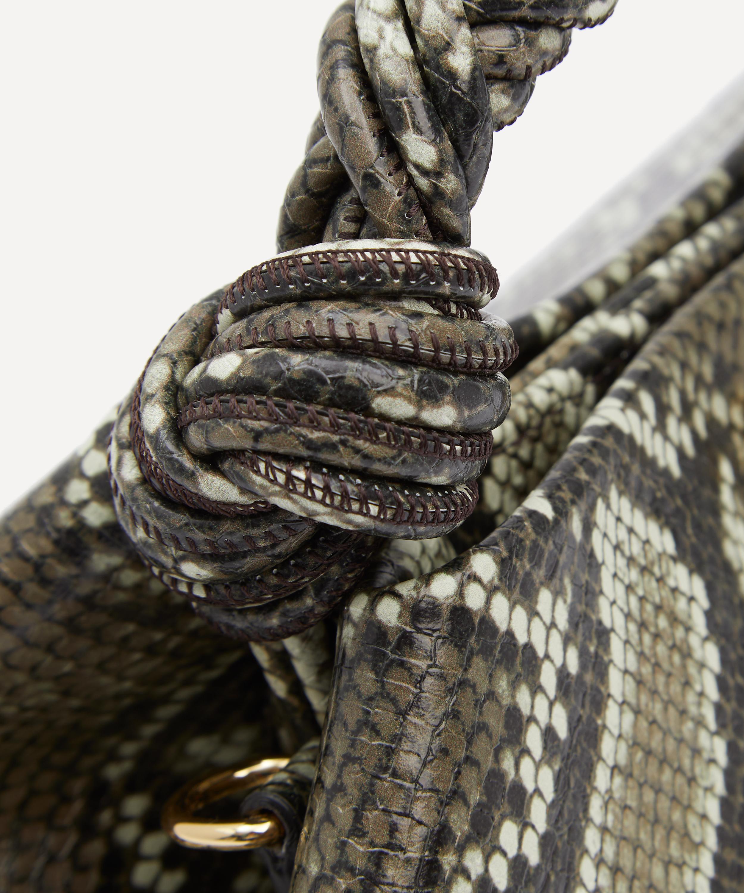 The Small Bou top handle bag is a signature style by millennial-favourite brand Ganni. Staying true to the brand's coveted cool-girl image, this bag is characterised by a structured, hexagonal silhouette in an all-over snake print, and a twisted top handle with a braided knot and metallic dice engraved with Ganni’s butterfly logo. Further equipped with a magnetic closure, two main compartments and an internal flat card pocket, it’s finished with a detachable shoulder strap that can be worn crossbody or over the shoulder for an effortlessly stylish alternative to your usual day bag.