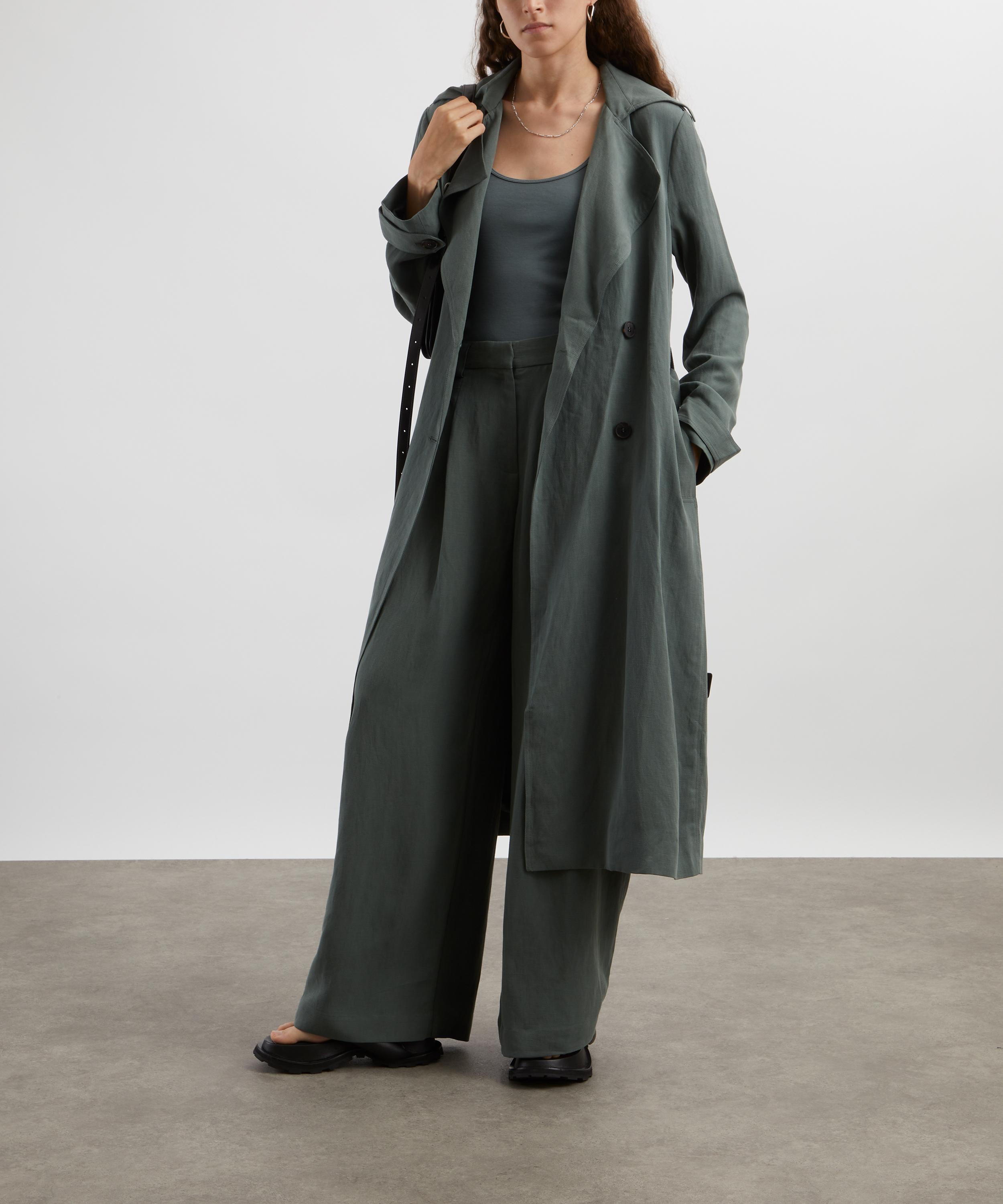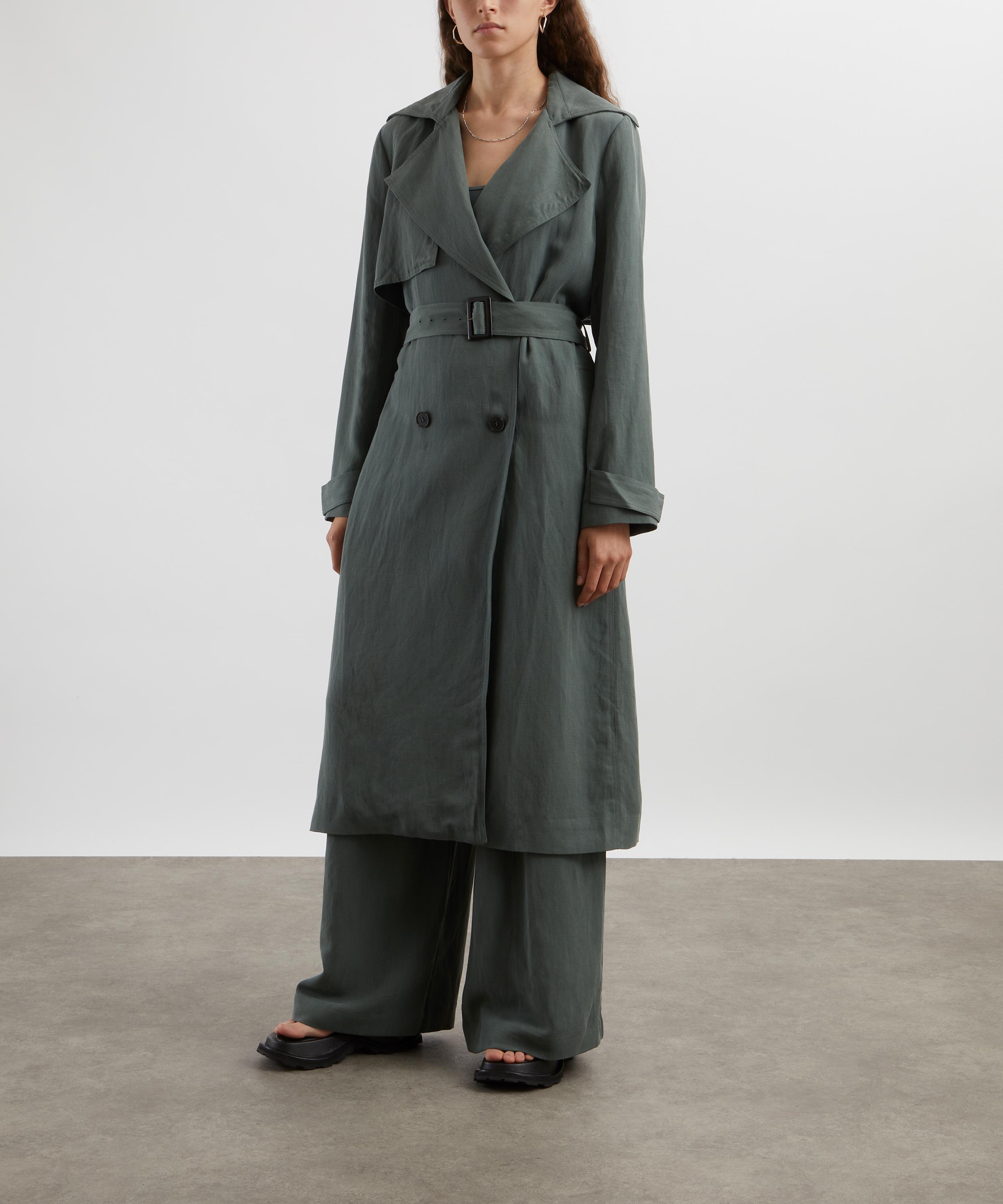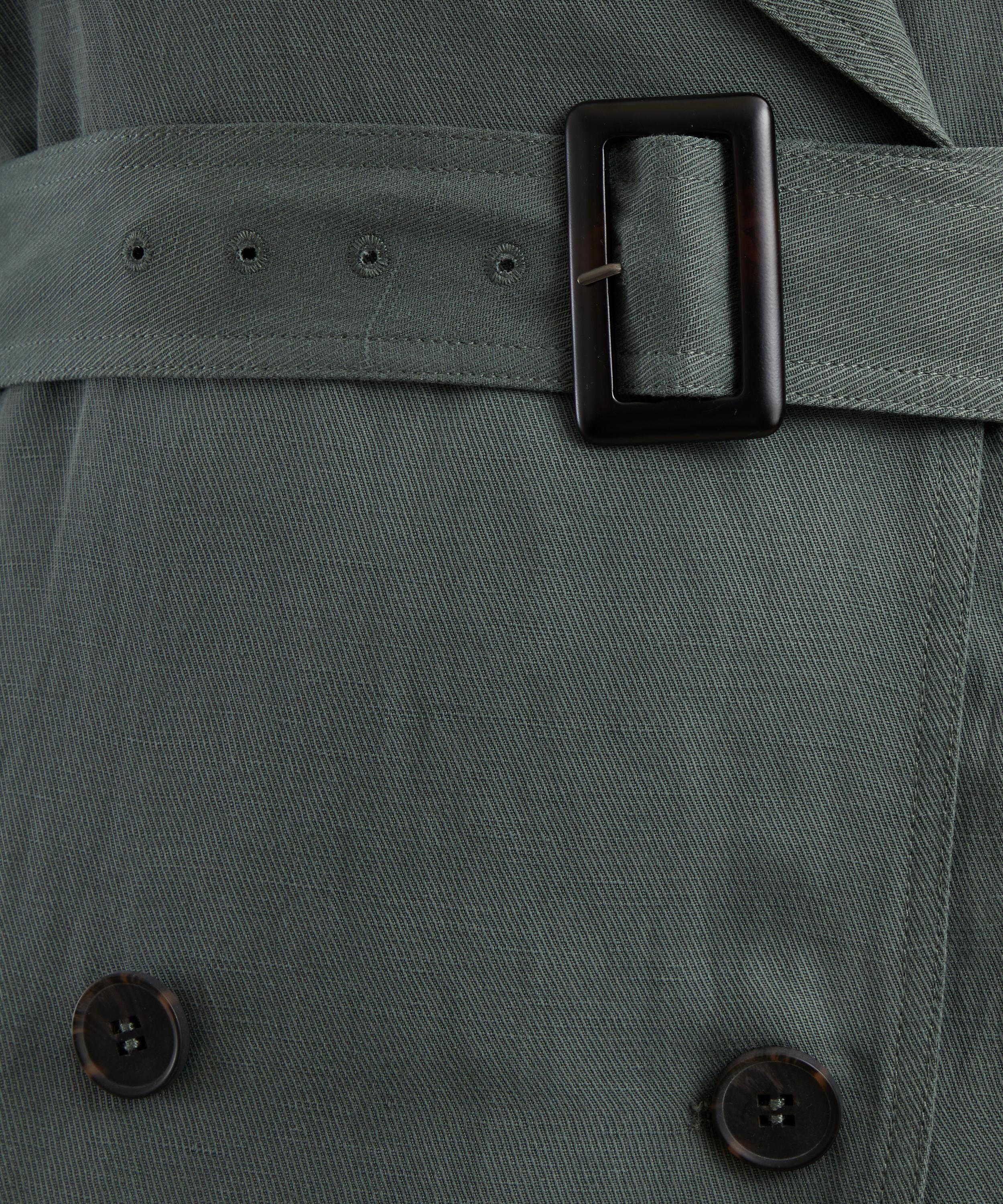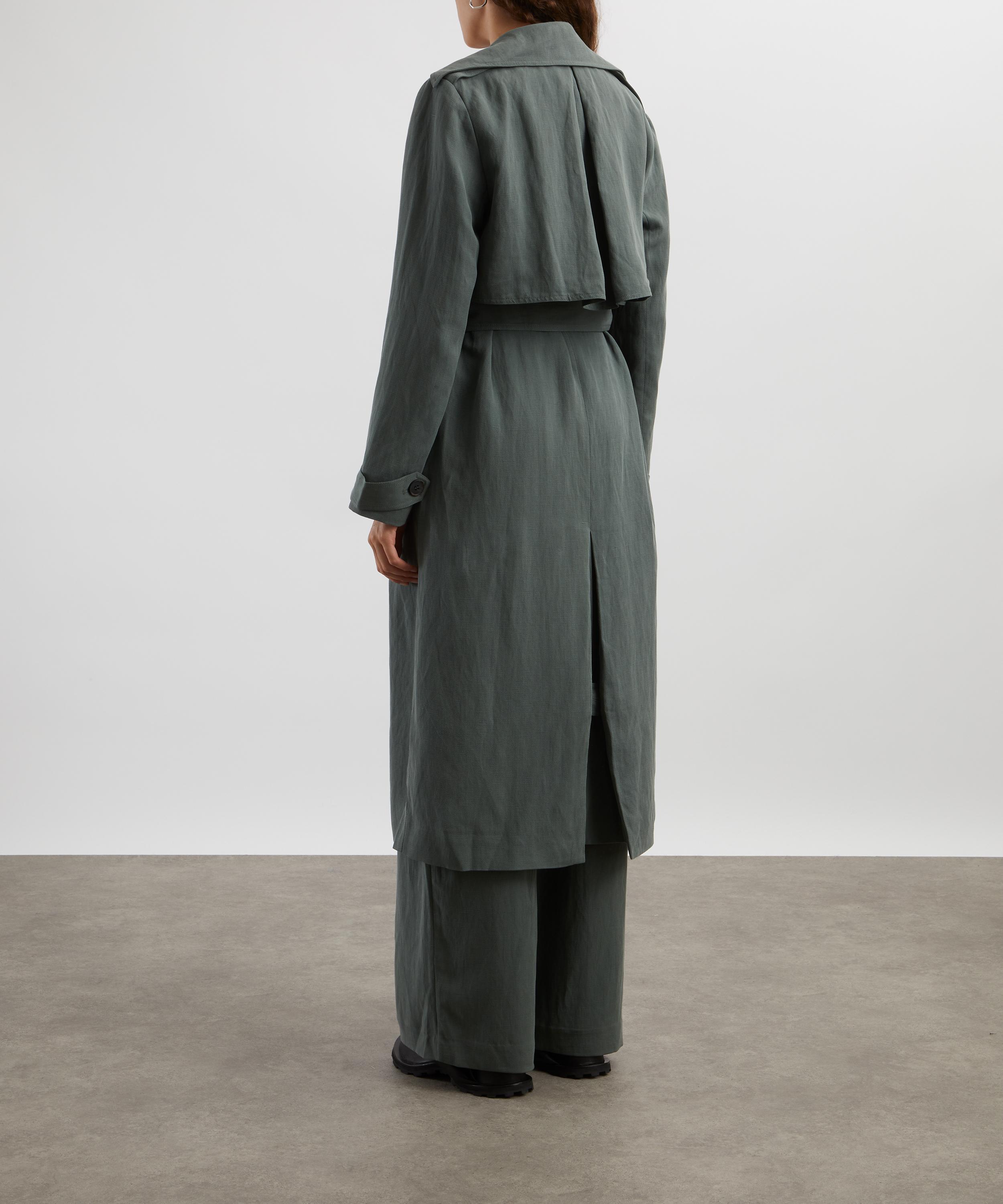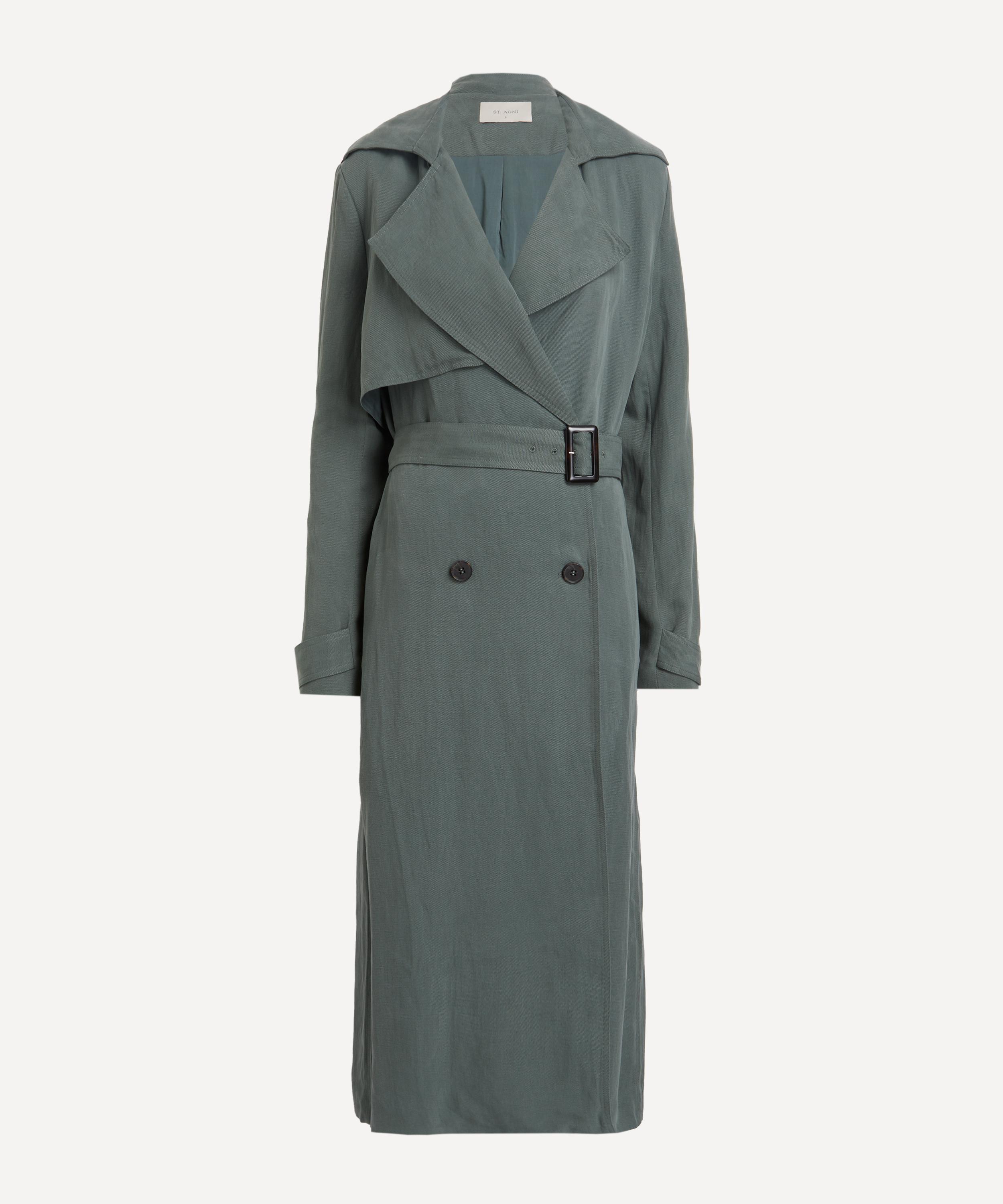 A signature St. Agni silhouette constructed from a sleek Tencel linen blend, this trench flatters the female form with its belted waist silhouette, finessed with a double breasted single storm flap cut.