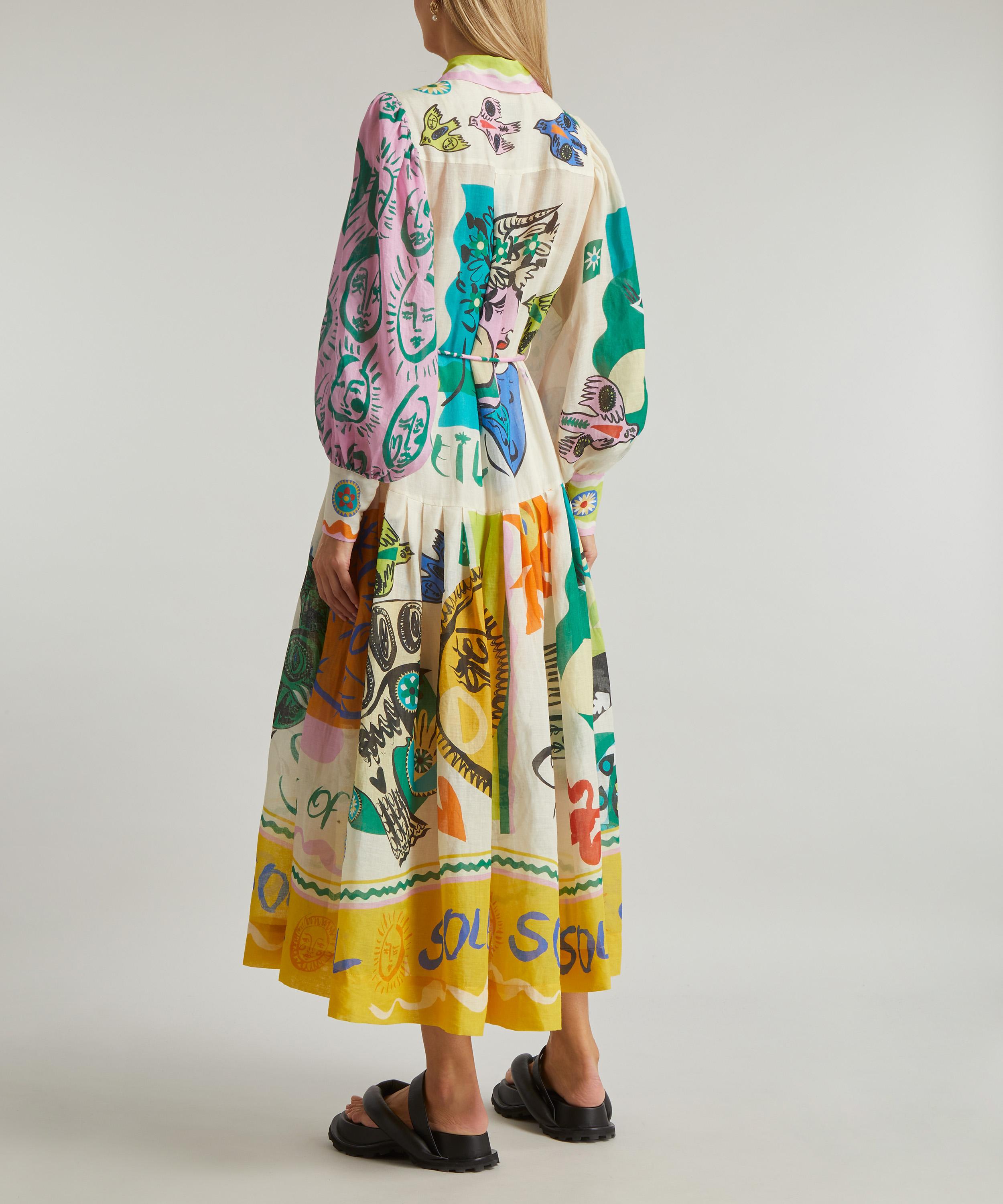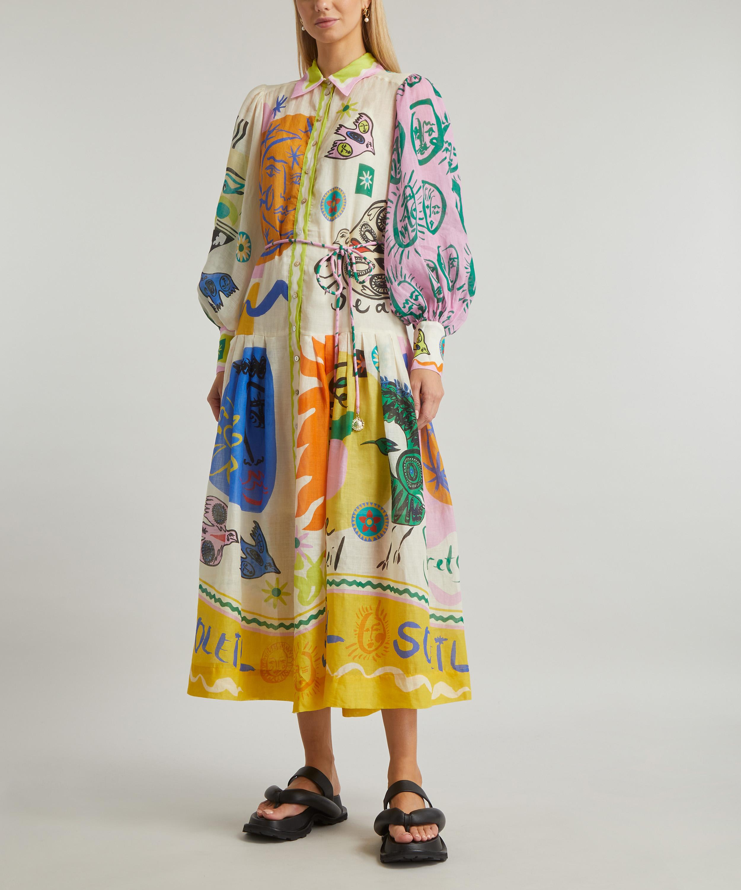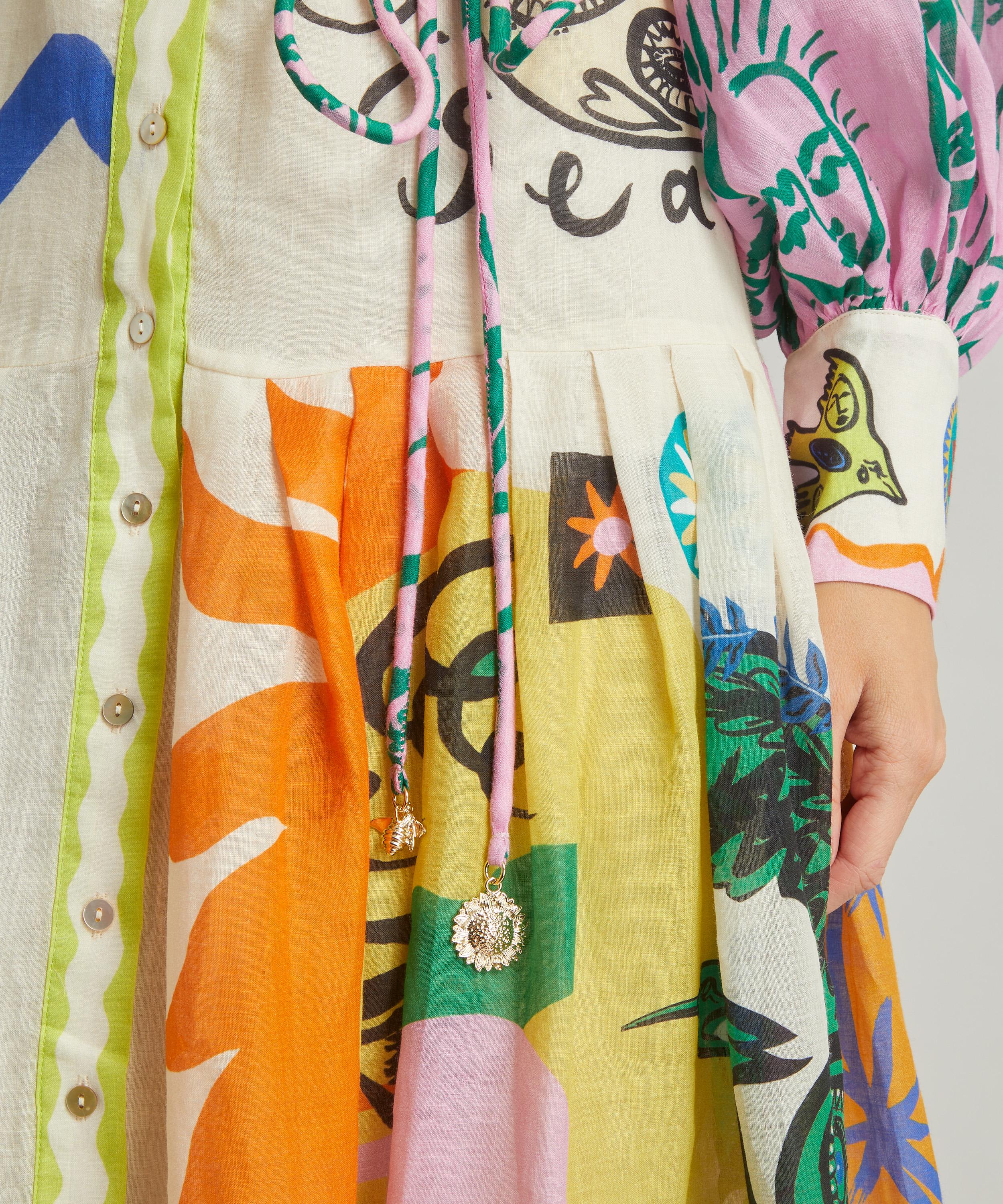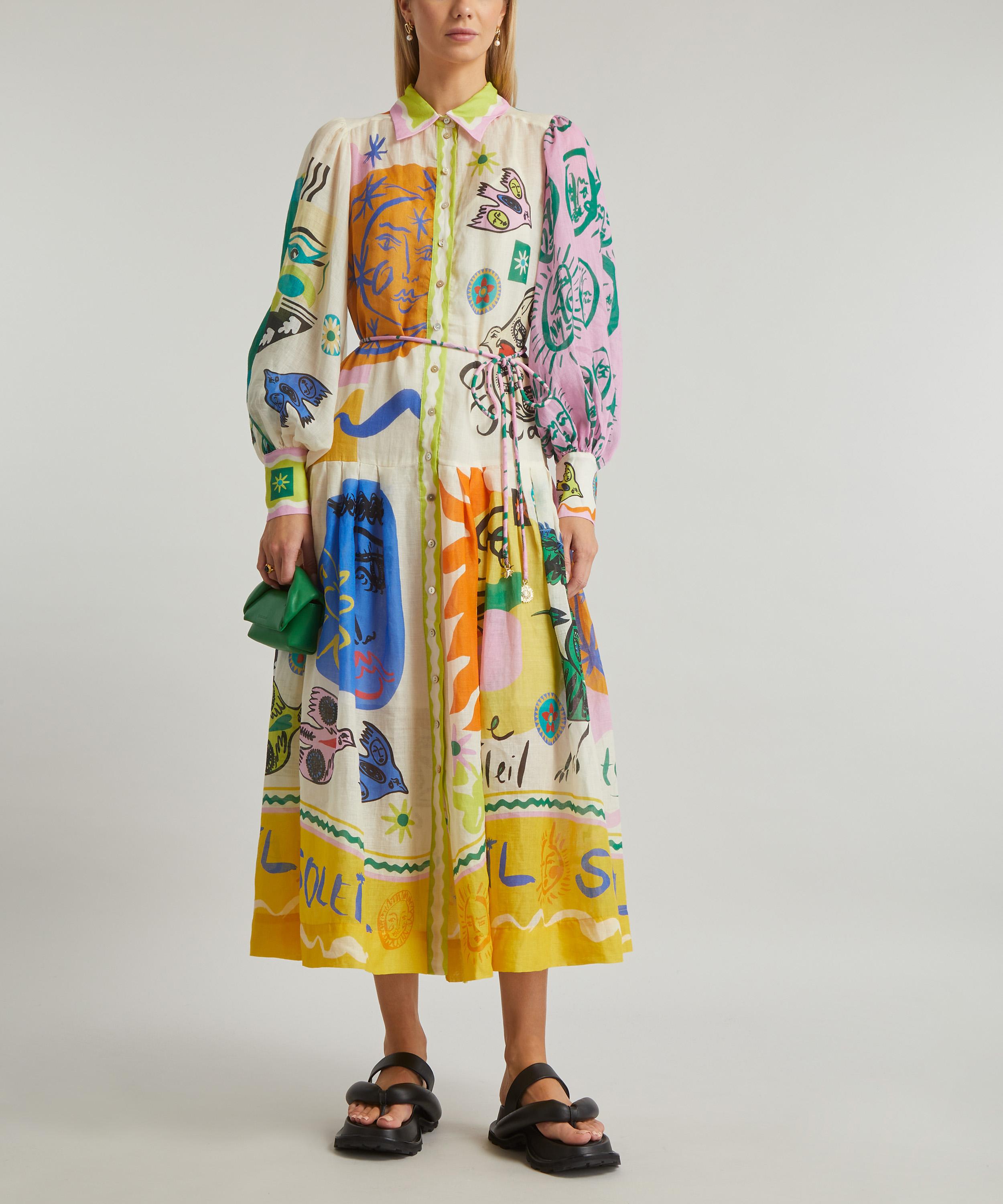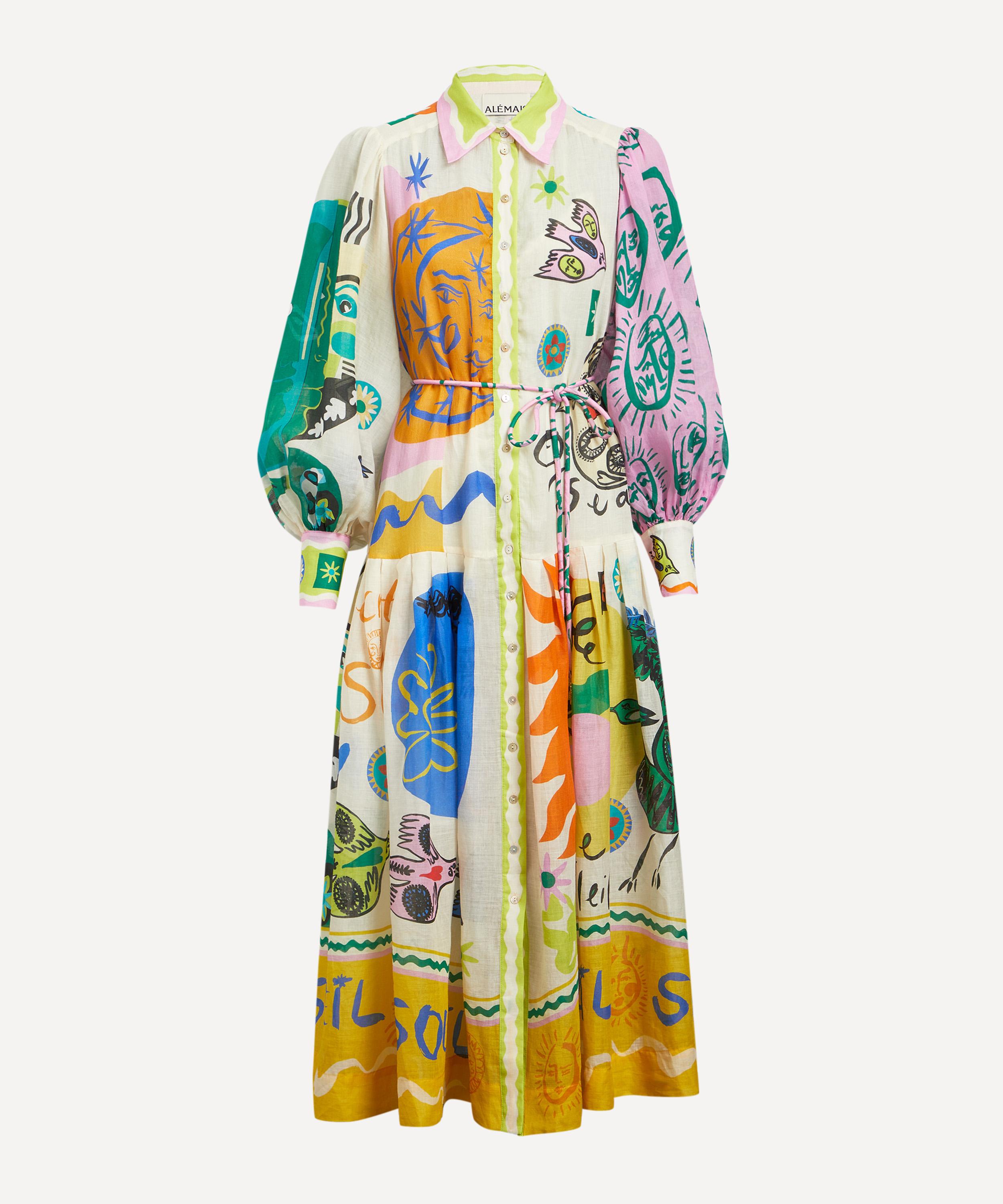 The Soleil Patchwork shirtdress from Australian label ALÉMAIS brings an effortless touch of sun-kissed sophistication to your new season edit. Bold and breezy with its cuffed balloon-sleeves and loose A-line skirt, this ramie shirtdress is adorned all-over with a painterly pattern featuring miscellaneous, multicoloured sun faces.