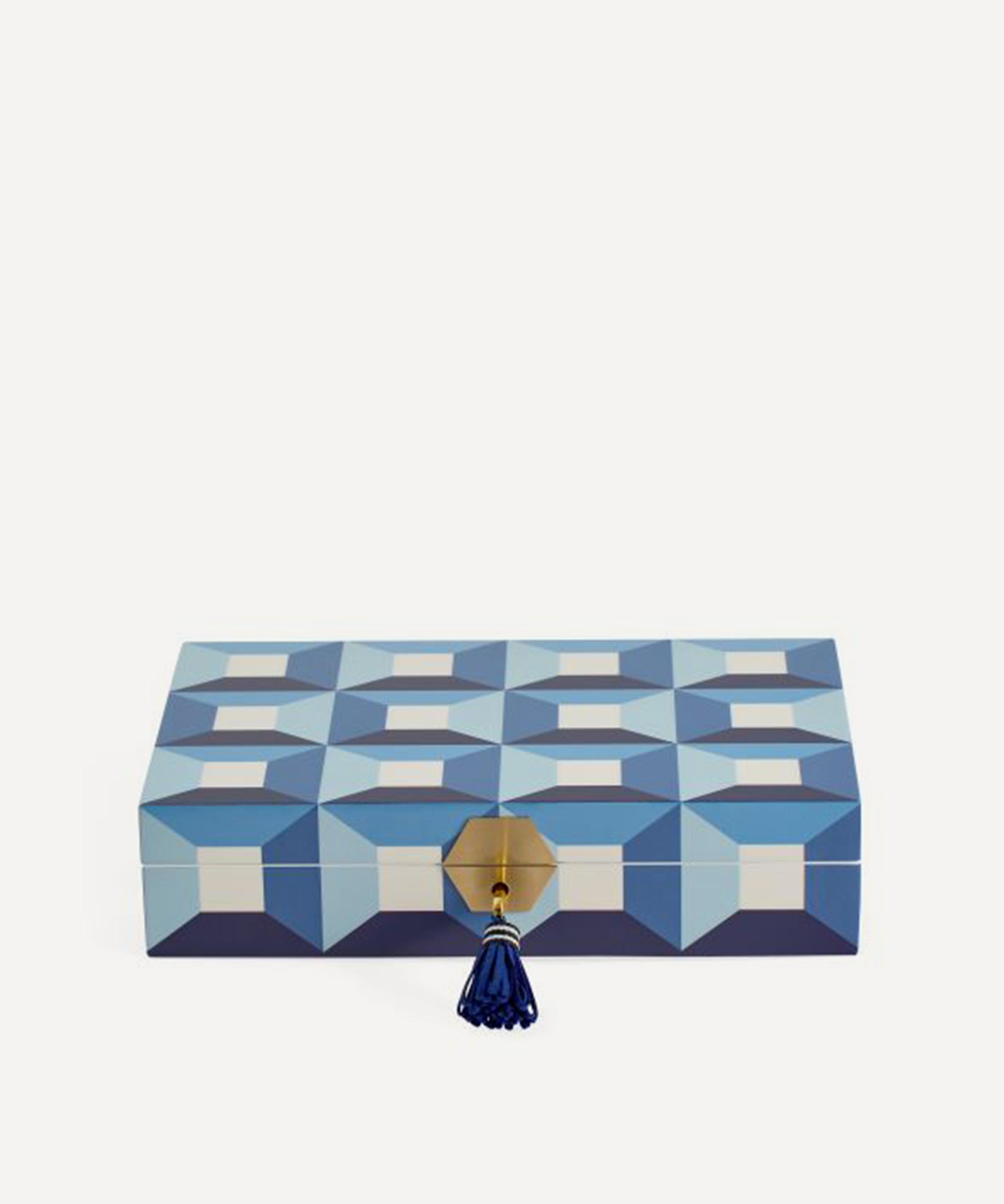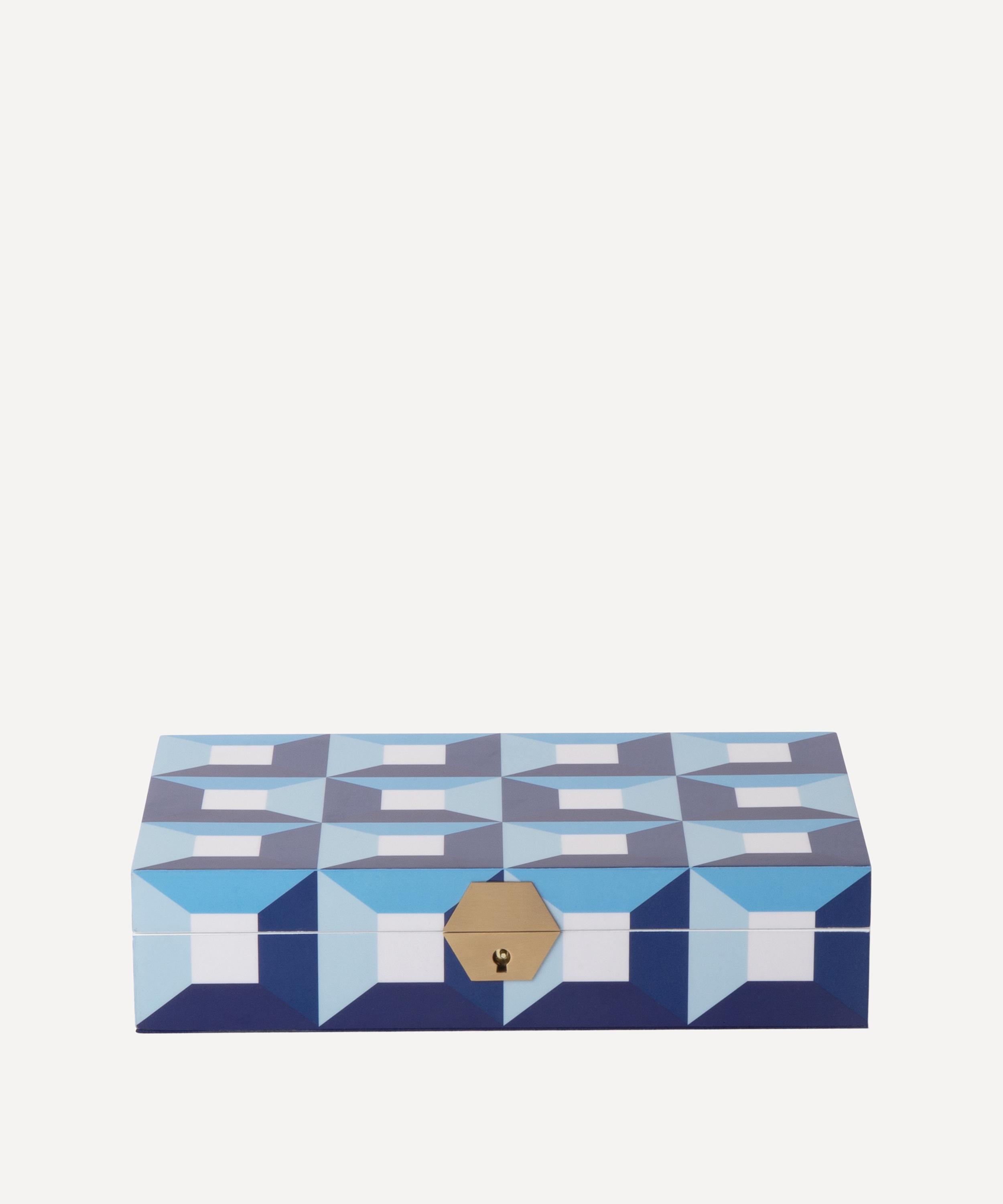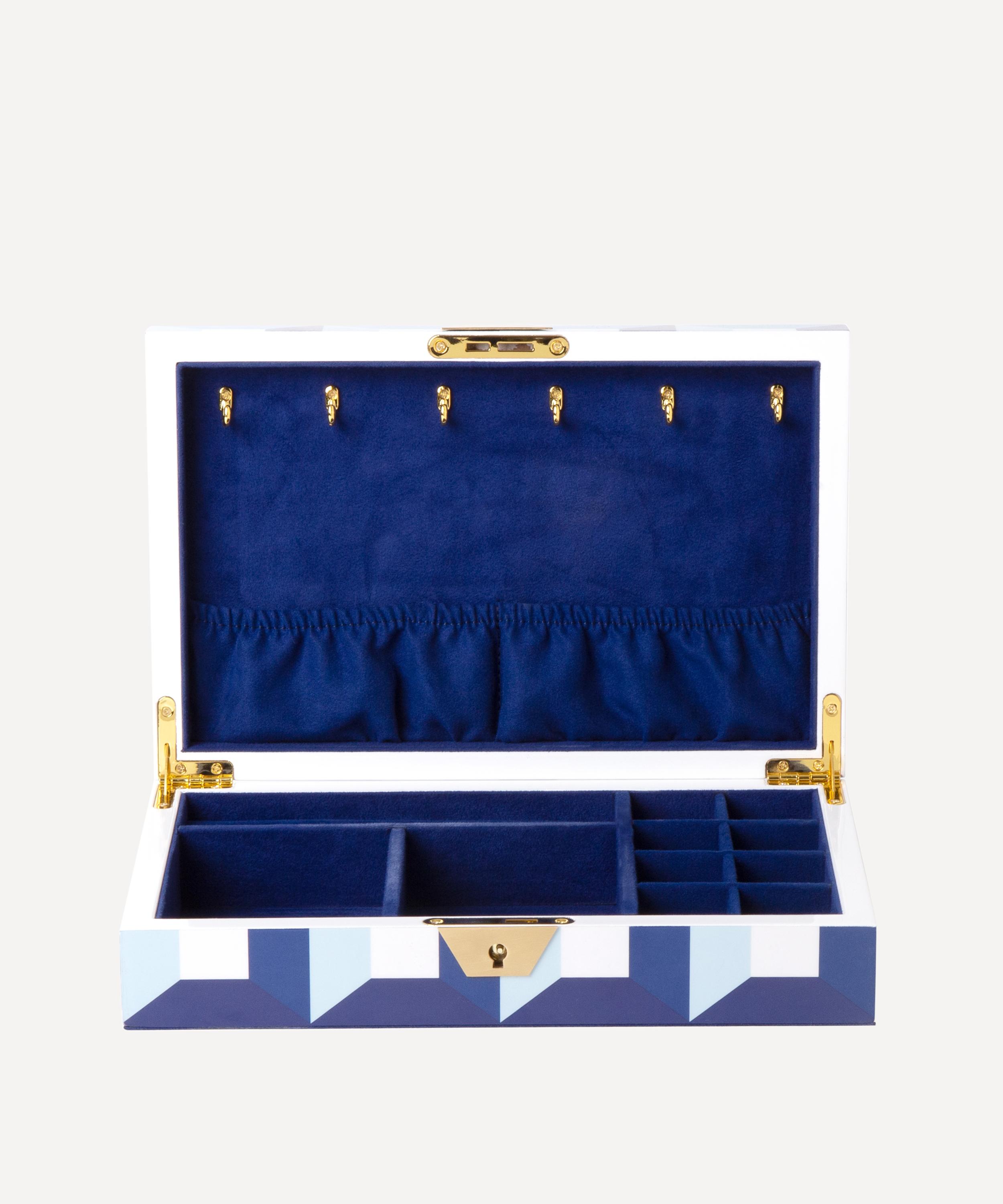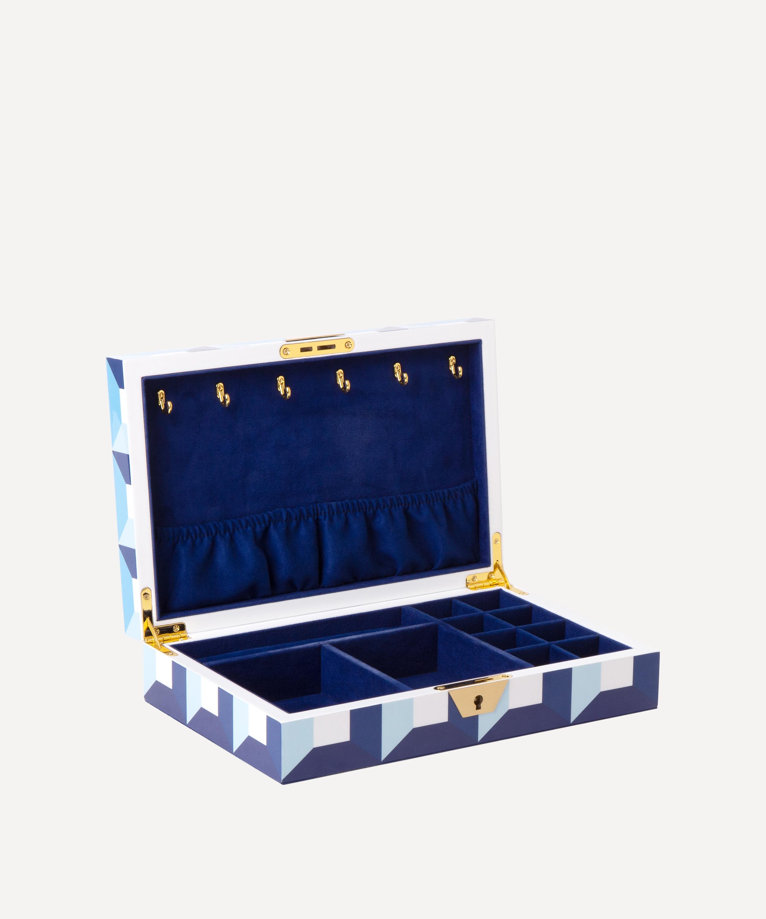 Presenting hand-finished patterns in glossy blue and white lacquer this jewellery box is finished with a lock and key for stashing valuables safely. This chic, cosmopolitan piece makes a perfect hostess gift, or arrange on a dressing table for a graphic accent that will elevate somewhat ordinary interiors.