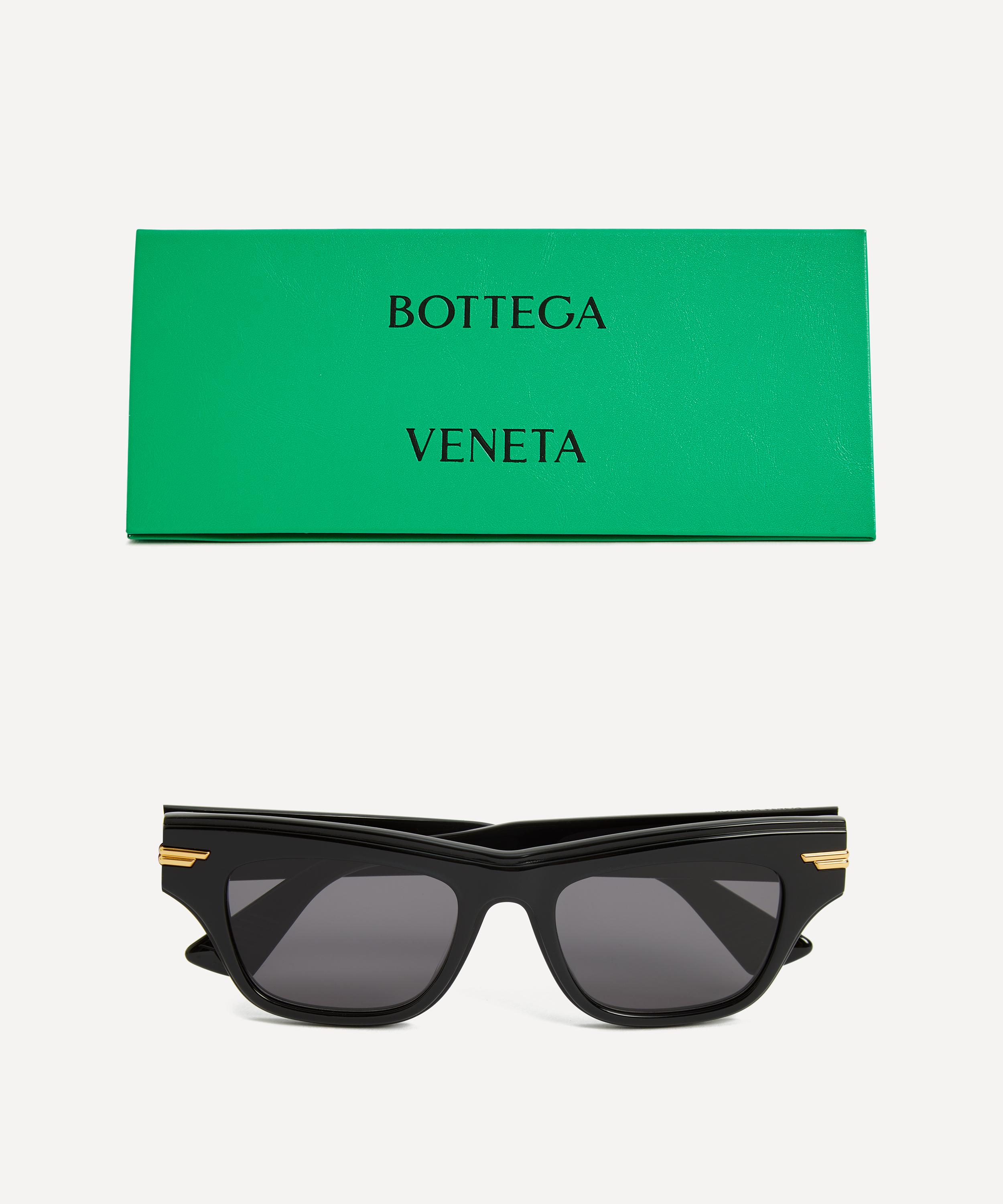 Elevate your style with these square sunglasses from Bottega Veneta for a touch of sleek Italian glamour. Featuring a chic, slightly angular shape, these shades are crafted from black acetate complete with grey-tinted lenses and gold-tone detailing to the rivets to take your look from ordinary to outstanding. They come with a protective case and cleaning cloth to preserve peak conditions.