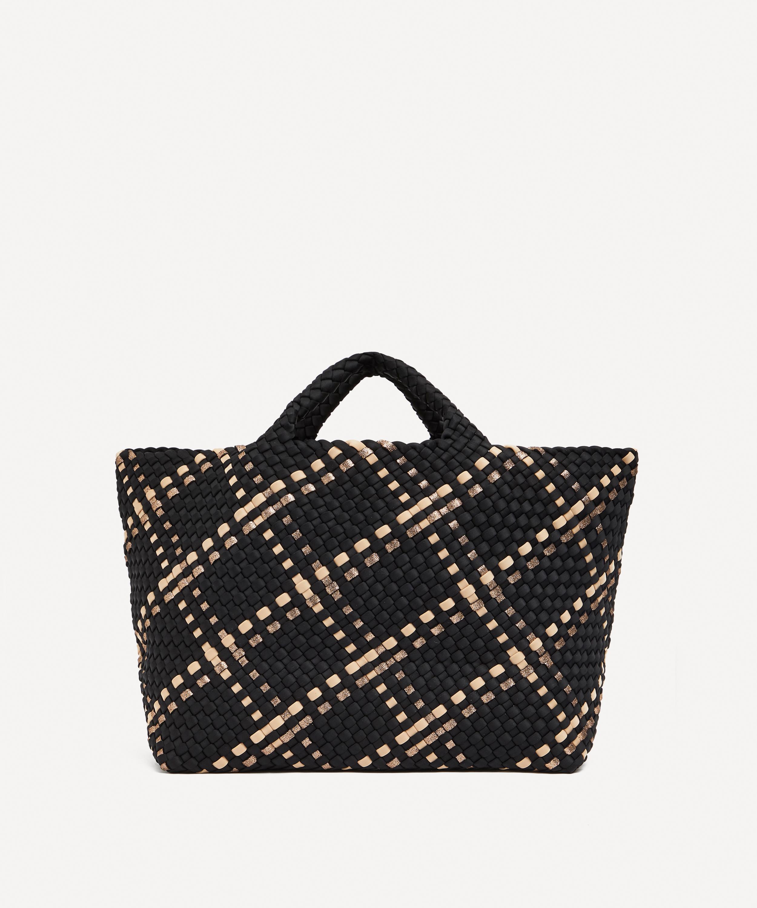 The St. Barths large plaid tote bag is hand-woven from durable neoprene fabric by New York-based accessories brand Naghedi.