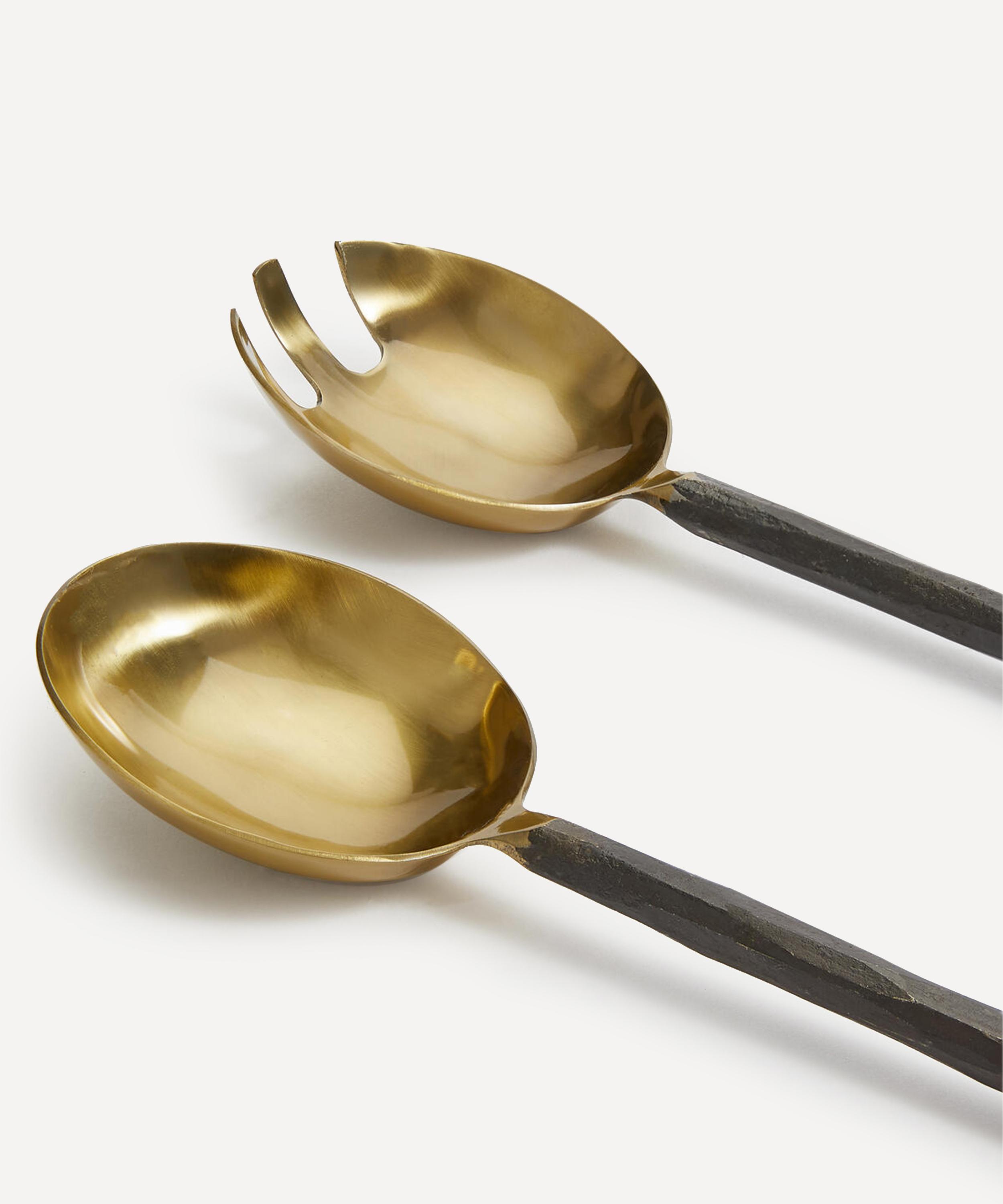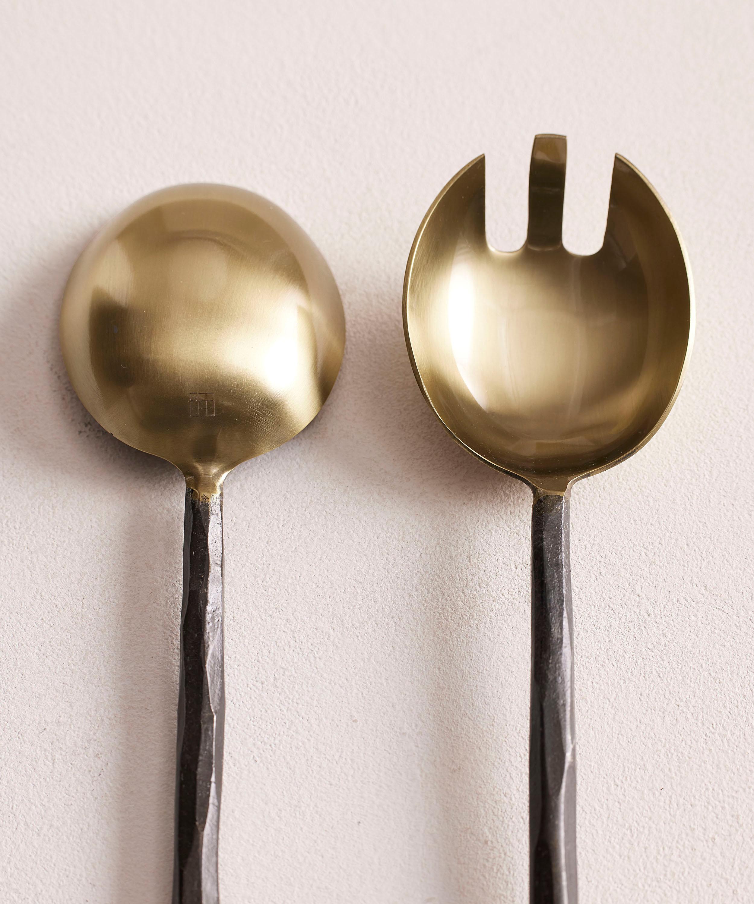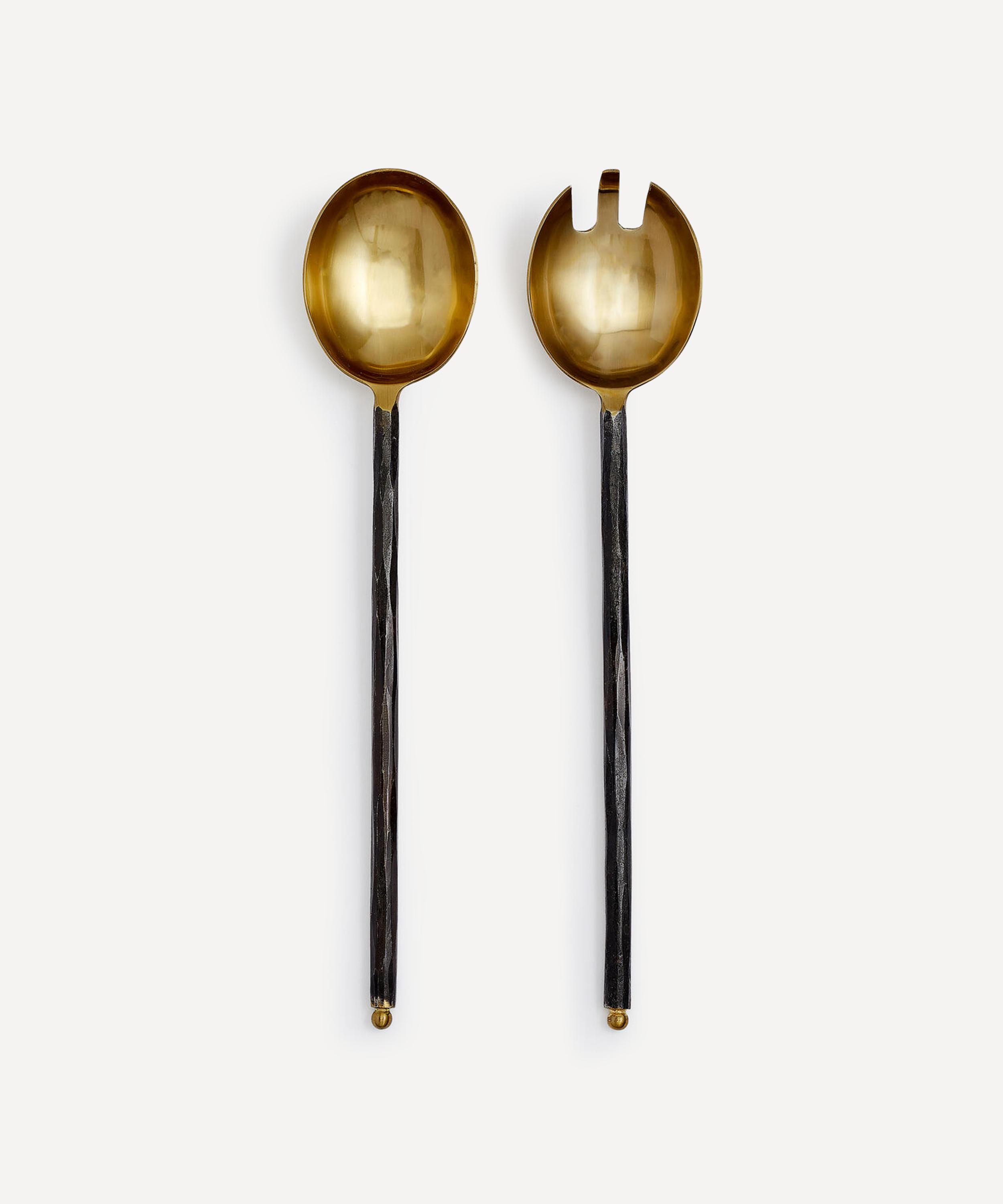 The heads of these spoons are carved from blacked brass reflecting an Art Deco aesthetic, while the forged steel handles add a rustic tactile quality. Elevate your tablescape by using them to serve salads or pasta at your next gathering.