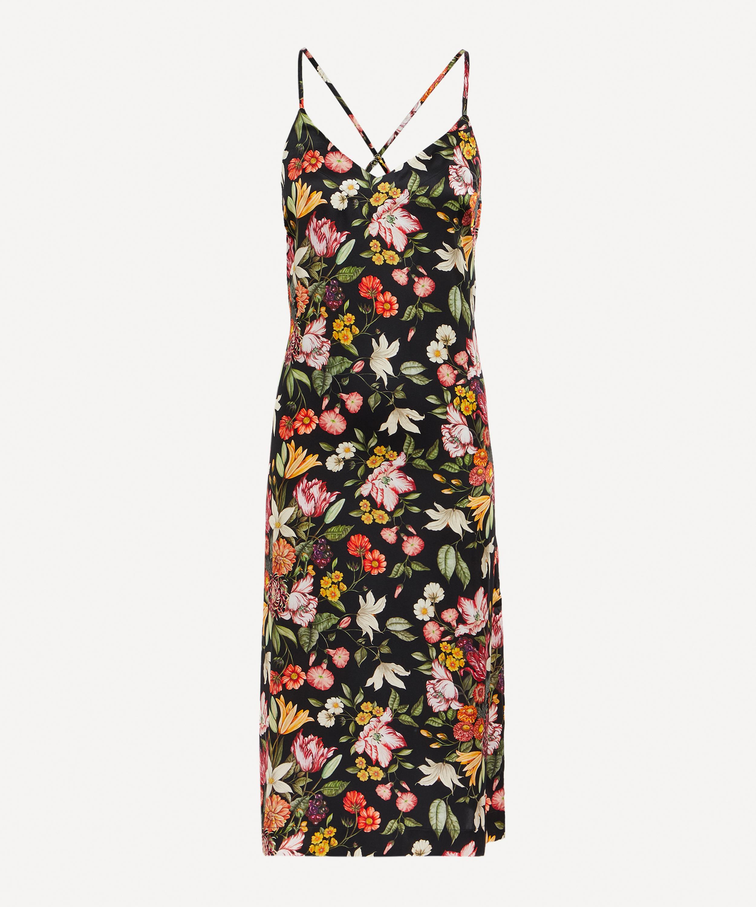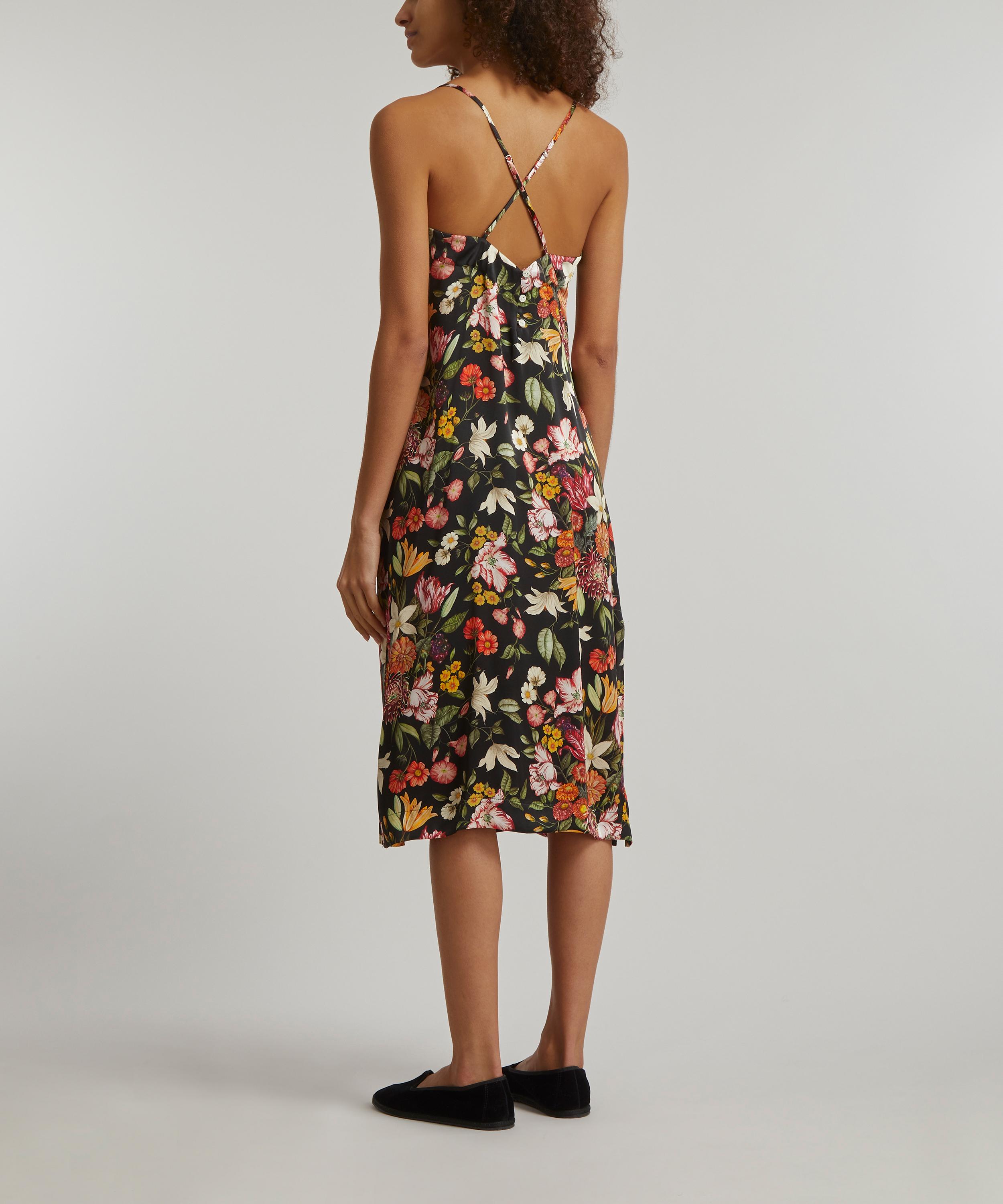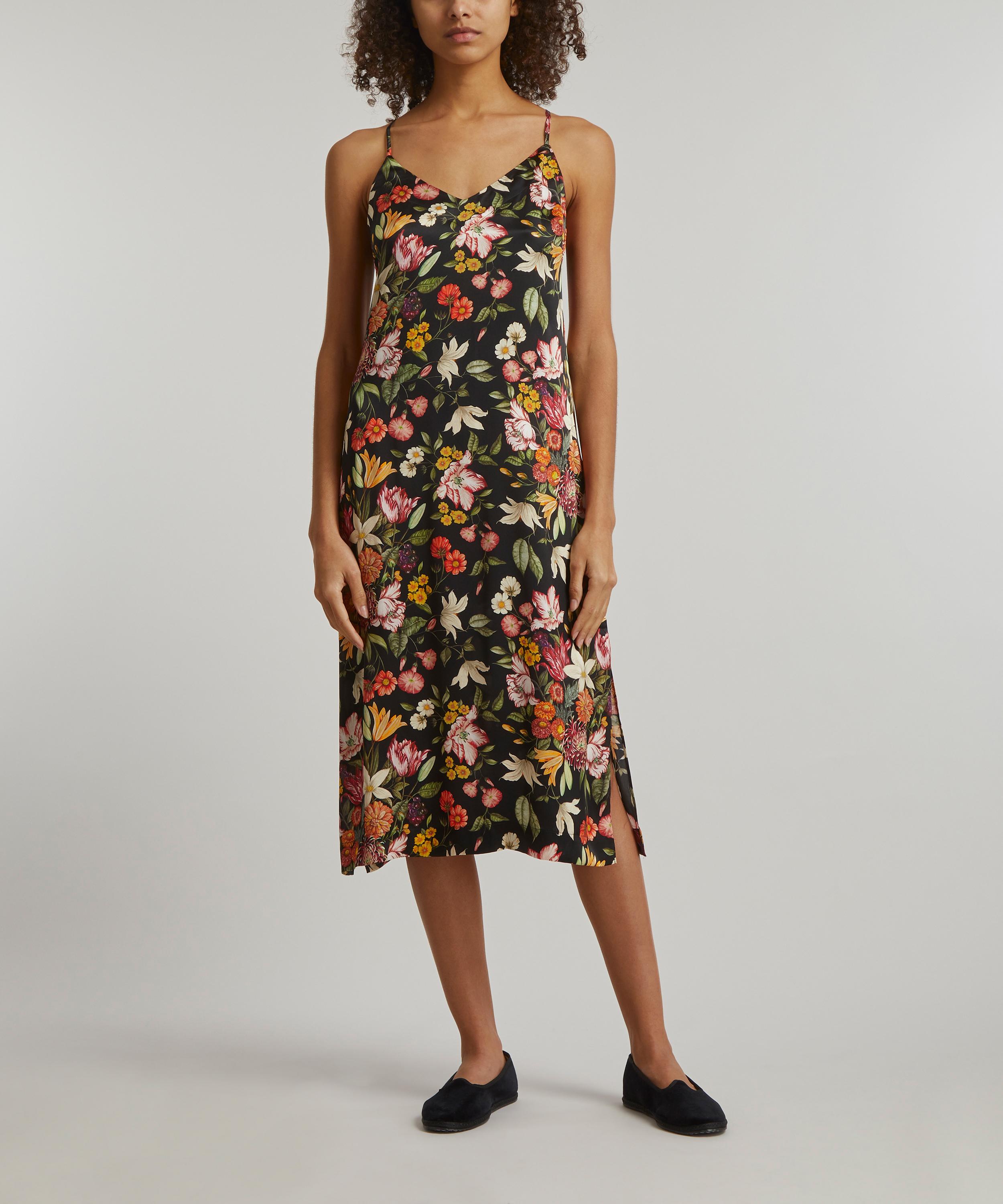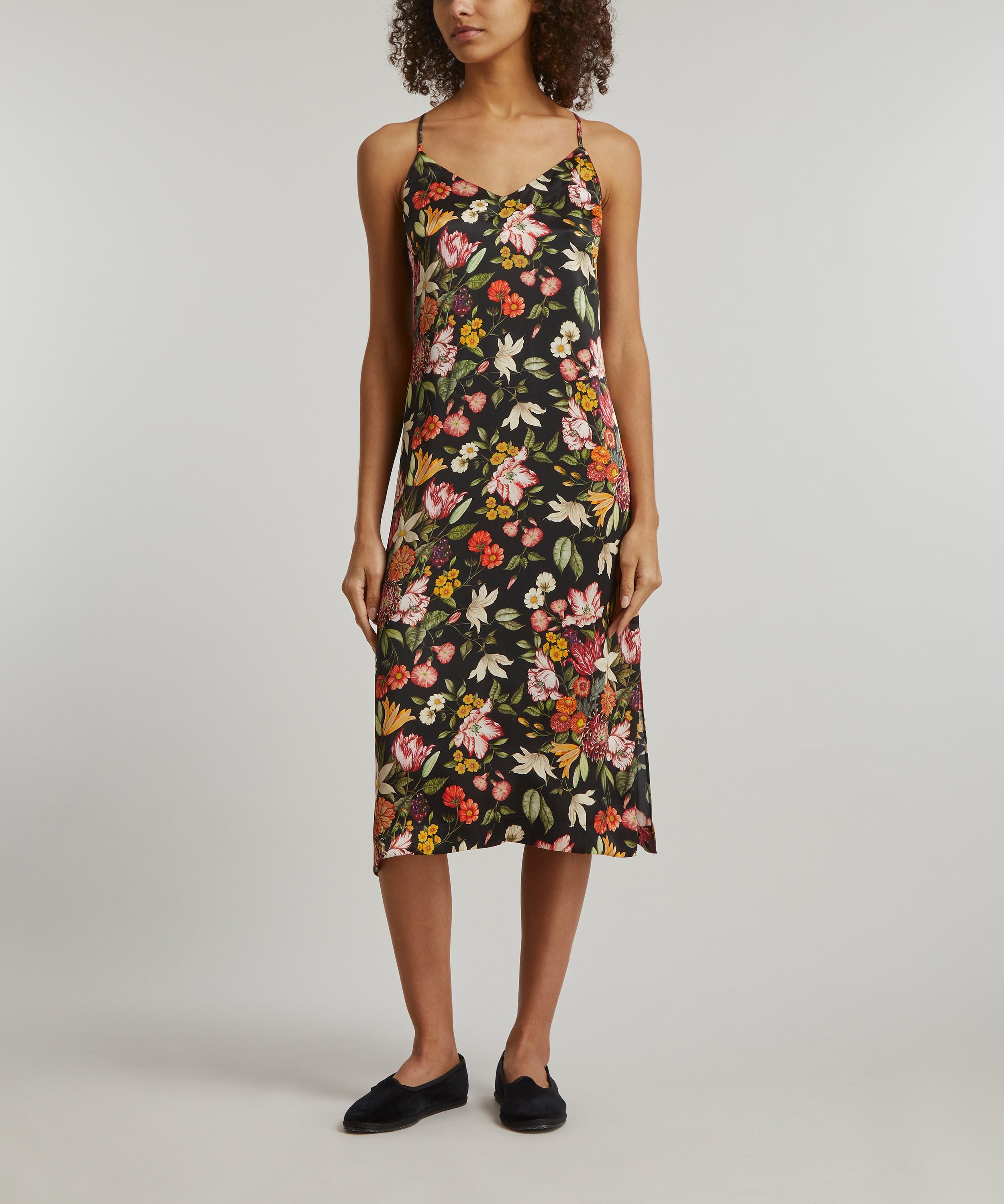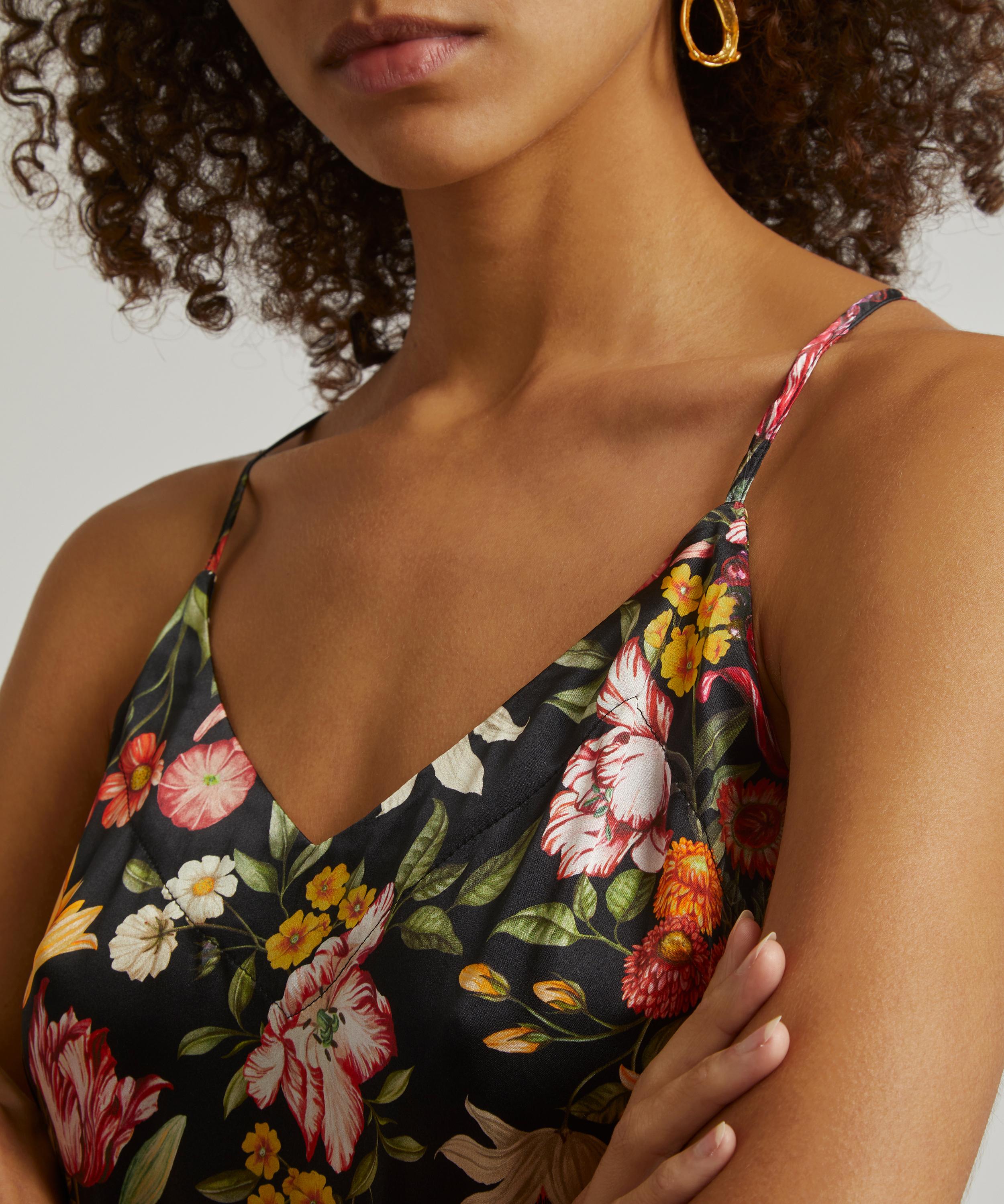 Cut to a midi length silhouette with a slight A-line shape, Liberty’s silk satin chemise captures the mood for lounge-worthy pieces that are versatile enough to be worn day or night. Finished with adjustable straps which cross over at the back, this luxurious nightie spotlights our Stately Bouquet print – inspired by photorealistic Dutch paintings of extravagant blooms in ornate vases, the design is reminiscent of floral displays found in grand estate houses. Slip it on for a luxurious slumber, or style with a roll-neck or plain tee for layered ready-to-wear appeal.