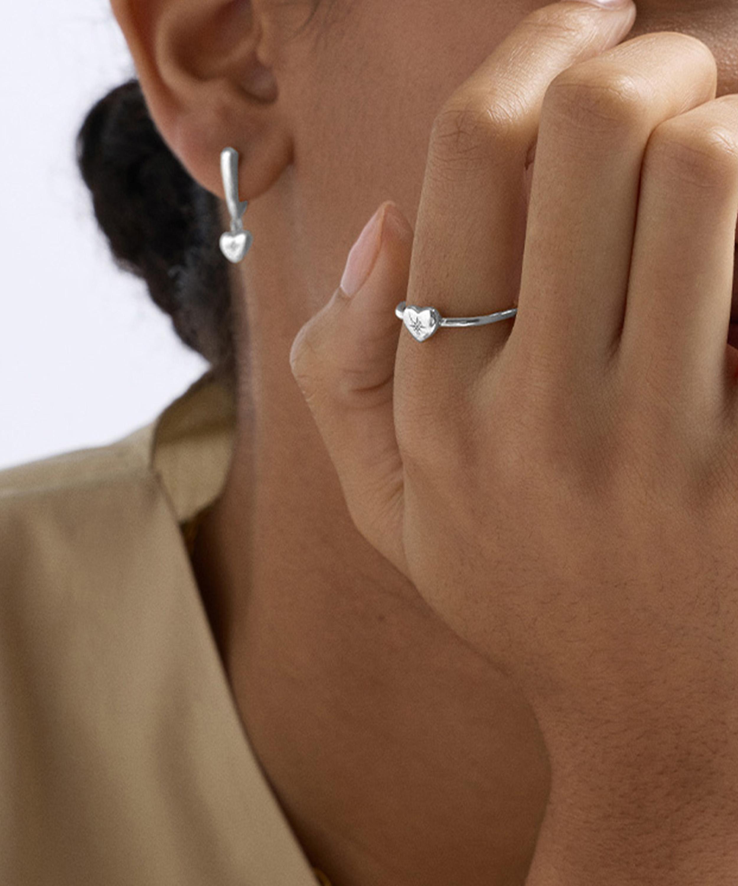 Crafted from rhodium-plated sterling silver, it features a slim, polished band and a heart-shaped feature, adorned with the brand’s signature north star motif, set with a sparkling white sapphire. Designed to be stacked with the Biography Heart Ring Jacket for a layered look, it’s equally beautiful worn as a solo piece.
