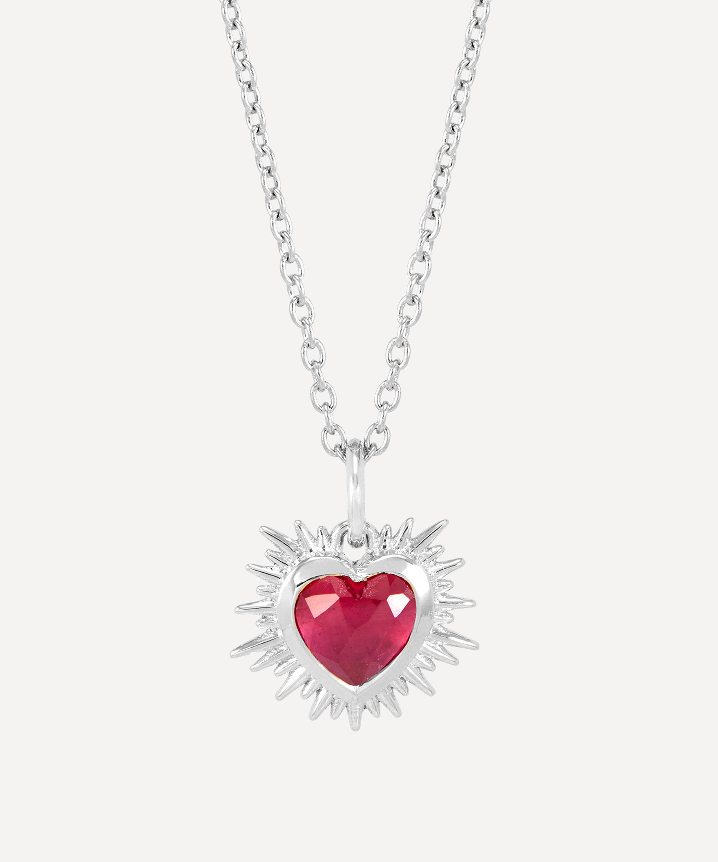 Crafted from sterling silver, it features a classic rolo chain and a bursting heart pendant adorned with the collection’s signature Art Deco rays and a hand-carved ruby – a July birthstone, thought to bring the wearer love and courage. Style it solo, or team it with other pieces from the brand for a head-turning edit.