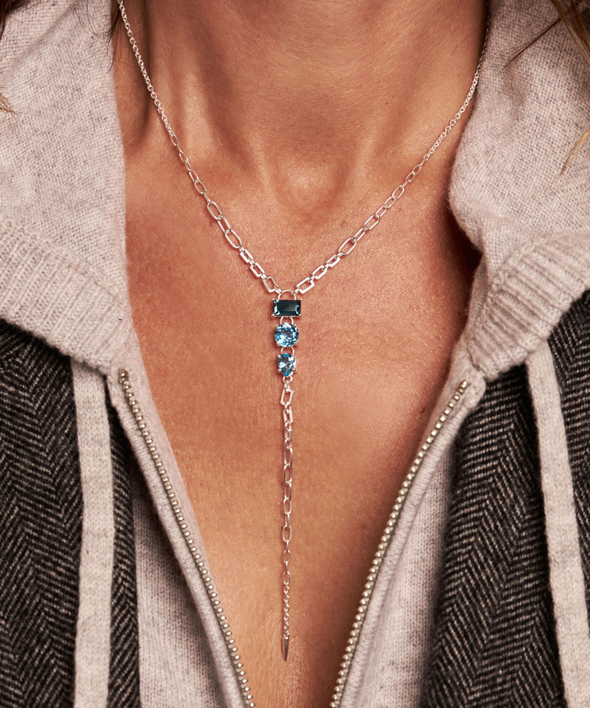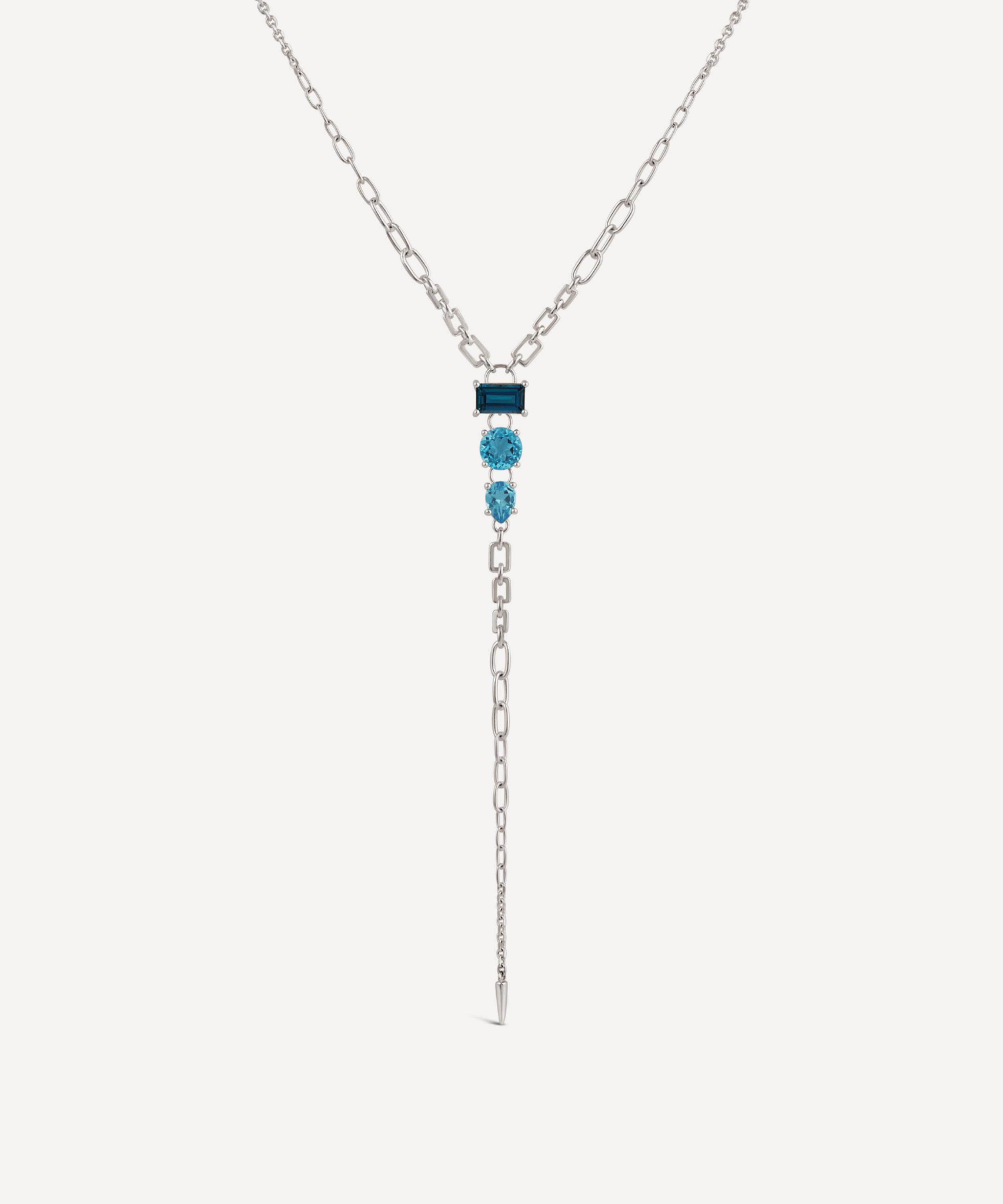 A modern day interpretation of Art Deco Glamour, this lariat necklace is part of Dinny Hall’s Get-Set collection – inspired by the rebellious Flapper girls of the 1920s. Crafted from sterling silver, it features a mixed chain set with a trio of semi-precious gemstones, including an emerald cut London blue topaz, and a round brilliant cut Swiss blue topaz and a pear cut blue topaz. Complete with a mixed chain drop, style it with a matching bracelet and earrings from the collection for a fully coordinated look.