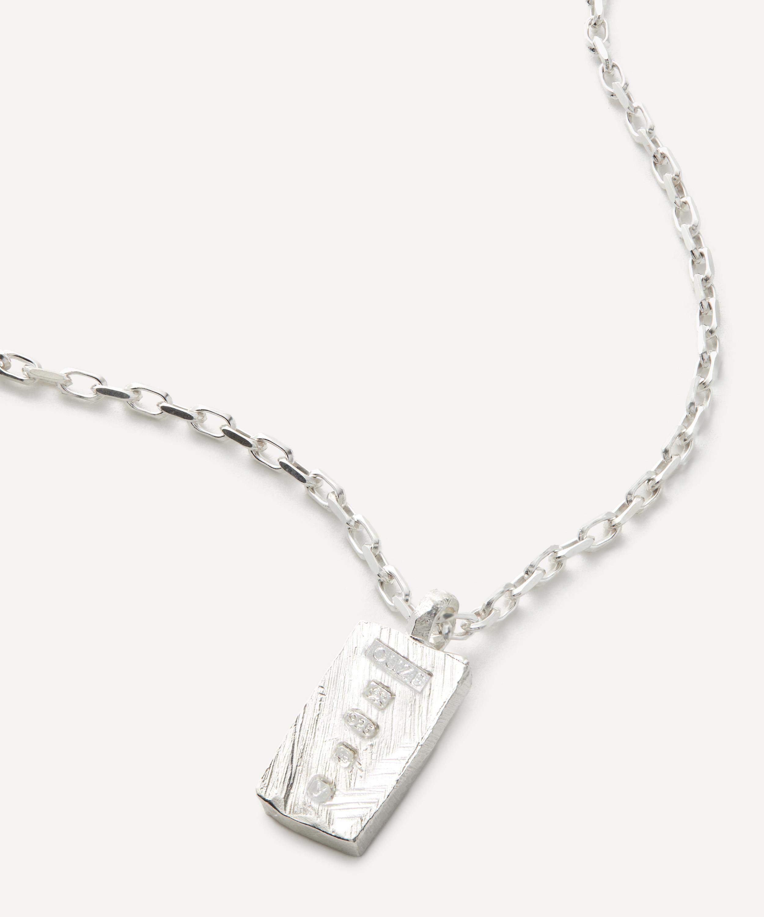 Amp up elegant ensembles and everyday looks with the Hallmark Ingot pendant necklace from The Ouze. Embracing the beauty in imperfection, this pendant features a rugged slab of sterling silver accented with traditional British hallmarking. Complete with a diamond cut belcher chain, stack it with other necklaces, or pair with one of the brand’s many statement rings.