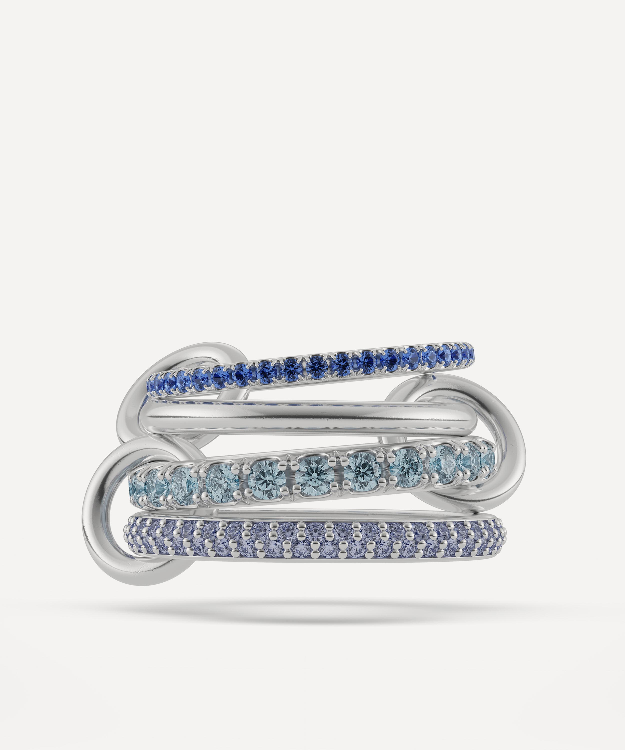 Build the perfect elevated ring stack and create your unique style with the Iris ring from Spinelli Kilcollin. Renowned for their clean, conceptual and innovative designs, this contemporary piece features an interconnected silhouette composed of four bands of varying gauges in sterling silver, three of which are set with pavé-set blue sapphires, aquamarine and tanzanite stones – mirroring the spectrum of blue tones found in cascades of iris pearls. Two tactile sterling silver connectors link each band together – encouraging the ring to be worn spread across multiple fingers, or stacked as a sculptural whole.