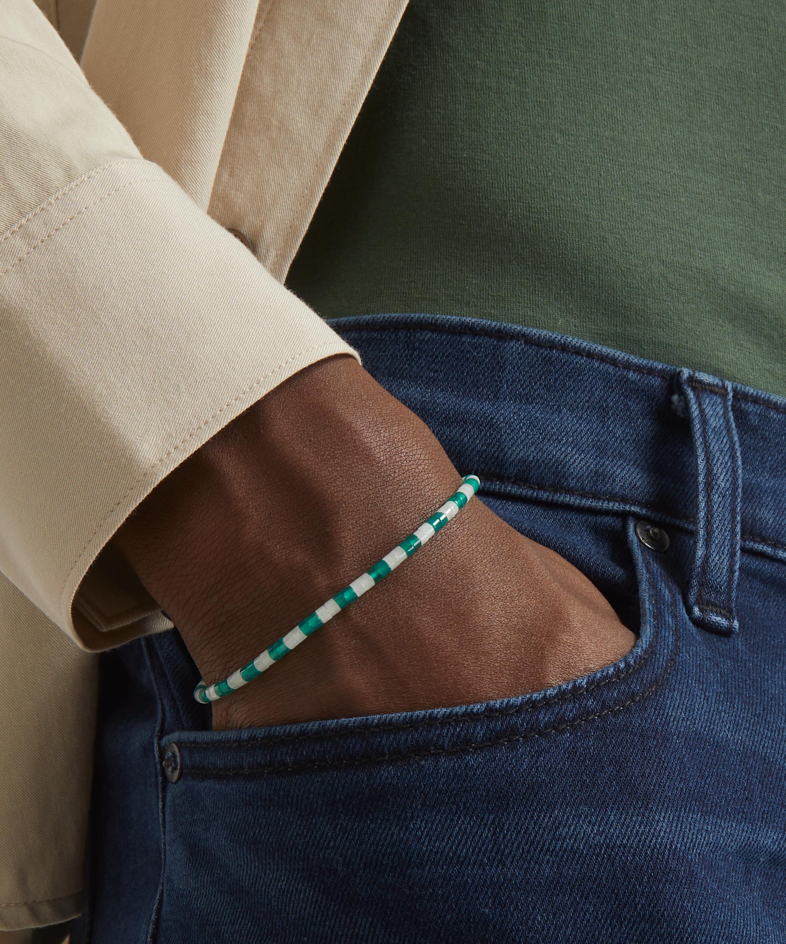 The Kai bracelet from Miami-based lifestyle label Miansai adds just the right amount of colour to any subdued attire. A lightweight bracelet to incorporate into your accessory arsenal, it features a single string composed of moonstone and green agate stones, in an alternating pattern. Complete with a small button and loop closure, it is perfect for pairing with plain cotton shirts for easy everyday appeal.