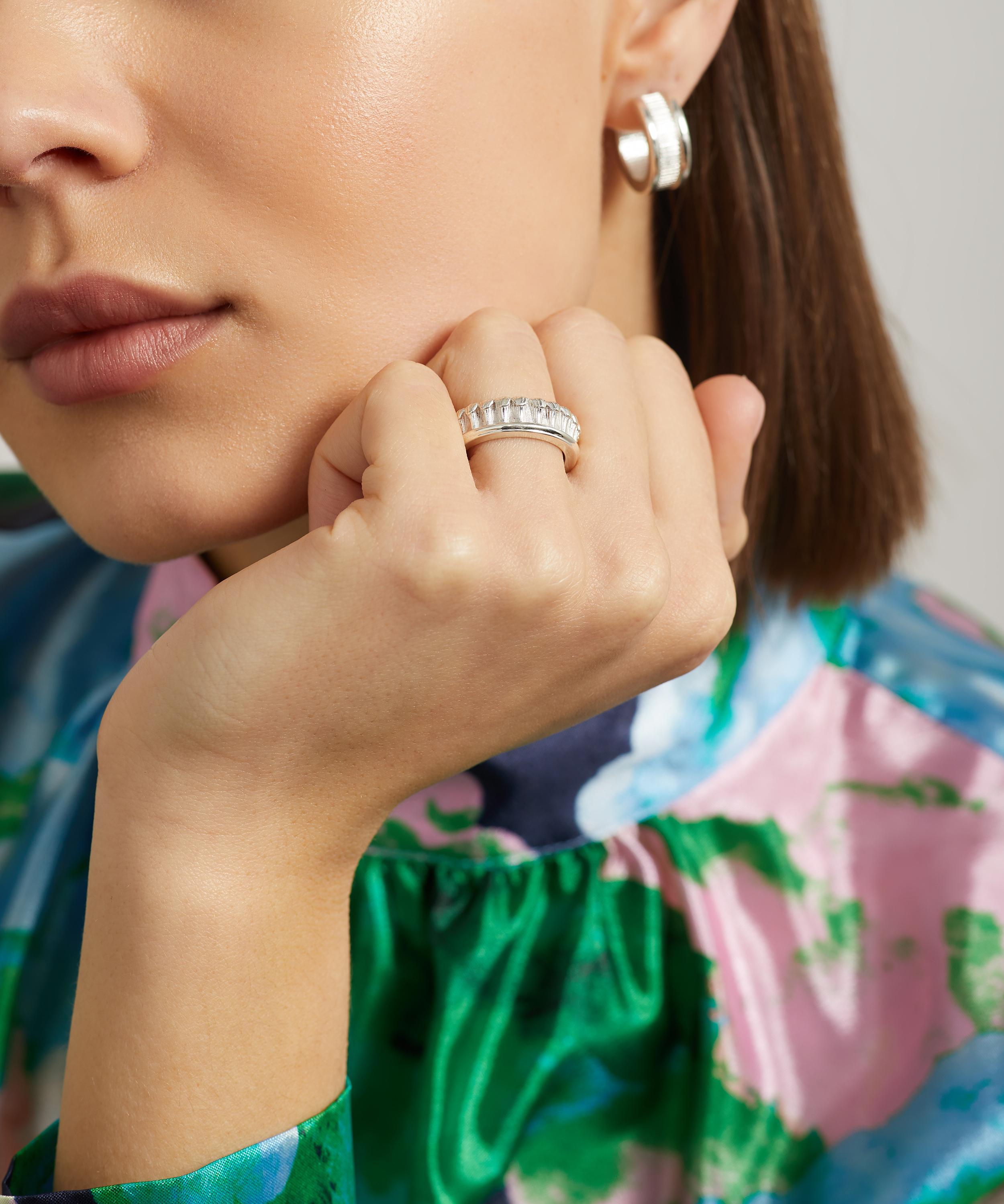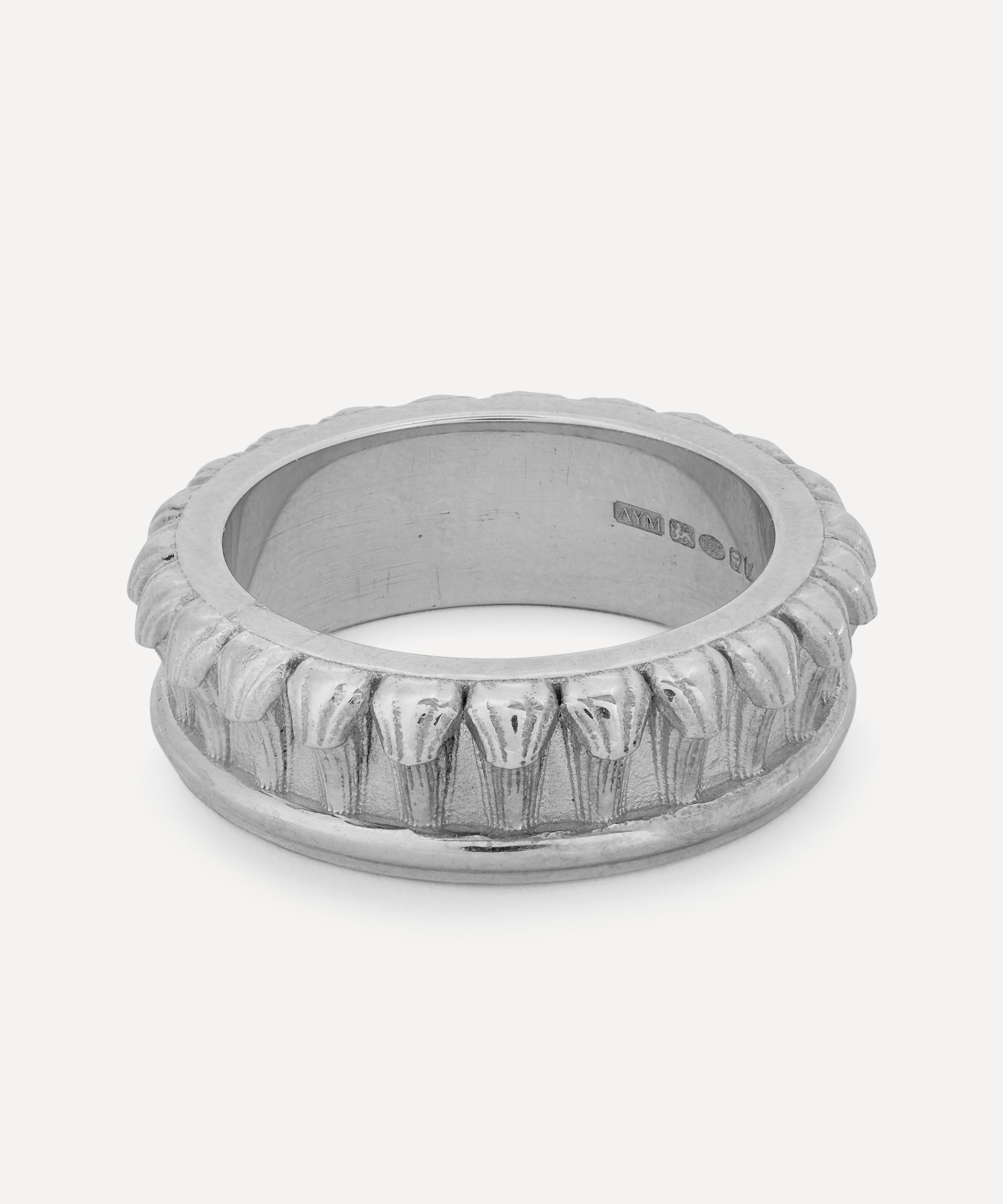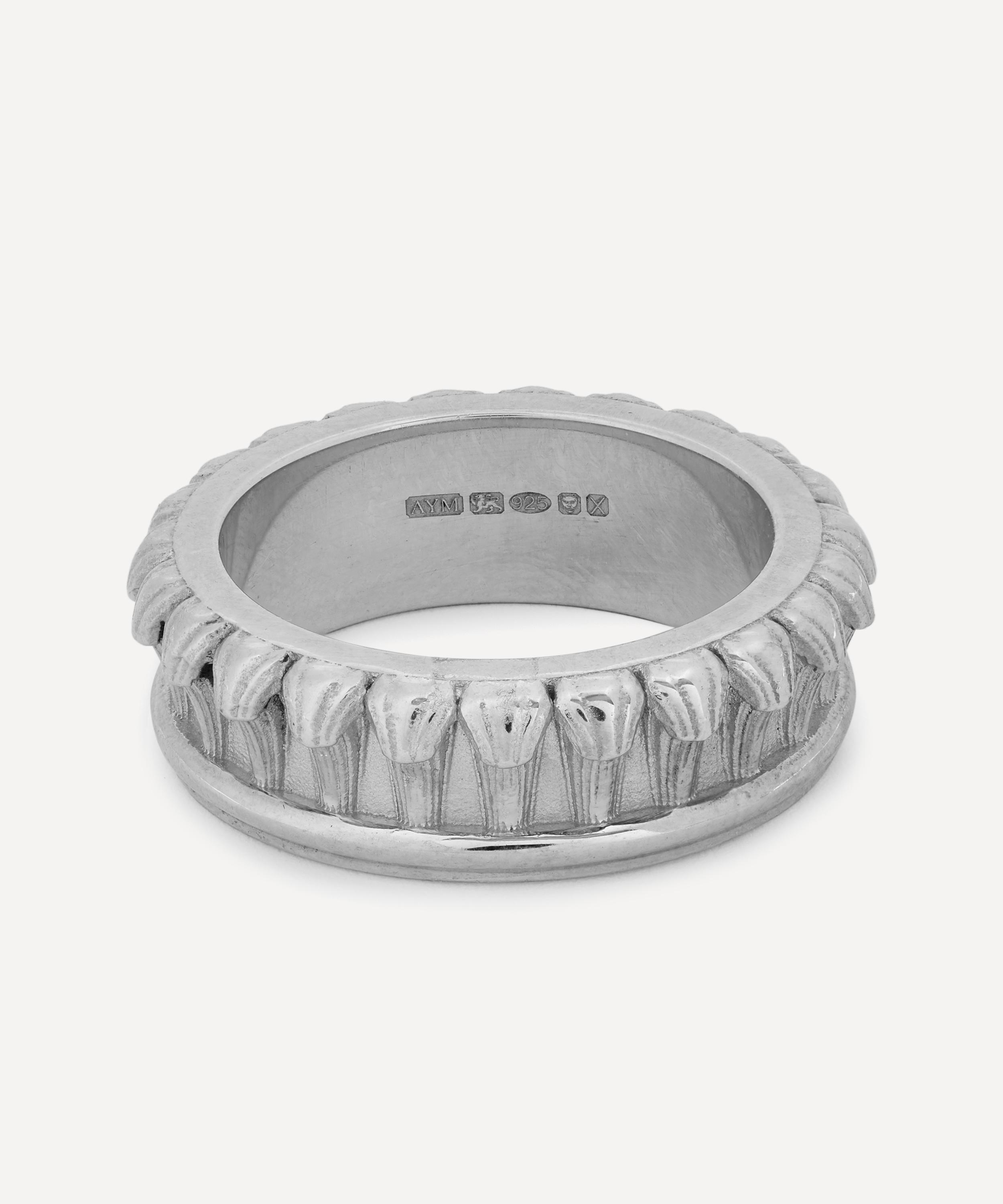 This intricate silver ring is part of Aymer Maria’s debut collection Pilastro, featuring earrings, rings, and neckpieces inspired by ancient Greco-Roman architecture. Hand-crafted from sterling silver this ring takes cues from the Corinthian order of Ancient Greek architecture – characterised by fluted columns and ornate capitals. Style this collector’s piece solo, or pair it with additional bands from the brand to build your own enchanting ring stack.