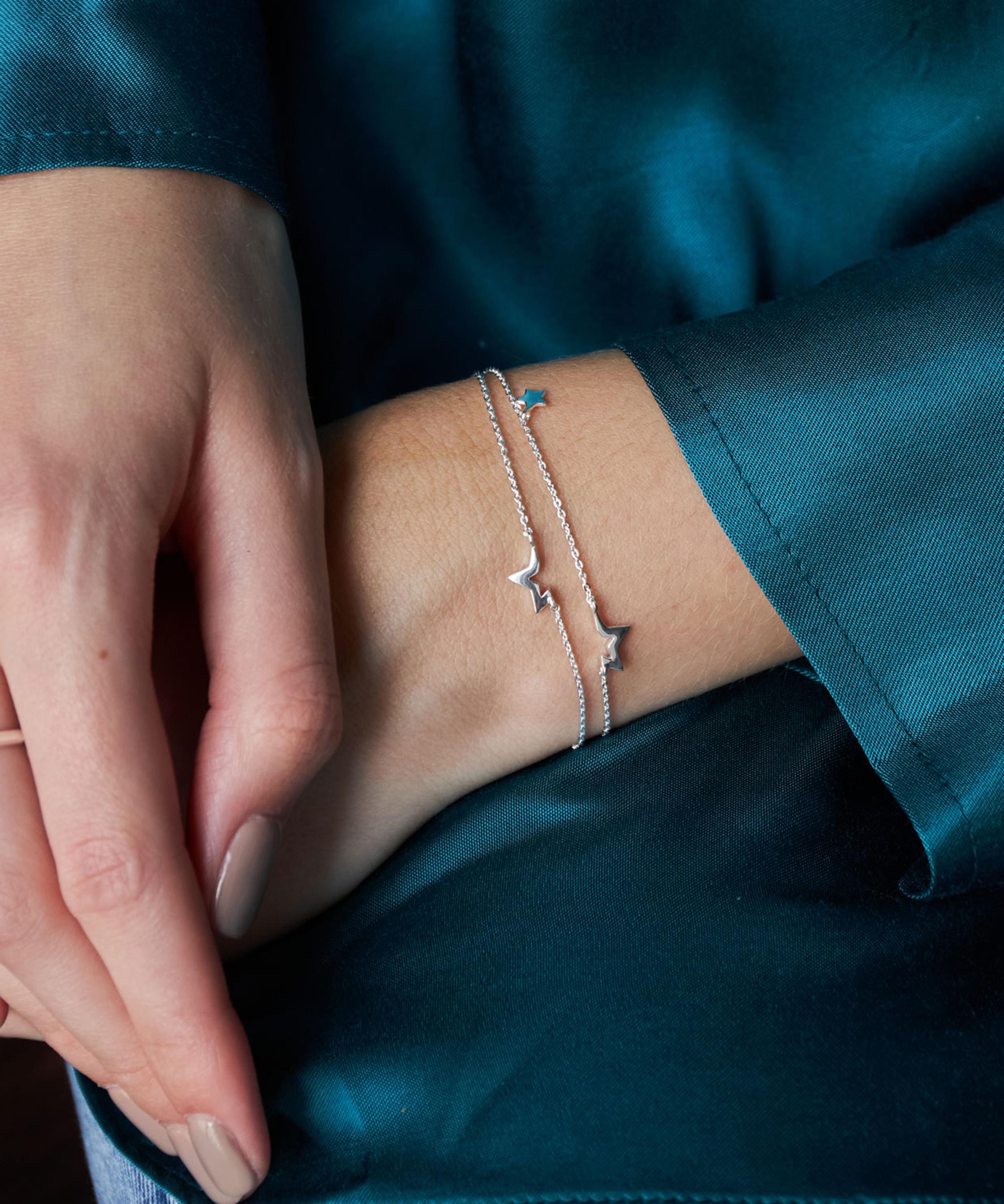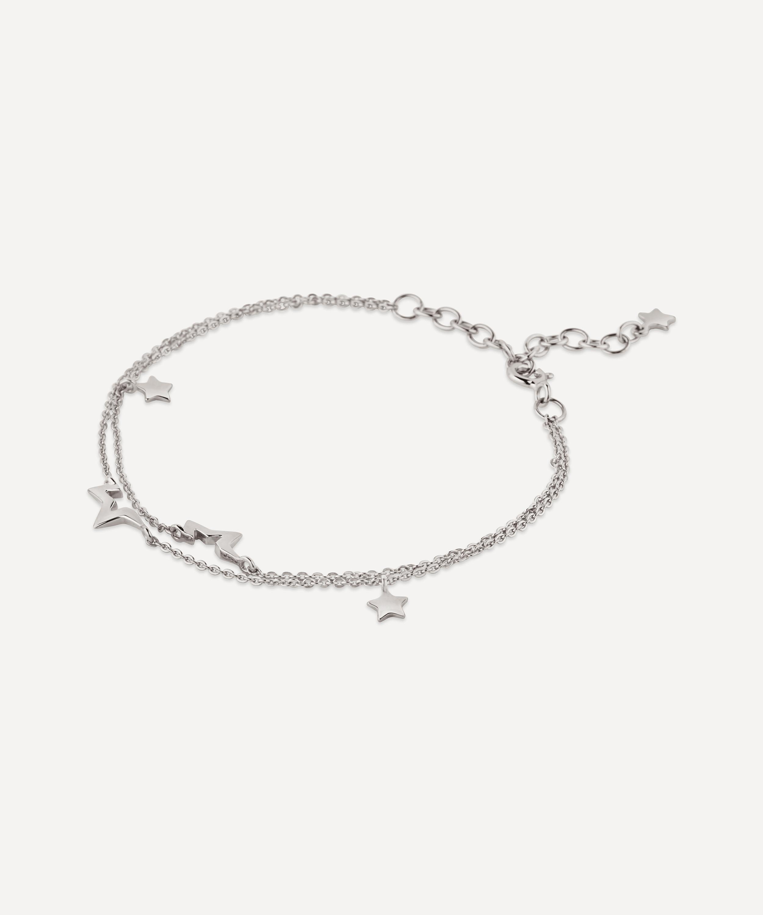 This double chain wristlet bracelet is part of Dinny Hall’s Stargazer collection – a cosmic series inspired by teenage dreams, hopes and the glamorous shape of the star. Crafted in sterling silver, it features a diamond cut trace chain adorned with two full star charms, and two deconstructed half stars. Ideal for layering, team it with additional chains for a trend-led finish.