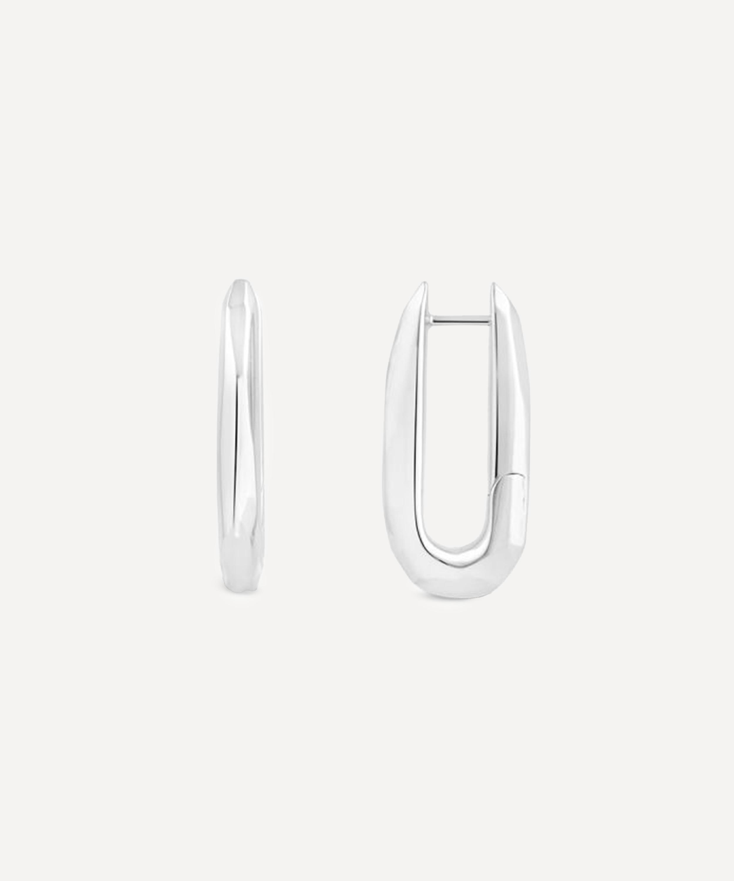 Crafted from sterling silver, these earrings have been hand-carved in wax and moulded into an elongated, oval silhouette with a faceted design. Complete with a polished finish, they boast a reimagined take on a classic staple – wear them solo for a minimal approach or stack them with other hoops for a layered curation.