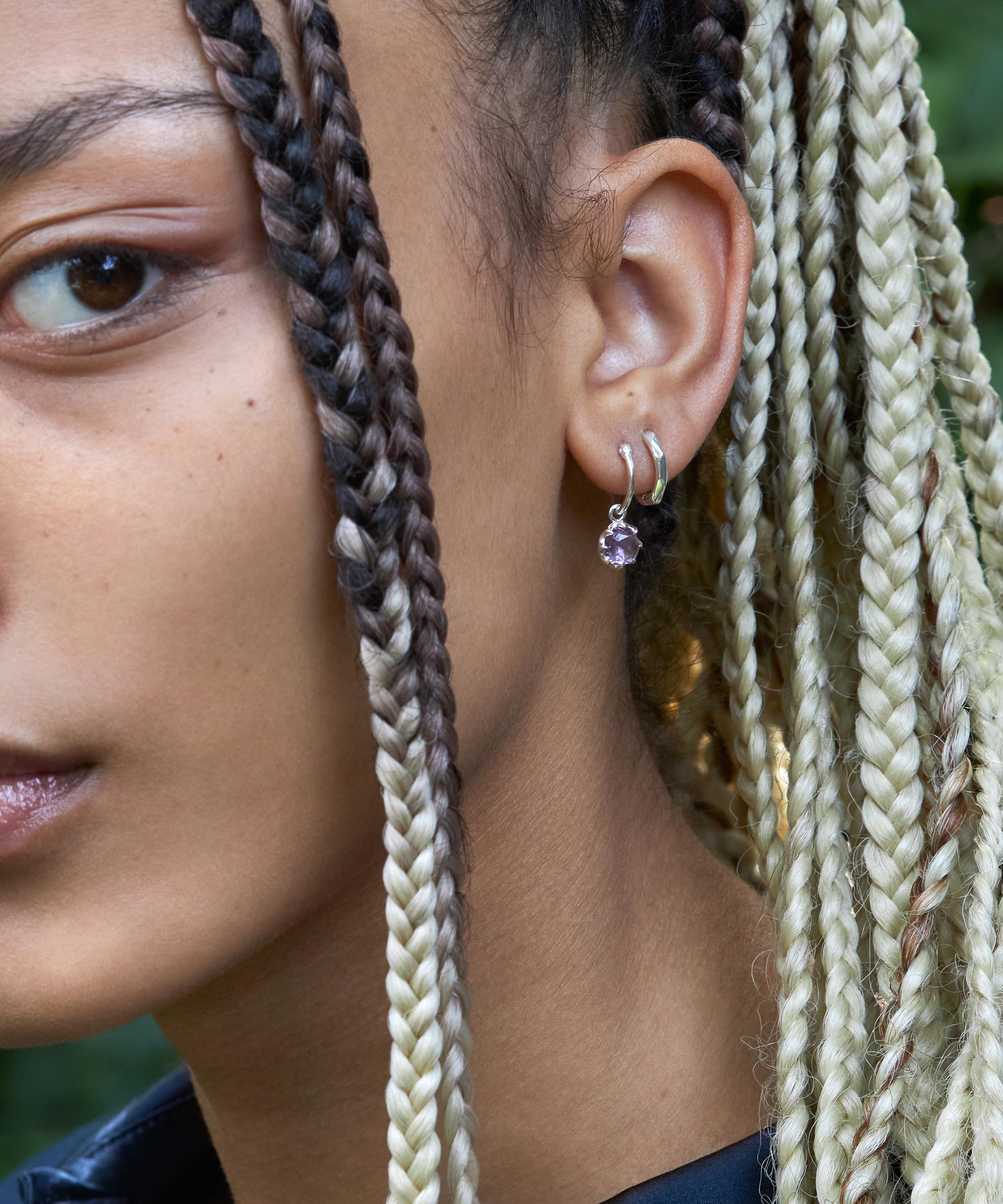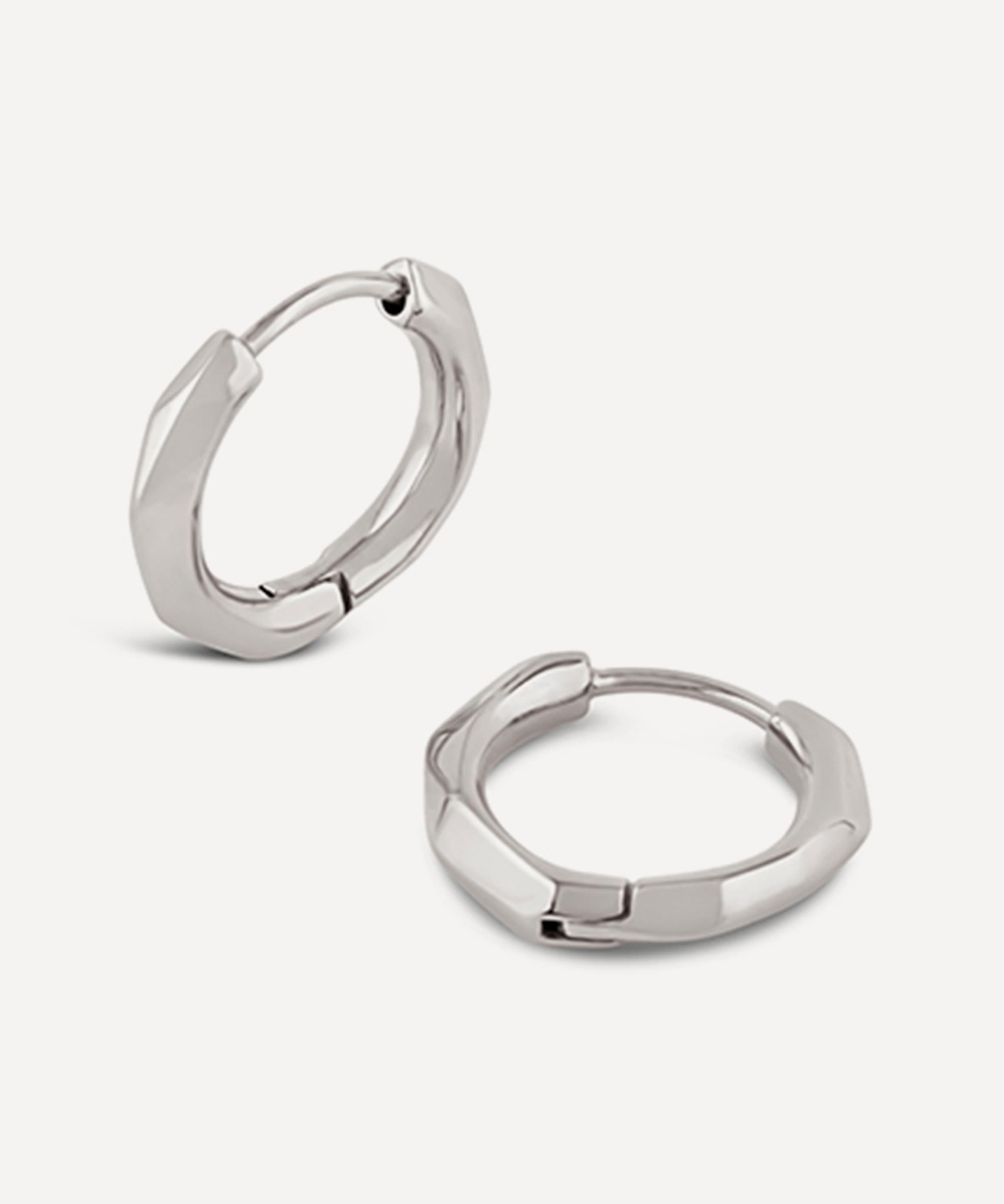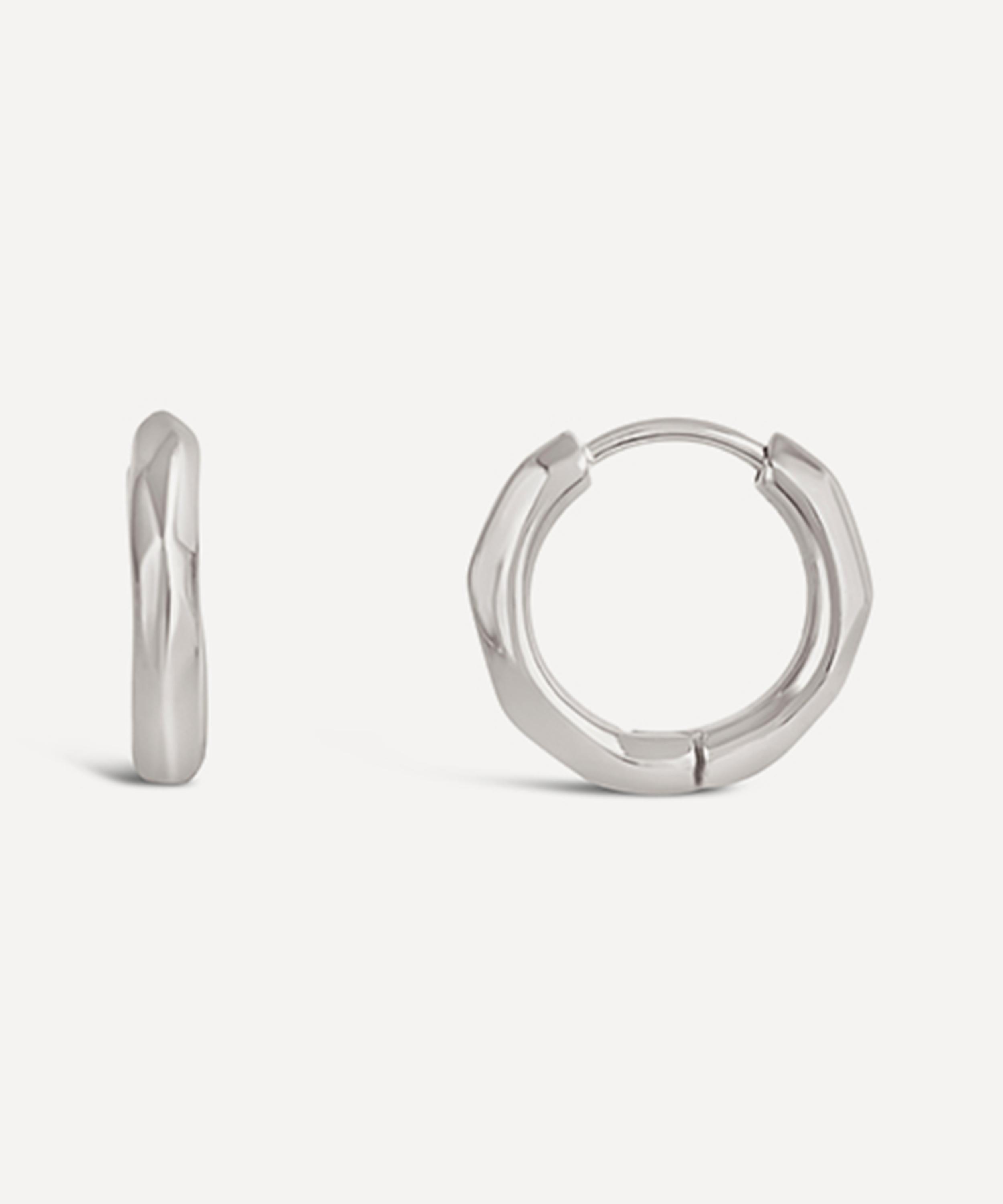 Crafted from recycled sterling silver, these earrings have been hand-carved in wax and moulded into a faceted, hoop silhouette – offering a textured style to the piece. Complete in a high-polished finish and classic hoop lock fastening, they boast a reimagined take on a classic staple – wear them solo for a minimal approach, or stack them with different sized hoops for a trend-led finish.