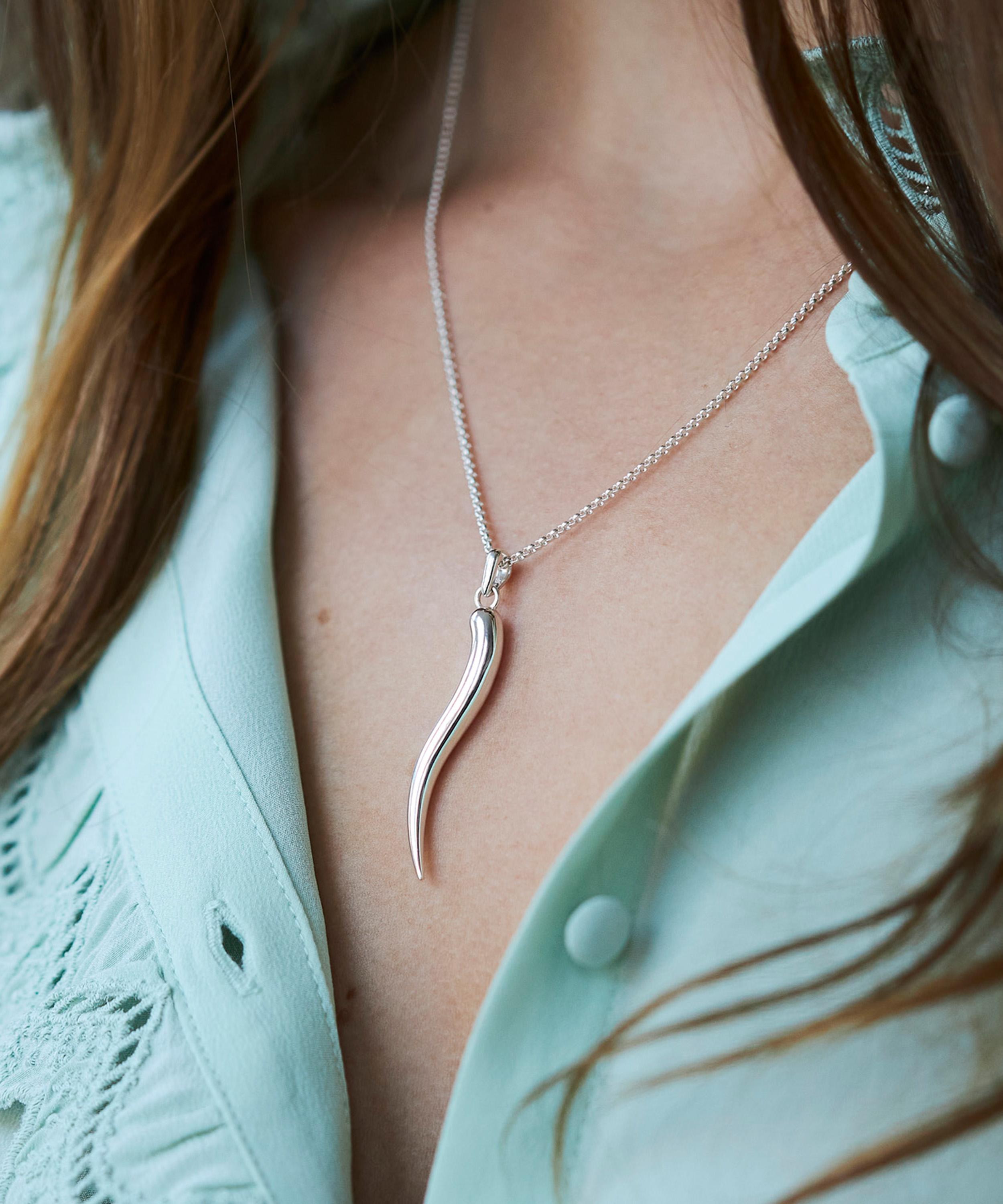 Empower your self-expression and unique style with Dinny Hall’s emblematic Toro Horn pendant necklace. Crafted from sterling silver, this exceptional piece of jewellery features an elegant horn pendant – inspired by the Italian cornicello horn - suspended from a timeless rolo chain. A symbol of protection and good fortune, it’s perfect for gifting. Style it on its own, pair with matching pieces from the collection or layer with another silver necklace, chains and talismans to add depth and dimension to your look.