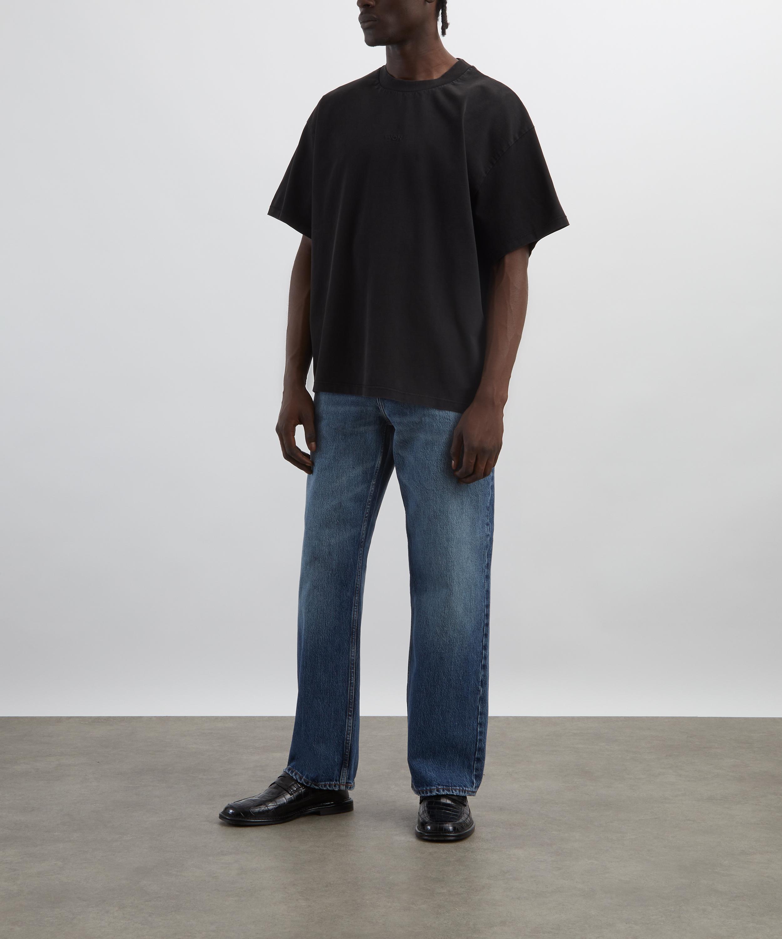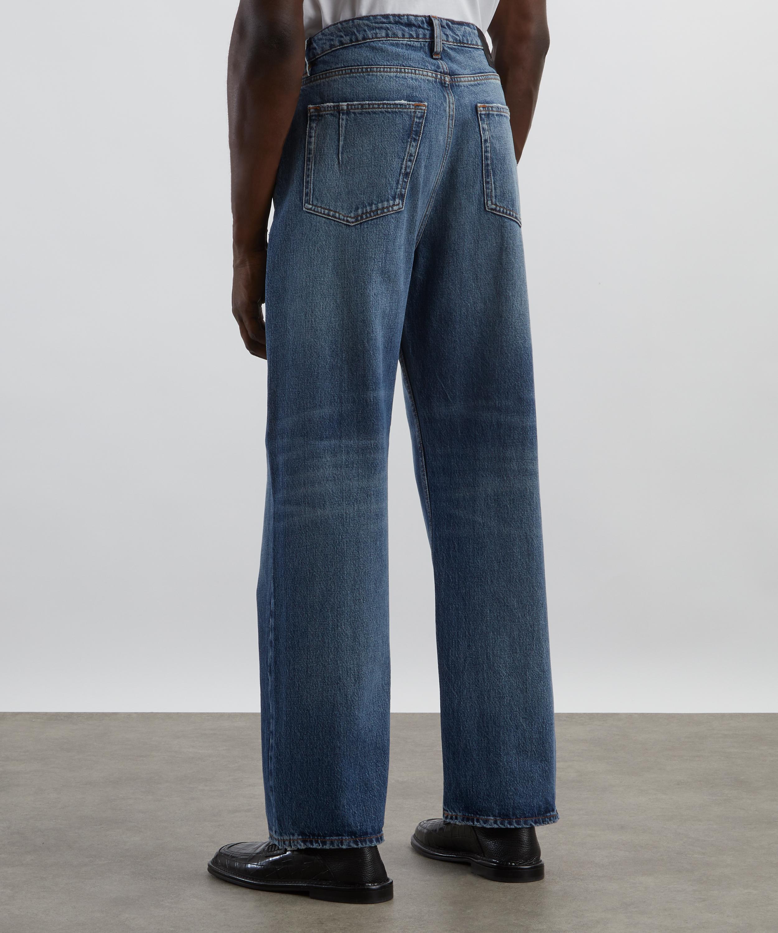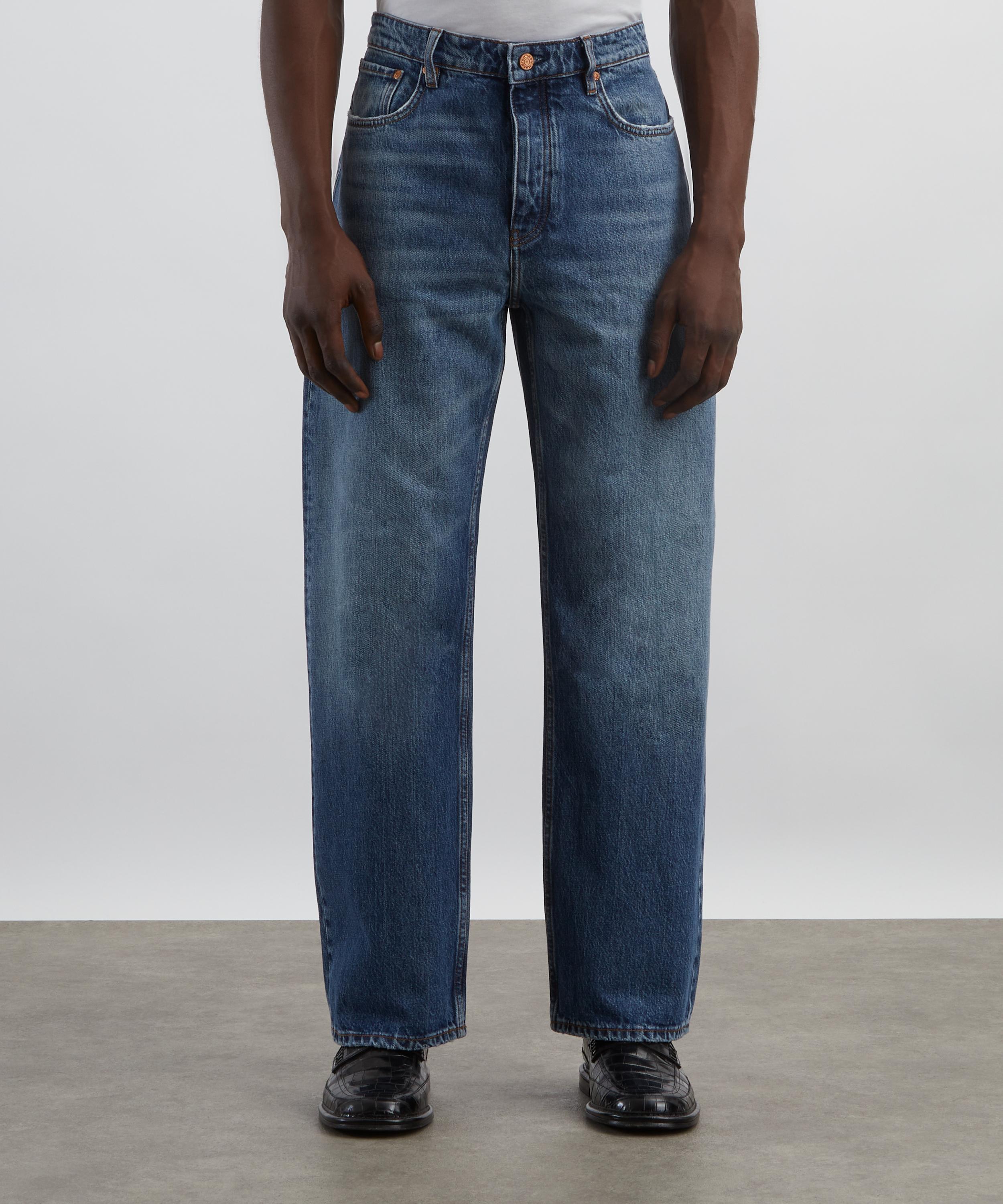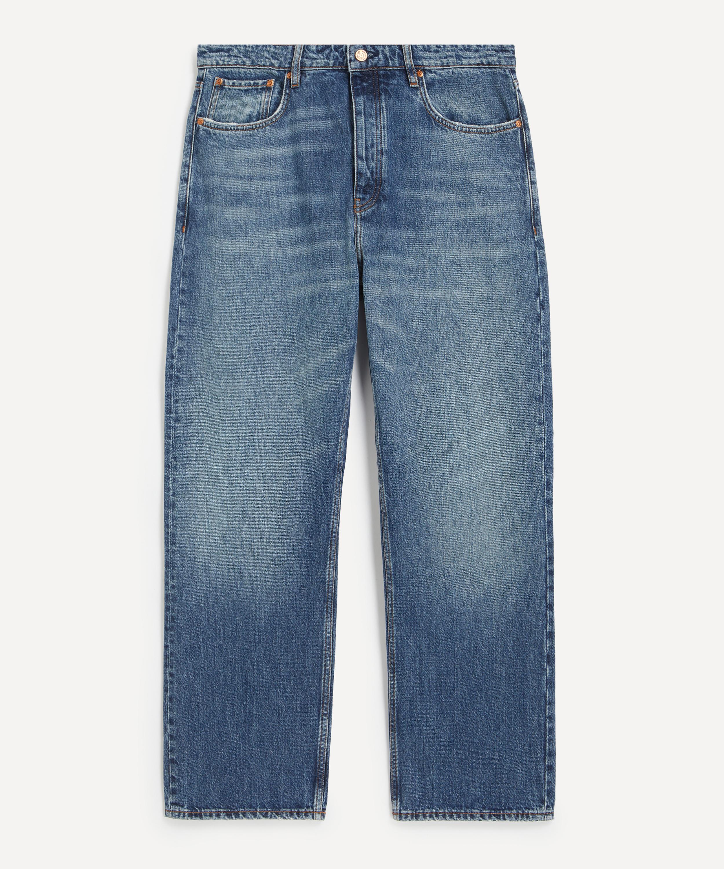Crafted from rigid cotton denim in a vintage, washed-out blue hue, Steve features a loose fit with a mid-rise waist and straight leg. Branded logo buttons and a leather jacron patch at the back add a signature finish.