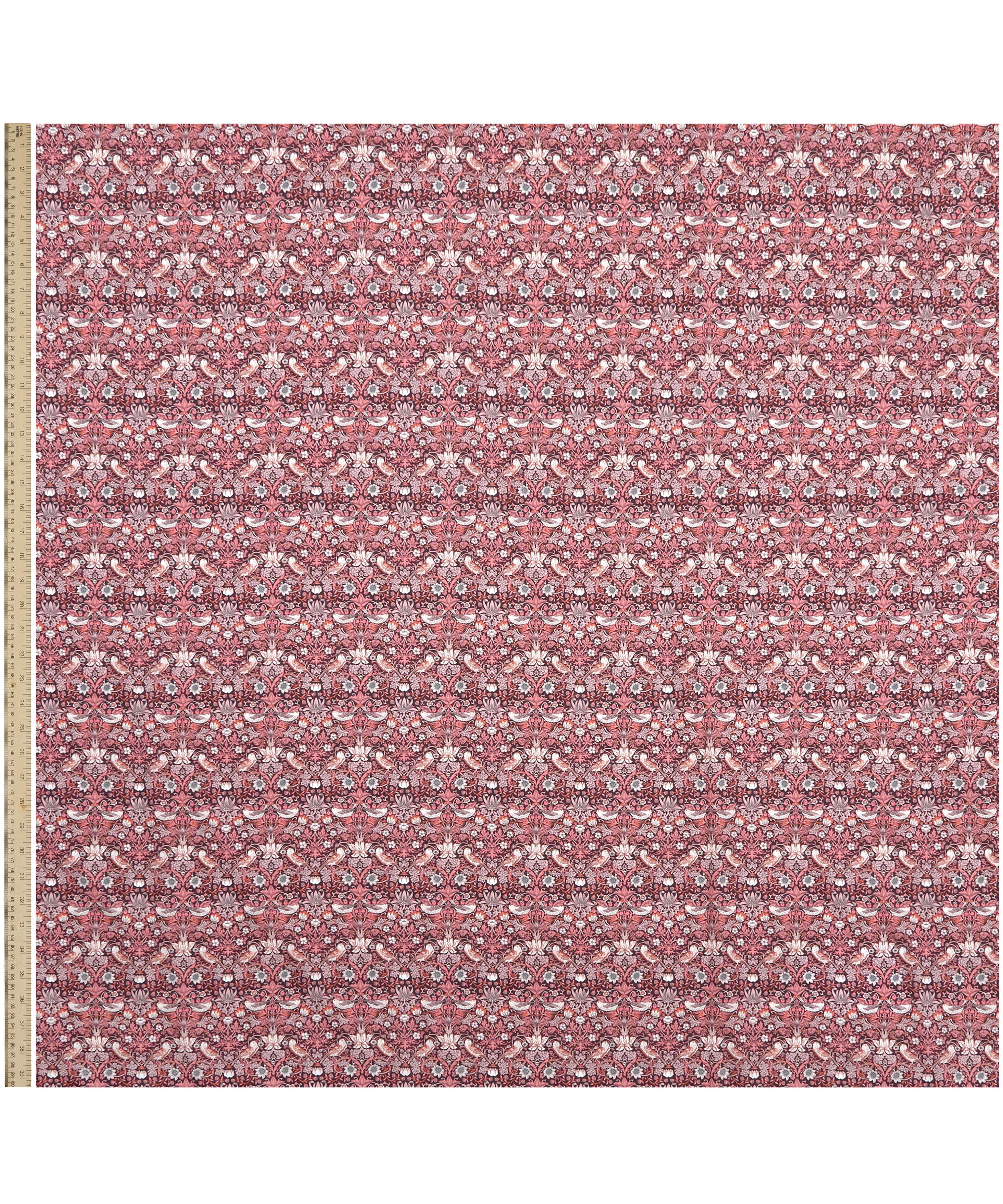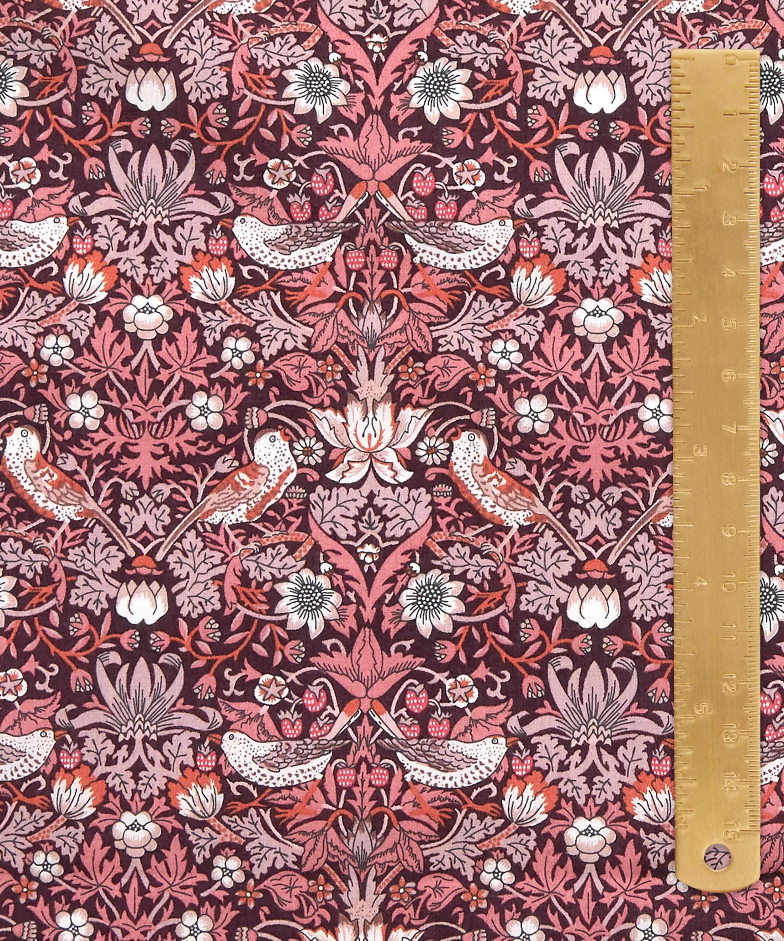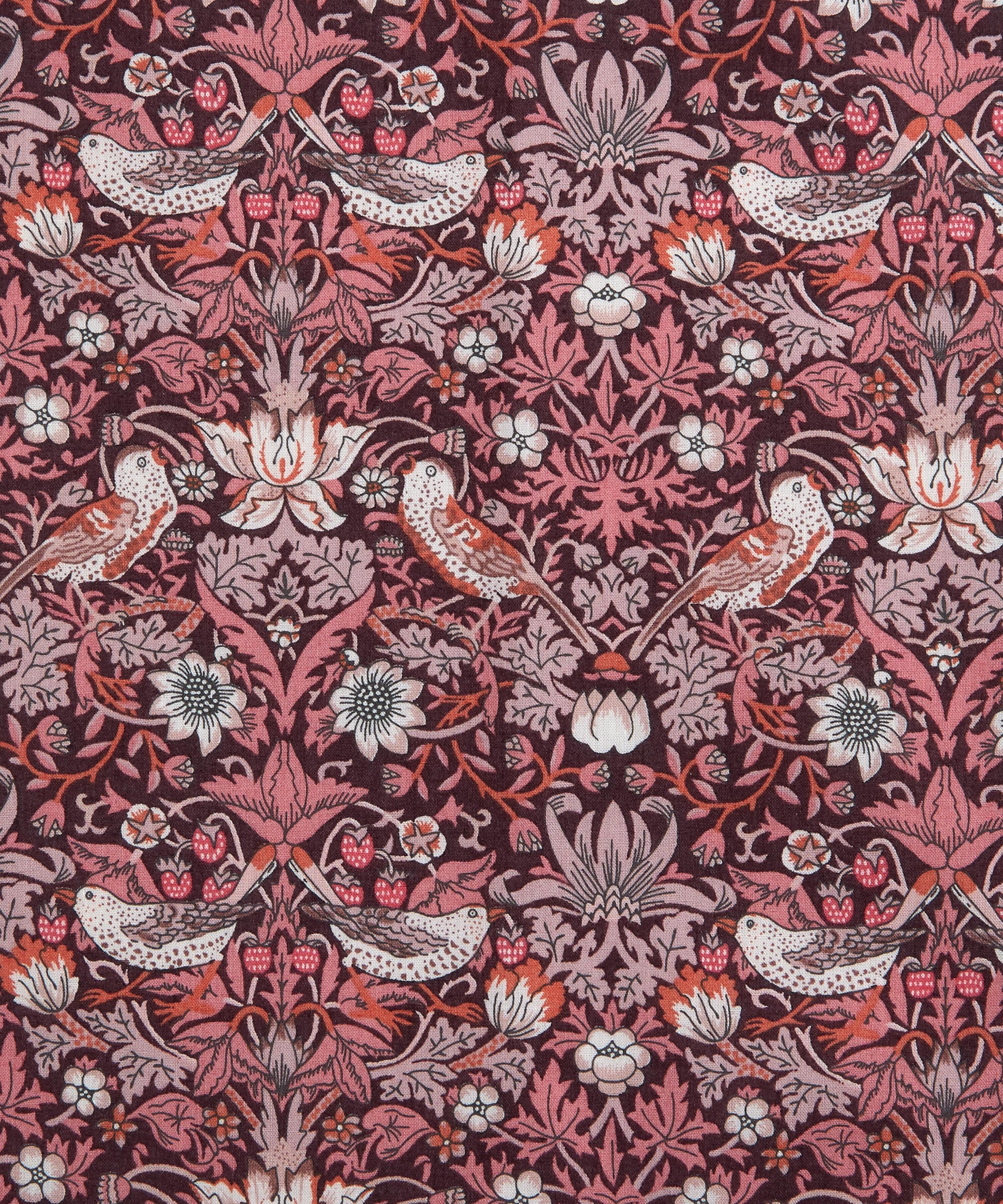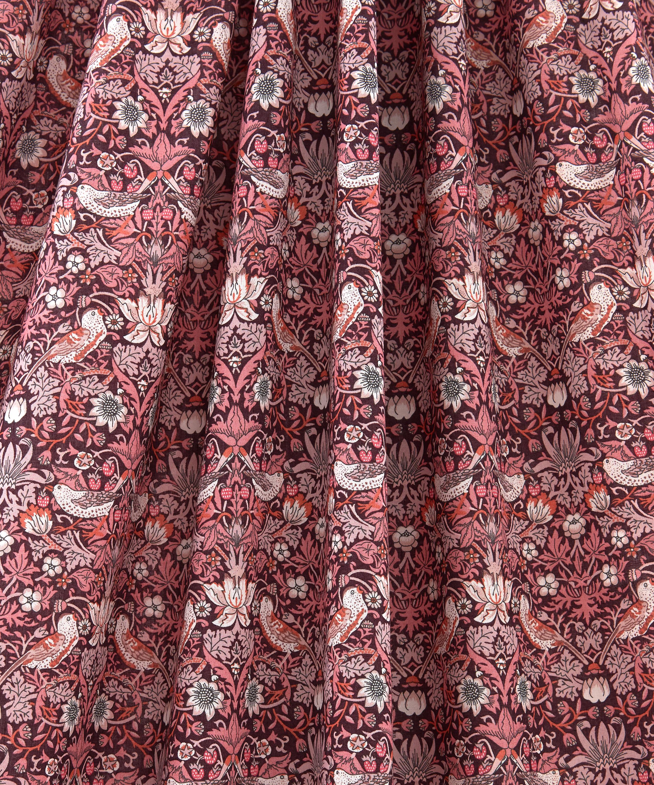 First printed by William Morris in 1883, Strawberry Thief was part of a group of designs incorporating animals with flowers. Introduced as a furnishing fabric for Liberty in 1979, it depicts birds stealing fruit within Morris’s Oxfordshire garden.