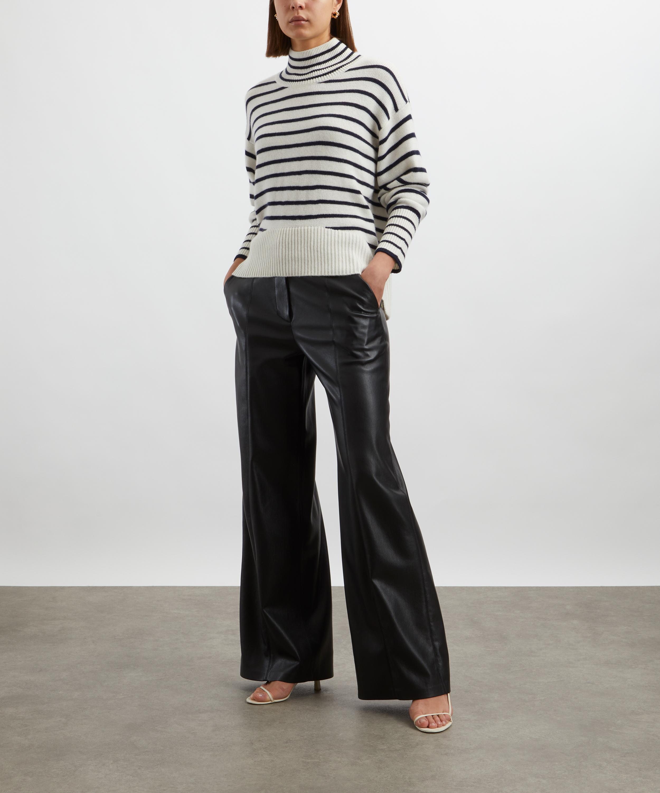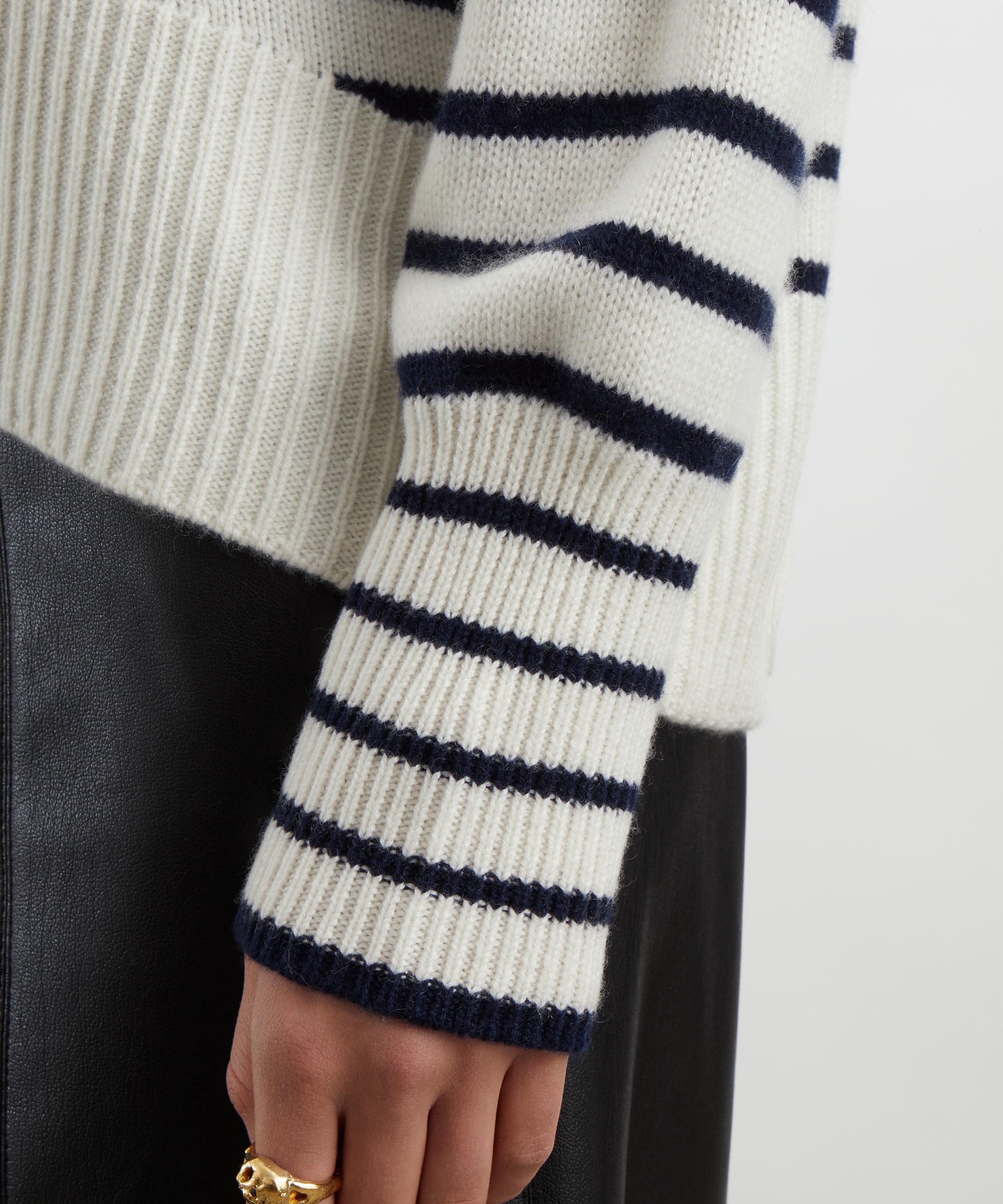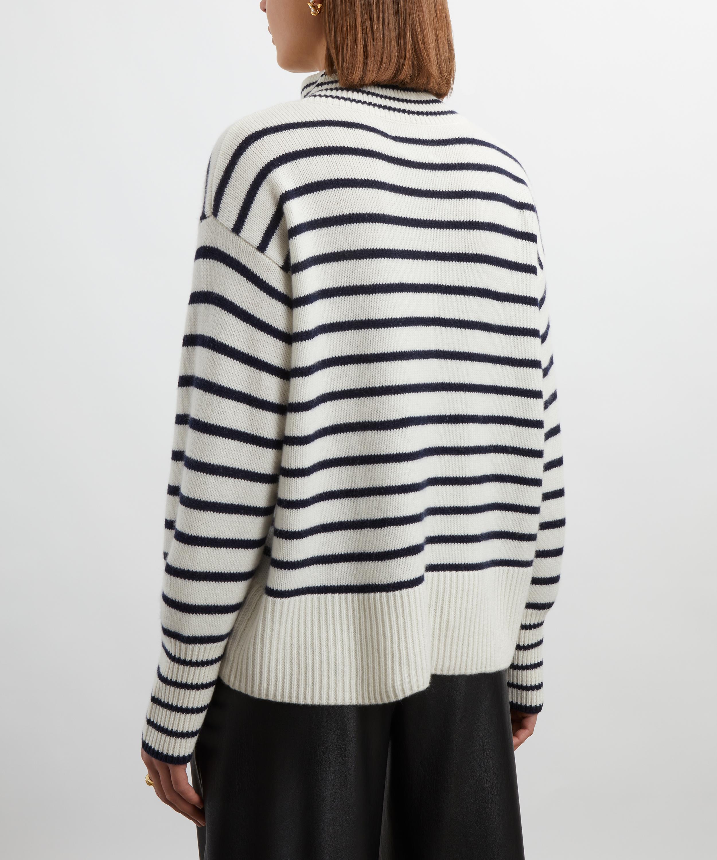 Knitted from pure cashmere with a classic Breton stripe, this turtleneck jumper is designed for a loose, relaxed fit with dropped shoulders and a curved front. Its minimalist yet cosy design makes it the perfect choice for the colder months ahead.