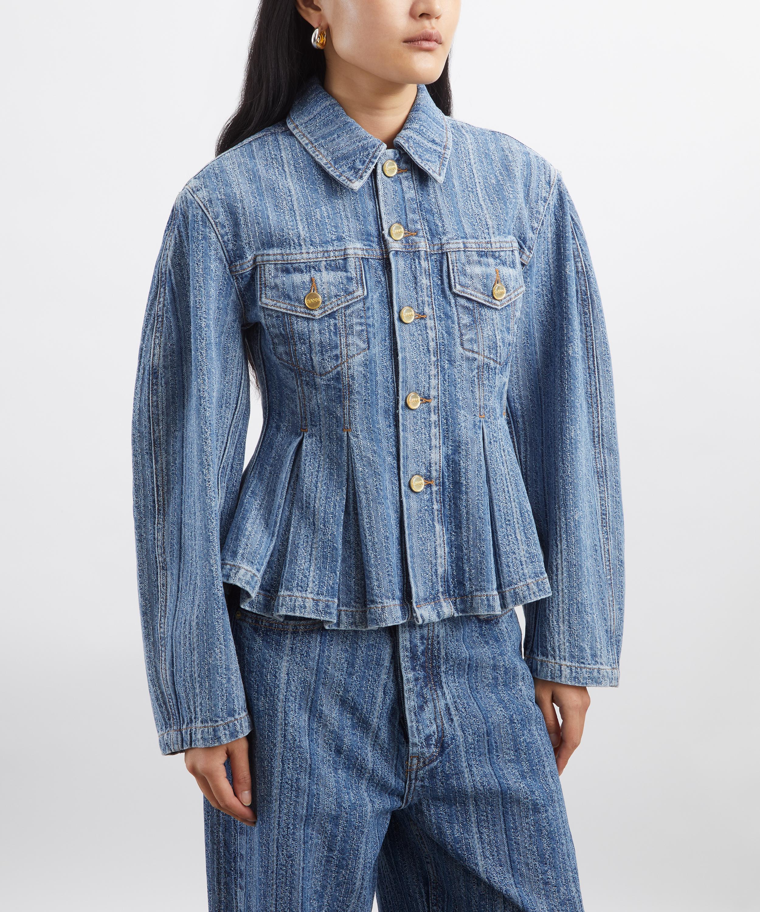 A contemporary take on a timeless classic, this jacket is cut from cotton denim with a striped texture, and features a classic collar, a buttoned front closure and two chest pockets. Pleat detailing at the waist adds structure, creating a playful silhouette with modern edge.