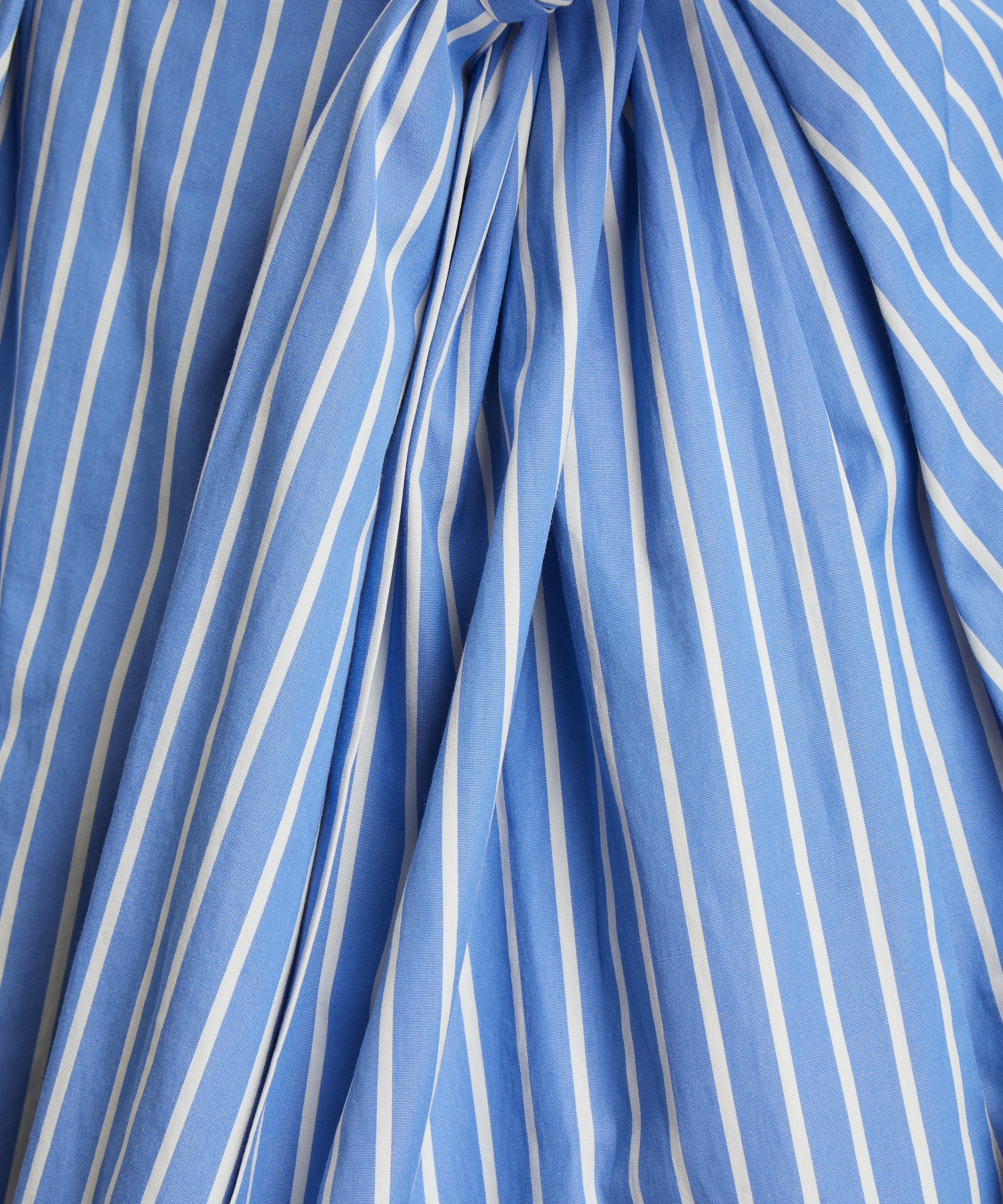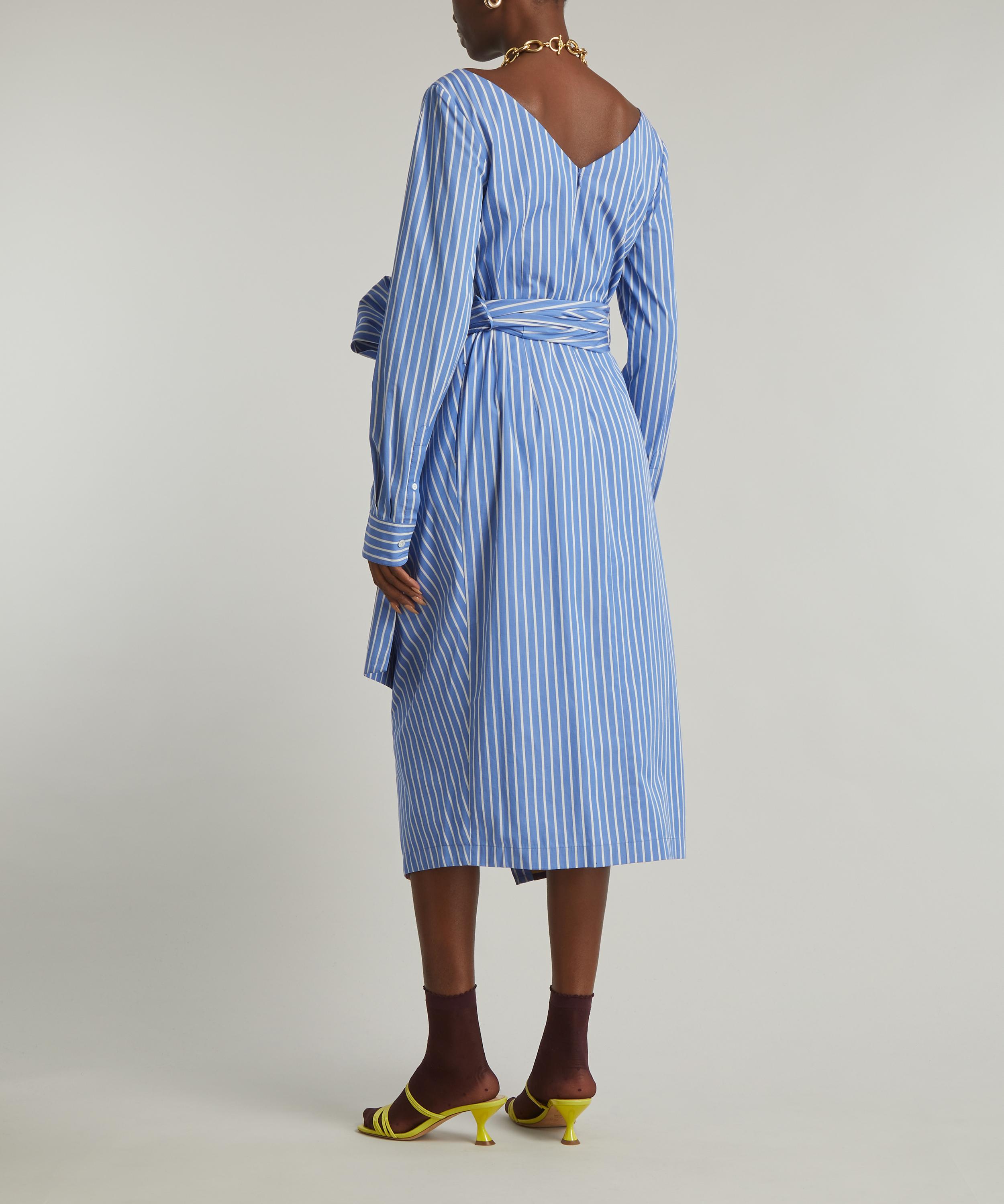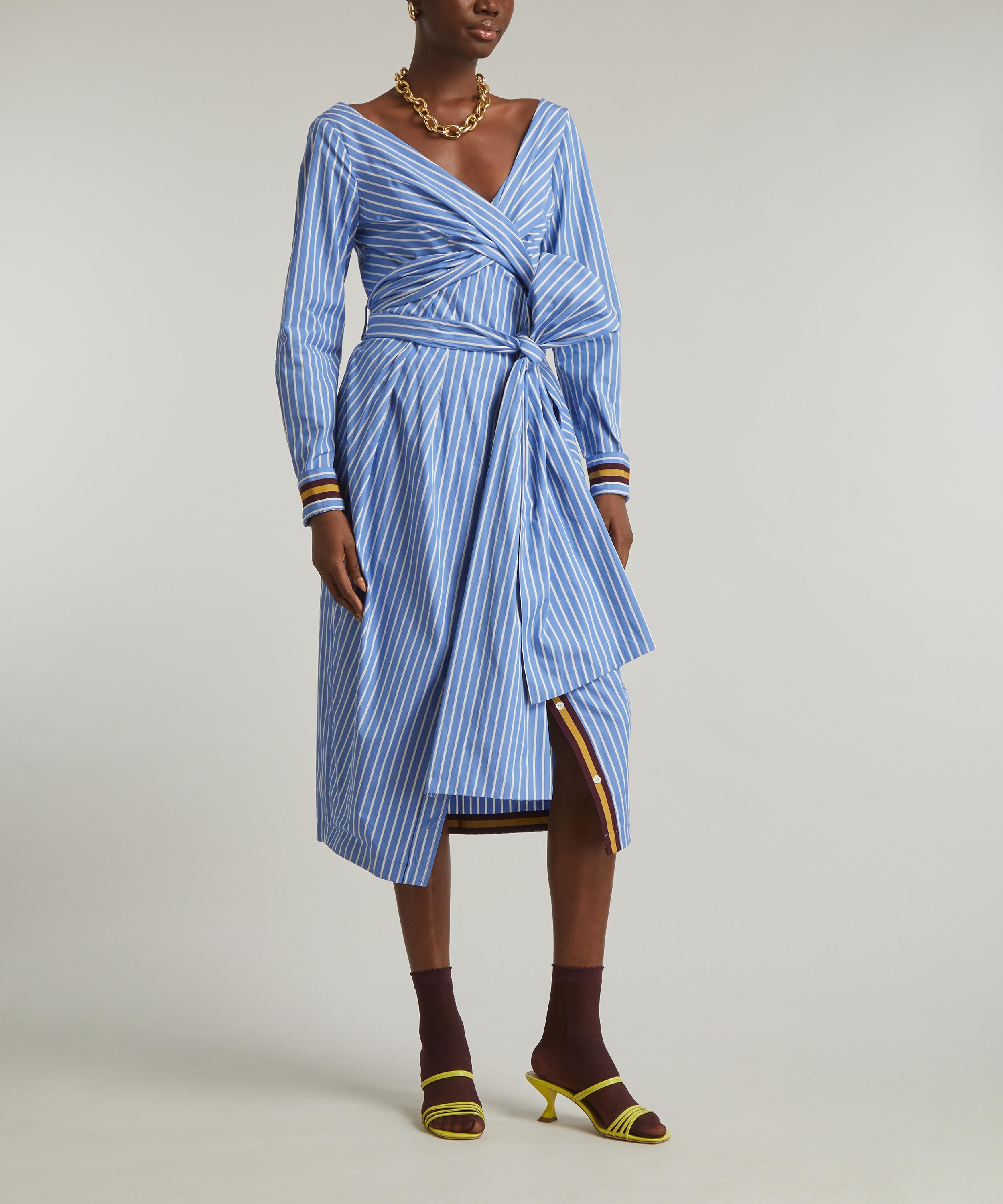 Draped in light blue stripes, this twisted wrap dress is entwined with a wrap-around self-tie fastening at the waist that can be fashioned into a bow. Complete with a plunging V-neckline and loose, long sleeves, its cuffs are lined with grosgrain trim for a tailored finish.