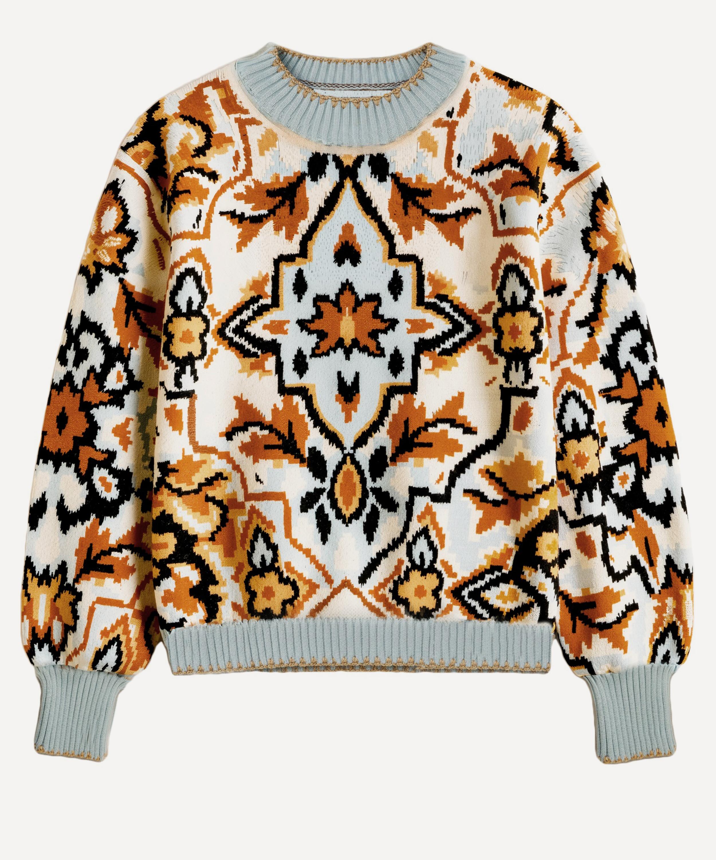 Embrace cosy elegance with this tapestry-inspired knit sweater, featuring a round neckline and voluminous puff sleeves. Intricate patterns in warm hues of cream, black, rust, and red weave together floral and abstract motifs, while a tailored silhouette and scalloped hem add playful refinement - perfect for stylish winter layering.