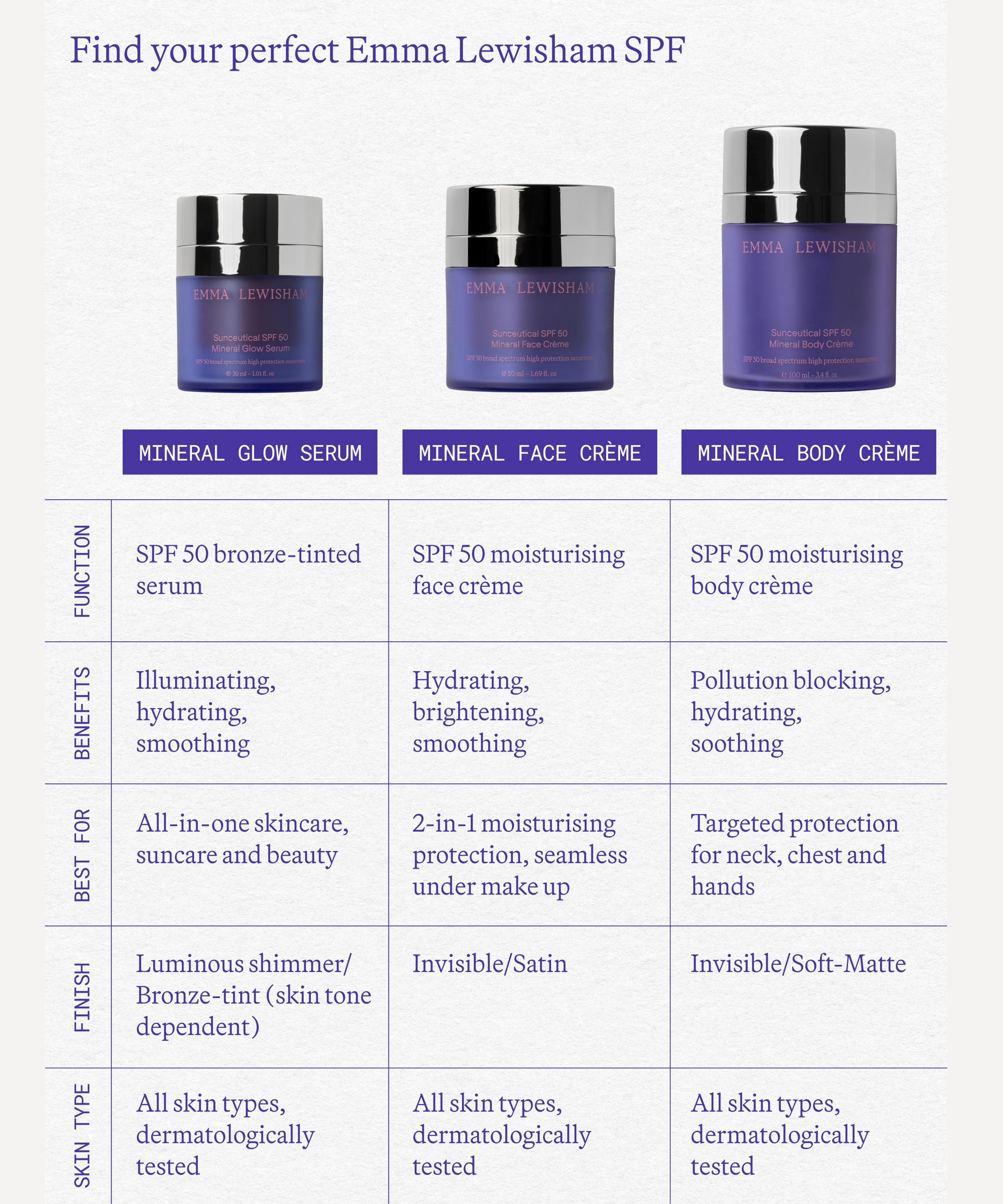 Bringing the benefits of scientifically-proven skin care ingredients to your daily suscreen, Emma Lewisham's Sunceutical SPF 50 Mineral Body Crème sumptuously melts into skin with a non-whitening, satin finish.